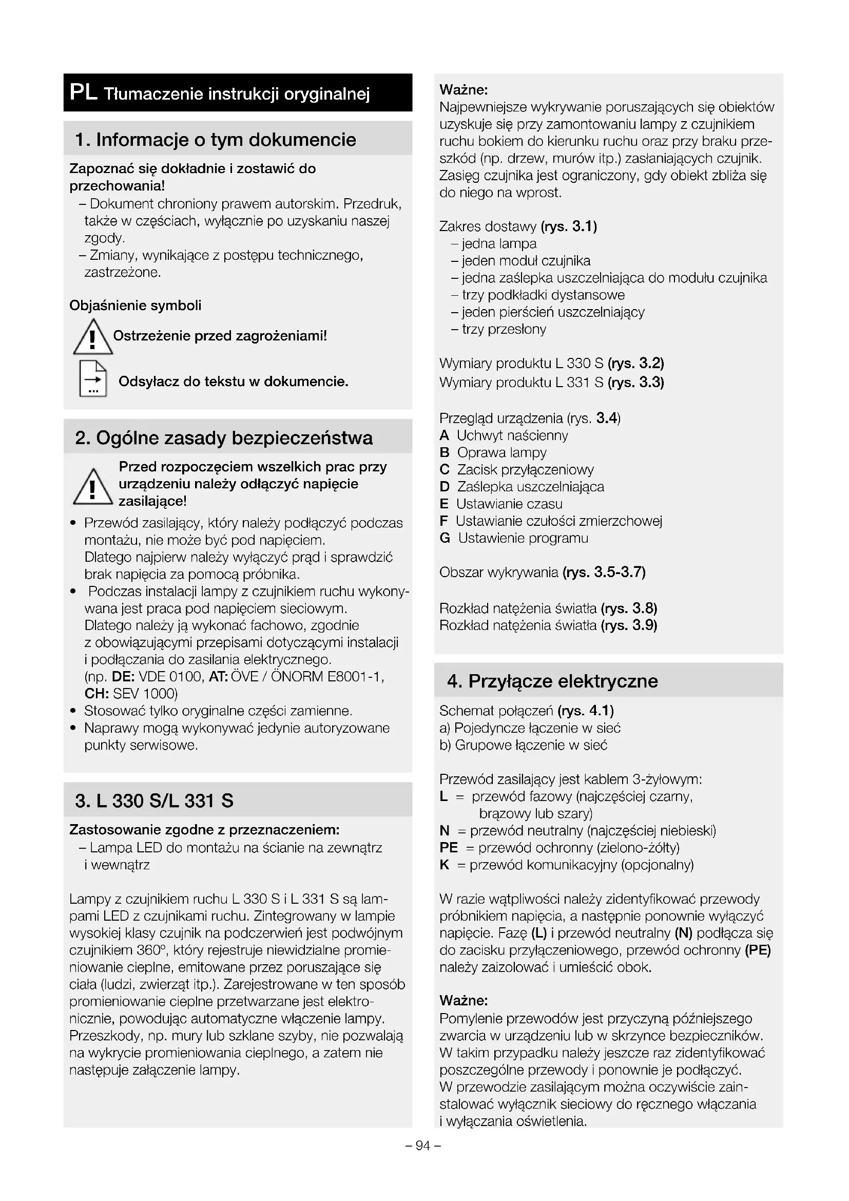 Zastosowanie zgodne zprzeznaczeniem: – Lampa LED do montażu na ścianie na zewnątrz iwewnątrzLampy z czujnikiem ruchu L330 S i L331 S są lam-pami LED z czujnikami ruchu. Zintegrowany wlampie wysokiej klasy czujnik na podczerwień jest podwójnym czujnikiem 360º, który rejestruje niewidzialne promie-niowanie cieplne, emitowane przez poruszające się ciała (ludzi, zwierząt itp.). Zarejestrowane wten sposób promieniowanie cieplne przetwarzane jest elektro-nicznie, powodując automatyczne włączenie lampy. Przeszkody, np. mury lub szklane szyby, nie pozwalają na wykrycie promieniowania cieplnego, azatem nie następuje załączenie lampy.Ważne: Najpewniejsze wykrywanie poruszających się obiektów uzyskuje się przy zamontowaniu lampy z czujnikiem ruchu bokiem do kierunku ruchu oraz przy braku prze-szkód (np. drzew, murów itp.) zasłaniających czujnik. Zasięg czujnika jest ograniczony, gdy obiekt zbliża się do niego na wprost.Zakres dostawy (rys.3.1) – jedna lampa – jeden moduł czujnika – jedna zaślepka uszczelniająca do modułu czujnika – trzy podkładki dystansowe – jeden pierścień uszczelniający – trzy przesłony Wymiary produktu L330 S (rys.3.2)Wymiary produktu L331 S (rys.3.3)Przegląd urządzenia (rys.3.4)A Uchwyt naściennyB Oprawa lampyC Zacisk przyłączeniowyD Zaślepka uszczelniającaE Ustawianie czasuF Ustawianie czułości zmierzchowejG Ustawienie programuObszar wykrywania (rys.3.5-3.7)Rozkład natężenia światła (rys. 3.8)Rozkład natężenia światła (rys. 3.9)