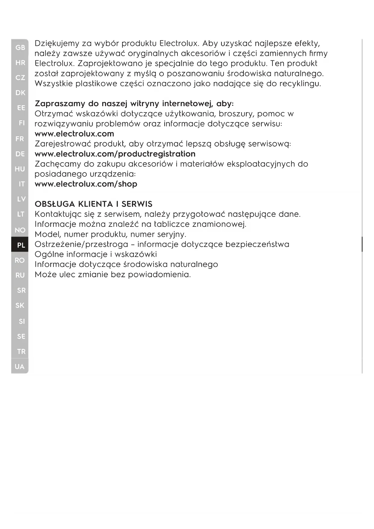 Dziękujemy za wybór produktu Electrolux. Aby uzyskać najlepsze efekty, należy zawsze używać oryginalnych akcesoriów i części zamiennych firmy Electrolux. Zaprojektowano je specjalnie do tego produktu. Ten produkt został zaprojektowany z myślą o poszanowaniu środowiska naturalnego. Wszystkie plastikowe części oznaczono jako nadające się do recyklingu. Zapraszamy do naszej witryny internetowej, aby: Otrzymać wskazówki dotyczące użytkowania, broszury, pomoc w rozwiązywaniu problemów oraz informacje dotyczące serwisu: www.electrolux.com Zarejestrować produkt, aby otrzymać lepszą obsługę serwisową: www.electrolux.com/productregistration Zachęcamy do zakupu akcesoriów i materiałów eksploatacyjnych do posiadanego urządzenia: www.electrolux.com/shop
