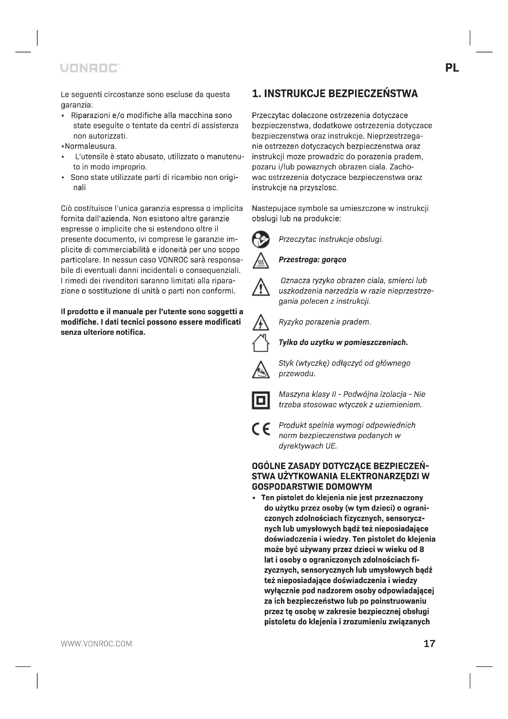 - Użyto części zamiennych innych niż oryginalne. Niniejsza gwarancja to wyłączna gwarancja produ- centa i nie obowiązują żadne inne wyrażone ani do- rozumiane gwarancje. Nie obowiązują żadne inne wyrażone ani dorozumiane gwarancje o zakresie przekraczającym niniejszą gwarancję, co obejmuje dorozumiane gwarancje przydatności do sprzedaży i przydatności do określonego celu. W żadnym przy- padku firma VONROC nie ponosi odpowiedzialności za straty przypadkowe lub wynikowe. Zadośćuczy- nienie sprzedawcy jest ograniczone do naprawy lub wymiany niezgodnych urządzeń lub części. Produkt i instrukcja obsługi podlegają zmianom. Dane techniczne podlegają zmianom bez uprze- dzenia.WWW.VONROC.COM
