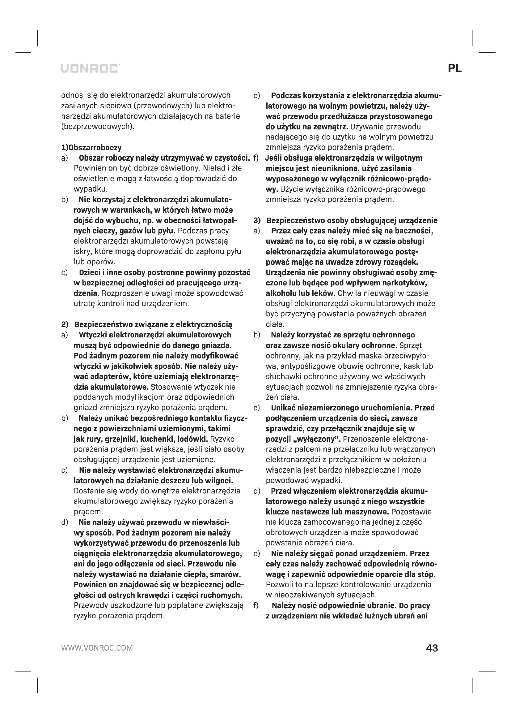 a) Wtyczki elektronarzędzi akumulatorowych muszą być odpowiednie do danego gniazda. Pod żadnym pozorem nie należy modyfikować wtyczki w jakikolwiek sposób. Nie należy uży- wać adapterów, które uziemiają elektronarzę- dzia akumulatorowe. Stosowanie wtyczek nie poddanych modyfikacjom oraz odpowiednich gniazd zmniejsza ryzyko porażenia prądem. b) Należy unikać bezpośredniego kontaktu fizycz- nego z powierzchniami uziemionymi, takimi jak rury, grzejniki, kuchenki, lodówki. Ryzyko porażenia prądem jest większe, jeśli ciało osoby obsługującej urządzenie jest uziemione. c) Nie należy wystawiać elektronarzędzi akumu- latorowych na działanie deszczu lub wilgoci. Dostanie się wody do wnętrza elektronarzędzia akumulatorowego zwiększy ryzyko porażenia prądem. d) Nie należy używać przewodu w niewłaści- wy sposób. Pod żadnym pozorem nie należy wykorzystywać przewodu do przenoszenia lub ciągnięcia elektronarzędzia akumulatorowego, ani do jego odłączania od sieci. Przewodu nie należy wystawiać na działanie ciepła, smarów. Powinien on znajdować się w bezpiecznej odle- głości od ostrych krawędzi i części ruchomych. Przewody uszkodzone lub poplątane zwiększają ryzyko porażenia prądem. e) Podczas korzystania z elektronarzędzia akumu- latorowego na wolnym powietrzu, należy uży- wać przewodu przedłużacza przystosowanego do użytku na zewnątrz. Używanie przewodu nadającego się do użytku na wolnym powietrzu zmniejsza ryzyko porażenia prądem. f) Jeśli obsługa elektronarzędzia w wilgotnym miejscu jest nieunikniona, użyć zasilania wyposażonego w wyłącznik różnicowo-prądo- wy. Użycie wyłącznika różnicowo-prądowego zmniejsza ryzyko porażenia prądem.
