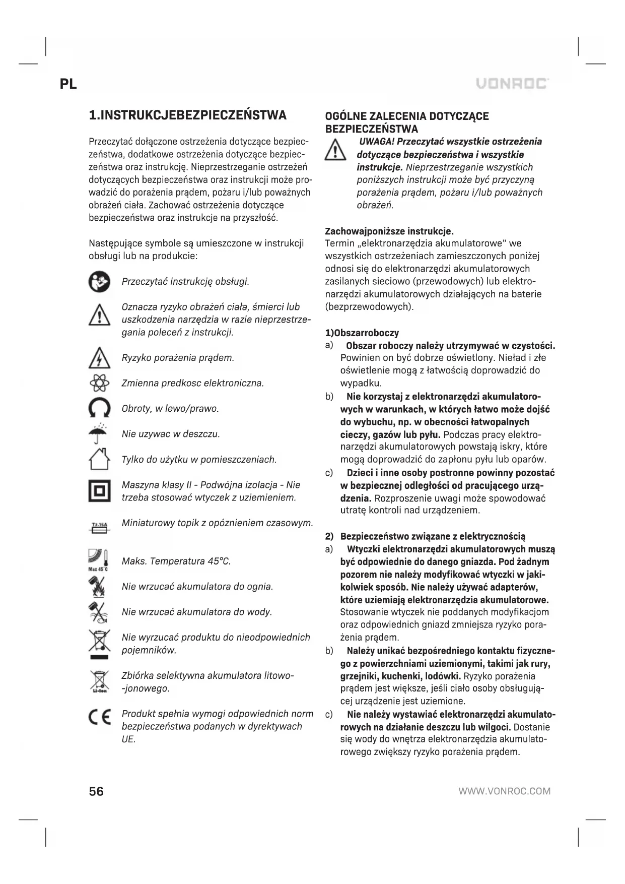 Przed rozpoczeciem czyszczenia i konser- wacji zawsze wylaczac maszyne i wyjmo- wac z niej akumulator. Czyscic obudowe maszyny regularnie miekka scie- reczka, najlepiej po kazdym uzyciu. Dopilnowac, aby otwory wentylacyjne byly wolne od pylu, kurzu i zabrudzen. Usuwac oporne zabrudzenia miekka sciereczka zwilzona mydlinami. Nie uzywac zad- nych rozpuszczalników, takich jak benzyna, alkohol, amoniak itp. Takie substancje chemiczne spowodu- ja uszkodzenie czesci z tworzyw sztucznych. SRODOWISKO Uszkodzone i/lub niepotrzebne urzadzenia elektryczne lub elektroniczne podlegaja zbiórce w odpowiednich punktach recyklingu. Tylko kraje WE Nie wyrzucac elektronarzedzi wraz z odpadami z gospodarstw domowych. Zgodnie z dyrektywa 2012/19/WE dotyczaca zuzytych urzadzen elek- trycznych i elektronicznych oraz jej wdrozeniem do prawodawstwa krajowego, elektronarzedzia, które juz nie nadaja sie do uzytku, podlegaja oddziel- nej zbiórce oraz utylizacji w sposób przyjazny dla srodowiska. GWARANCJA Produkty VONROC są wytwarzane zgodnie z naj- wyższymi standardami jakości i producent udziela gwarancji na wady materiałowe i wady wykonania na okres wymagany prawem, licząc od dnia zaku- pu. Jeśli wystąpi usterka produktu w tym okresie spowodowana wadą materiałową i/lub wadą wykonania, proszę bezpośrednio skontaktować się ze sprzedawcą VONROC. Następujące okoliczności powodują unieważnienie gwarancji: