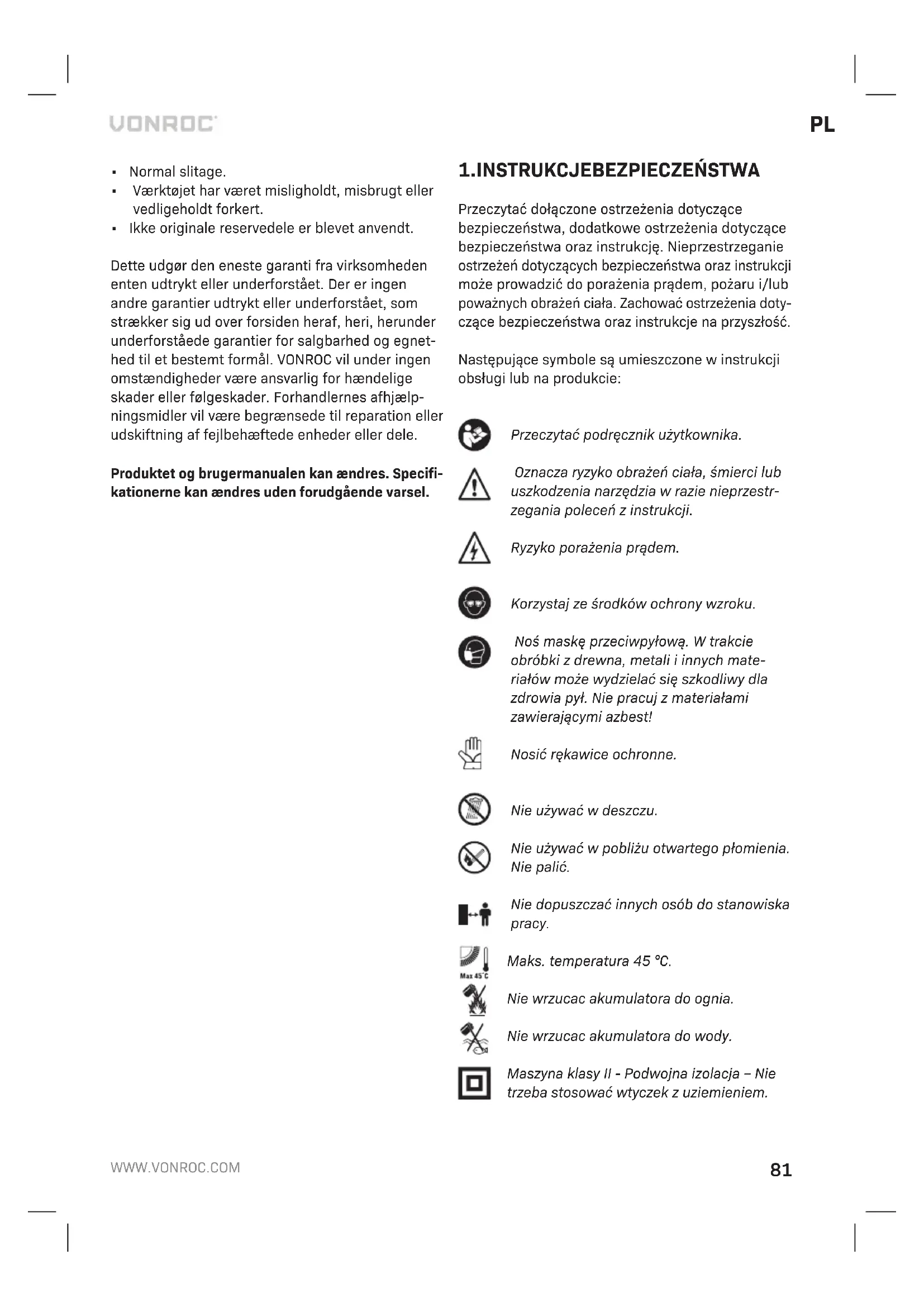 - Użyto części zamiennych innych niż oryginalne. Niniejsza gwarancja to wyłączna gwarancja produ- centa i nie obowiązują żadne inne wyrażone ani do- rozumiane gwarancje. Nie obowiązują żadne inne wyrażone ani dorozumiane gwarancje o zakresie przekraczającym niniejszą gwarancję, co obejmuje dorozumiane gwarancje przydatności do sprzedaży i przydatności do określonego celu. W żadnym przy- padku firma VONROC nie ponosi odpowiedzialności za straty przypadkowe lub wynikowe. Zadośćuczy- nienie sprzedawcy jest ograniczone do naprawy lub wymiany niezgodnych urządzeń lub części. Produkt i instrukcja obsługi podlegają zmianom. Dane techniczne podlegają zmianom bez uprzedzenia.