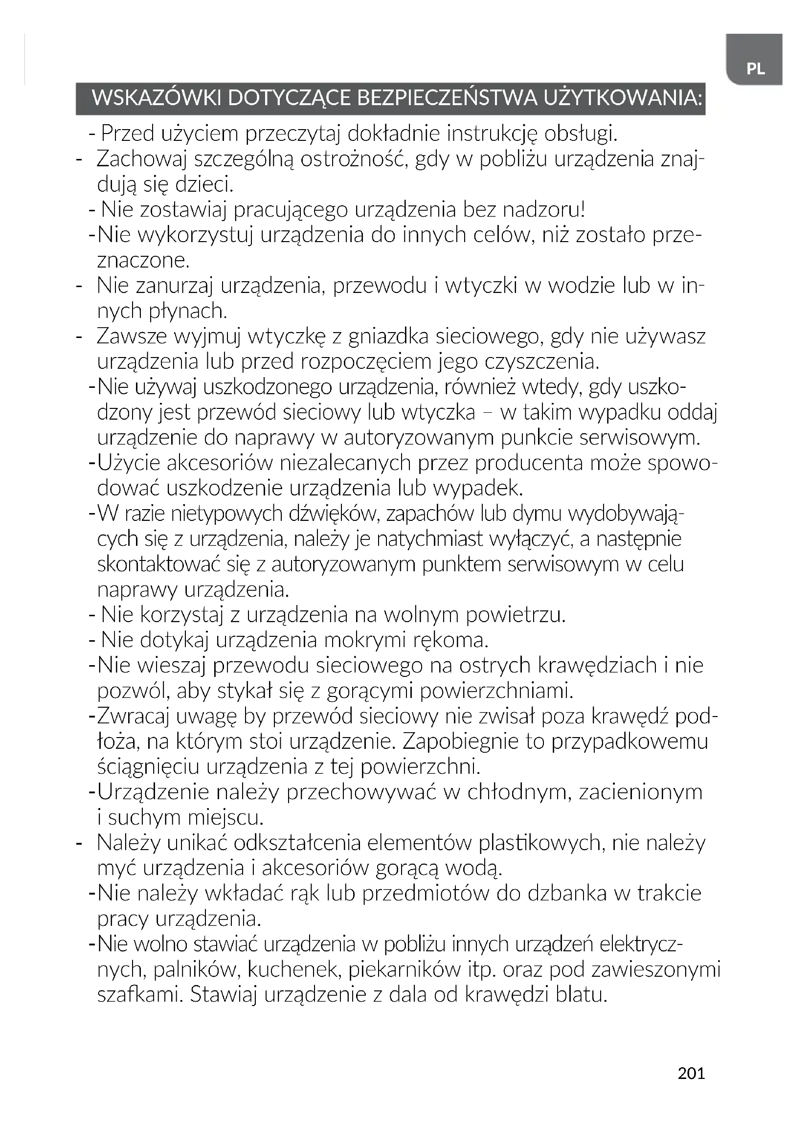 WSKAZÓWKI DOTYCZĄCE BEZPIECZEŃSTWA UŻYTKOWANIA: - Przed użyciem przeczytaj dokładnie instrukcję obsługi. - Zachowaj szczególną ostrożność, gdy w pobliżu urządzenia znaj