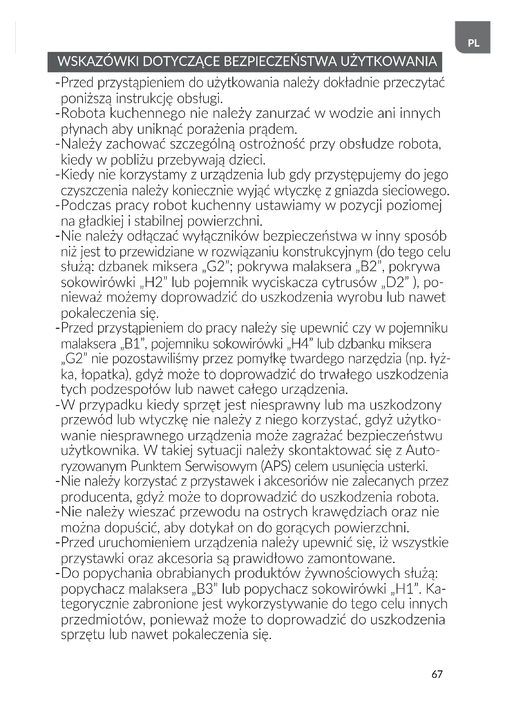 Nie należy odłączać wyłączników bezpieczeństwa w inny sposób niż jest to przewidziane w rozwiązaniu konstrukcyjnym (do tego celu służą: dzbanek miksera „G2”; pokrywa malaksera „B2”, pokrywa sokowirówki „H2” lub pojemnik wyciskacza cytrusów „D2” ), po- nieważ możemy doprowadzić do uszkodzenia wyrobu lub nawet pokaleczenia się.