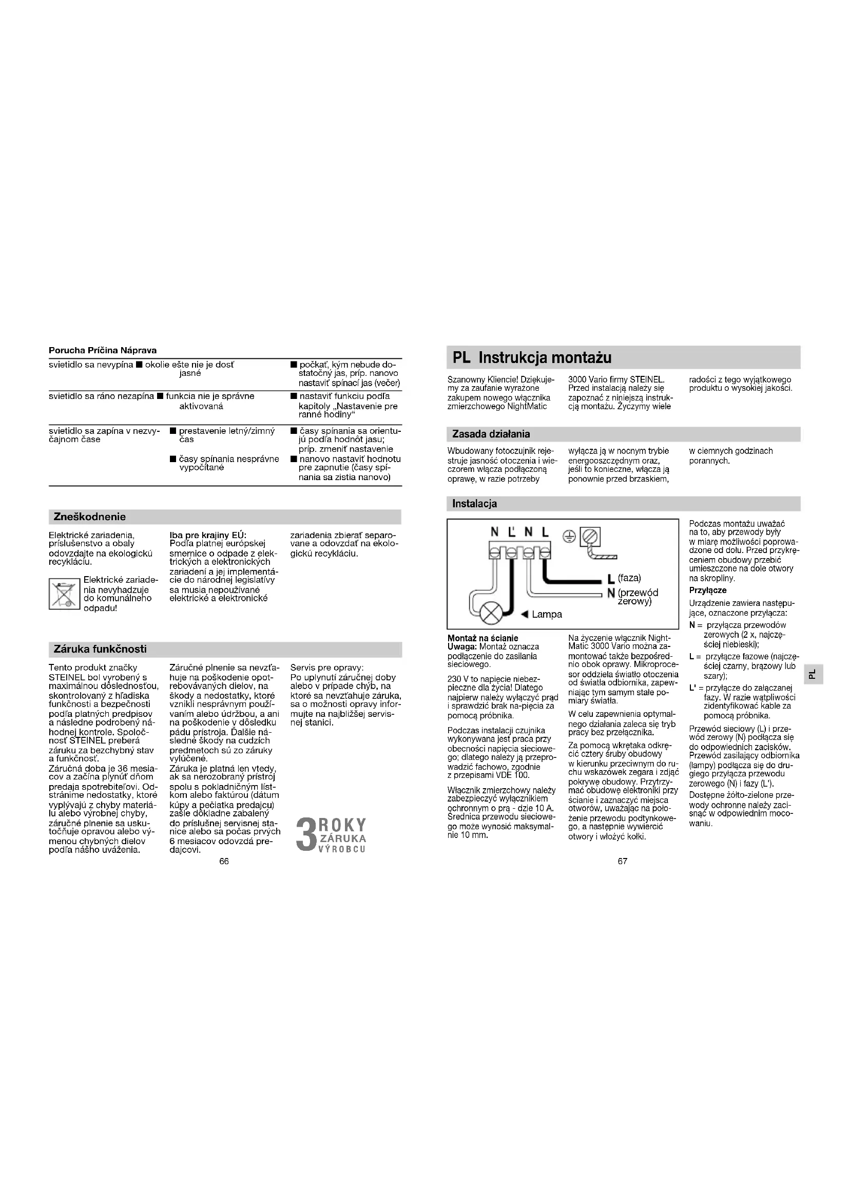 PL Instrukcja montażu Szanowny Kliencie! Dziękuje-my za zaufanie wyrażone zakupem nowego włącznika zmierzchowego NightMatic 3000 Vario firmy STEINEL. Przed instalacją należy się zapoznać zniniejszą instruk-cją montażu. Życzymy wiele radości ztego wyjątkowego produktu owysokiej jakości.Wbudowany fotoczujnik reje-struje jasność otoczenia iwie-czorem włącza podłączoną oprawę, wrazie potrzeby wyłącza ją wnocnym trybie energooszczędnym oraz, jeśli to konieczne, włącza ją ponownie przed brzaskiem, wciemnych godzinach porannych.Montaż na ścianie Uwaga: Montaż oznacza podłączenie do zasilania sieciowego. 230 V to napięcie niebez-pieczne dla życia! Dlatego najpierw należy wyłączyć prąd i sprawdzić brak na-pięcia za pomocą próbnika. Podczas instalacji czujnika wykonywana jest praca przy obecności napięcia sieciowe-go; dlatego należy ją przepro-wadzić fachowo, zgodnie zprzepisami VDE100. Włącznik zmierzchowy należy zabezpieczyć wyłącznikiem ochronnym oprą - dzie10A. Średnica przewodu sieciowe-go może wynosić maksymal-nie 10mm.Na życzenie włącznik Night-Matic 3000 Vario można za-montować także bezpośred-nio obok oprawy. Mikroproce-sor oddziela światło otoczenia od światła odbiornika, zapew-niając tym samym stałe po-miary światła. Wcelu zapewnienia optymal-nego działania zaleca się tryb pracy bez przełącznika. Za pomocą wkrętaka odkrę-cić cztery śruby obudowy wkierunku przeciwnym do ru-chu wskazówek zegara izdjąć pokrywę obudowy. Przytrzy-mać obudowę elektroniki przy ścianie izaznaczyć miejsca otworów, uważając na poło-żenie przewodu podtynkowe-go, anastępnie wywiercić otwory iwłożyć kołki.Podczas montażu uważać na to, aby przewody były wmiarę możliwości poprowa-dzone od dołu. Przed przykrę-ceniem obudowy przebić umieszczone na dole otwory na skropliny. Przyłącze Urządzenie zawiera następu-jące, oznaczone przyłącza: N = przyłącza przewodów zerowych (2 x, najczę-ściej niebieski); L = przyłącze fazowe (najczę-ściej czarny, brązowy lub szary); L' = przyłącze do załączanej fazy. Wrazie wątpliwości zidentyfikować kable za pomocą próbnika. Przewód sieciowy (L) iprze-wód zerowy (N) podłącza się do odpowiednich zacisków. Przewód zasilający odbiornika (lampy) podłącza się do dru-giego przyłącza przewodu zerowego (N) ifazy (L'). Dostępne żółto-zielone prze-wody ochronne należy zaci-snąć wodpowiednim moco-waniu. Zasada działania Instalacja Lampa(faza)(przewód zerowy)svietidlo sa nevypína n okolie ešte nie je dosť jasnén počkať, kým nebude do-statočný jas, príp. nanovo nastaviť spínací jas (večer)svietidlo sa ráno nezapína n funkcia nie je správne aktivovanán nastaviť funkciu podľa kapitoly „Nastavenie pre ranné hodiny“svietidlo sa zapína v nezvy-čajnom časen prestavenie letný/zimný čas n časy spínania nesprávne vypočítanén časy spínania sa orientu-jú podľa hodnôt jasu; príp. zmeniť nastavenie n nanovo nastaviť hodnotu pre zapnutie (časy spí-nania sa zistia nanovo)Tento produkt značky STEINEL bol vyrobený s maximálnou dôslednosťou, skontrolovaný z hľadiska funkčnosti a bezpečnosti podľa platných predpisov a následne podrobený ná-hodnej kontrole. Spoloč-nosť STEINEL preberá záruku za bezchybný stav a funkčnosť. Záručná doba je 36 mesia-cov a začína plynúť dňom predaja spotrebiteľovi. Od-stránime nedostatky, ktoré vyplývajú z chyby materiá-lu alebo výrobnej chyby, záručné plnenie sa usku-točňuje opravou alebo vý-menou chybných dielov podľa nášho uváženia.Záručné plnenie sa nevzťa-huje na poškodenie opot-rebovávaných dielov, na škody a nedostatky, ktoré vznikli nesprávnym použí-vaním alebo údržbou, a ani na poškodenie v dôsledku pádu prístroja. Ďalšie ná-sledné škody na cudzích predmetoch sú zo záruky vylúčené. Záruka je platná len vtedy, ak sa nerozobraný prístroj spolu s pokladničným líst-kom alebo faktúrou (dátum kúpy a pečiatka predajcu) zašle dôkladne zabalený do príslušnej servisnej sta-nice alebo sa počas prvých 6 mesiacov odovzdá pre-dajcovi.Servis pre opravy: Po uplynutí záručnej doby alebo v prípade chýb, na ktoré sa nevzťahuje záruka, sa o možnosti opravy infor-mujte na najbližšej servis-nej stanici. Záruka funkčnosti Porucha Príčina Náprava