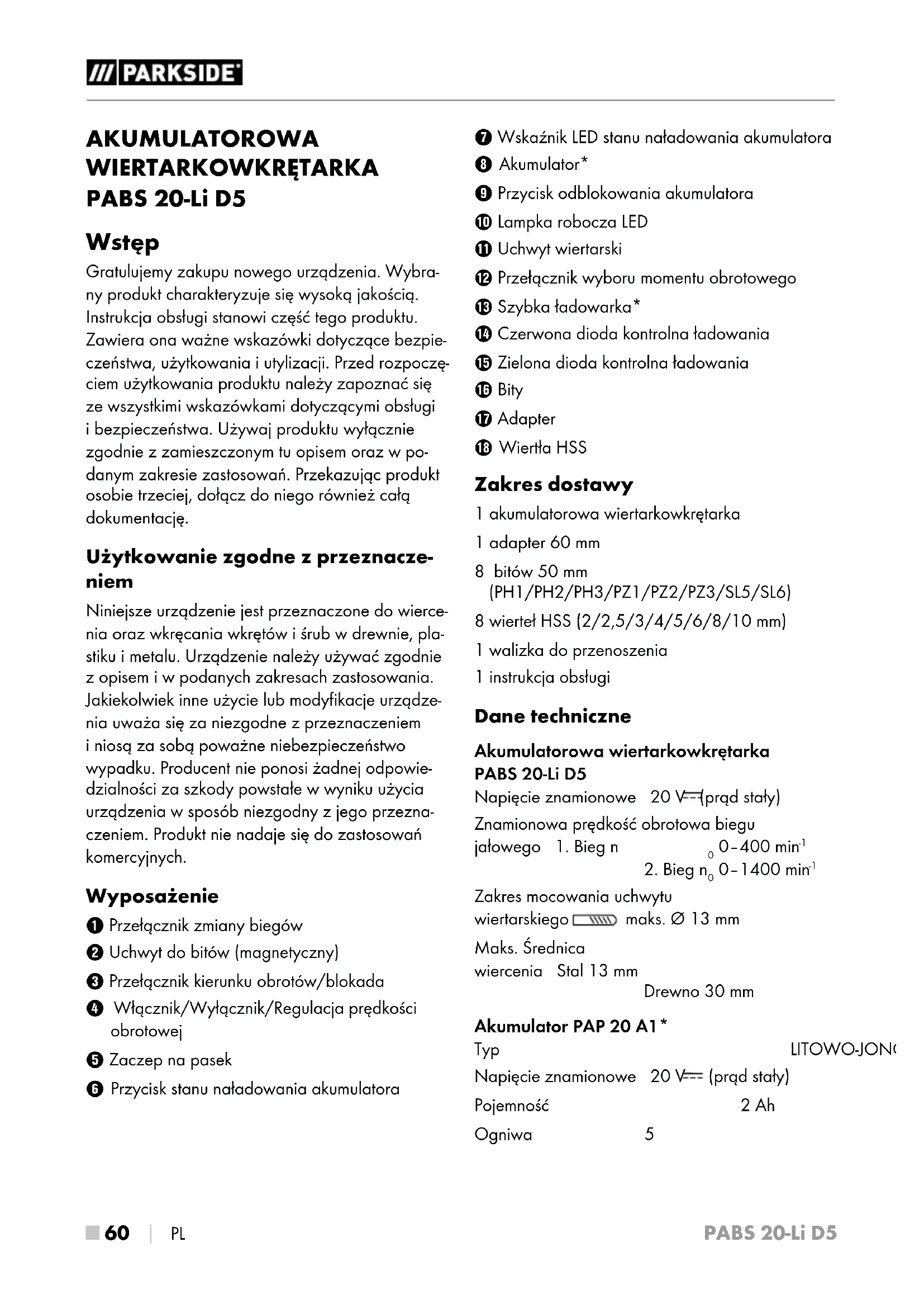 PL AKUMULATOROWA WIERTARKOWKRĘTARKA PABS 20-Li D5 Wstęp Gratulujemy zakupu nowego urządzenia. Wybra- ny produkt charakteryzuje się wysoką jakością. Instrukcja obsługi stanowi część tego produktu. Zawiera ona ważne wskazówki dotyczące bezpie- czeństwa, użytkowania iutylizacji. Przed rozpoczę- ciem użytkowania produktu należy zapoznać się ze wszystkimi wskazówkami dotyczącymi obsługi ibezpieczeństwa. Używaj produktu wyłącznie zgodnie zzamieszczonym tu opisem oraz wpo- danym zakresie zastosowań. Przekazując produkt osobie trzeciej, dołącz do niego również całą dokumentację. Użytkowanie zgodne zprzeznacze- niem Niniejsze urządzenie jest przeznaczone do wierce- nia oraz wkręcania wkrętów iśrub wdrewnie, pla- stiku imetalu. Urządzenie należy używać zgodnie zopisem iwpodanych zakresach zastosowania. Jakiekolwiek inne użycie lub modyfikacje urządze- nia uważa się za niezgodne zprzeznaczeniem iniosą za sobą poważne niebezpieczeństwo wypadku. Producent nie ponosi żadnej odpowie- dzialności za szkody powstałe wwyniku użycia urządzenia wsposób niezgodny zjego przezna- czeniem. Produkt nie nadaje się do zastosowań komercyjnych. Wyposażenie Przełącznik zmiany biegów Uchwyt do bitów (magnetyczny) Przełącznik kierunku obrotów/blokada Włącznik/Wyłącznik/Regulacja prędkości obrotowej Zaczep na pasek Przycisk stanu naładowania akumulatora Wskaźnik LED stanu naładowania akumulatora Akumulator* Przycisk odblokowania akumulatora Lampka robocza LED - Uchwyt wiertarski 3 Przełącznik wyboru momentu obrotowego ! Szybka ładowarka* . Czerwona dioda kontrolna ładowania 0 Zielona dioda kontrolna ładowania 6 Bity 1 Adapter %Wiertła HSS Zakres dostawy 1 akumulatorowa wiertarkowkrętarka 1 adapter 60 mm 8 bitów 50 mm (PH1/PH2/PH3/PZ1/PZ2/PZ3/SL5/SL6) 8 wierteł HSS (2/2,5/3/4/5/6/8/10 mm) 1 walizka do przenoszenia 1 instrukcja obsługi Dane techniczne Akumulatorowa wiertarkowkrętarka PABS 20-Li D5 Napięcie znamionowe 20V (prąd stały) Znamionowa prędkość obrotowa biegu jałowego 1. Bieg n