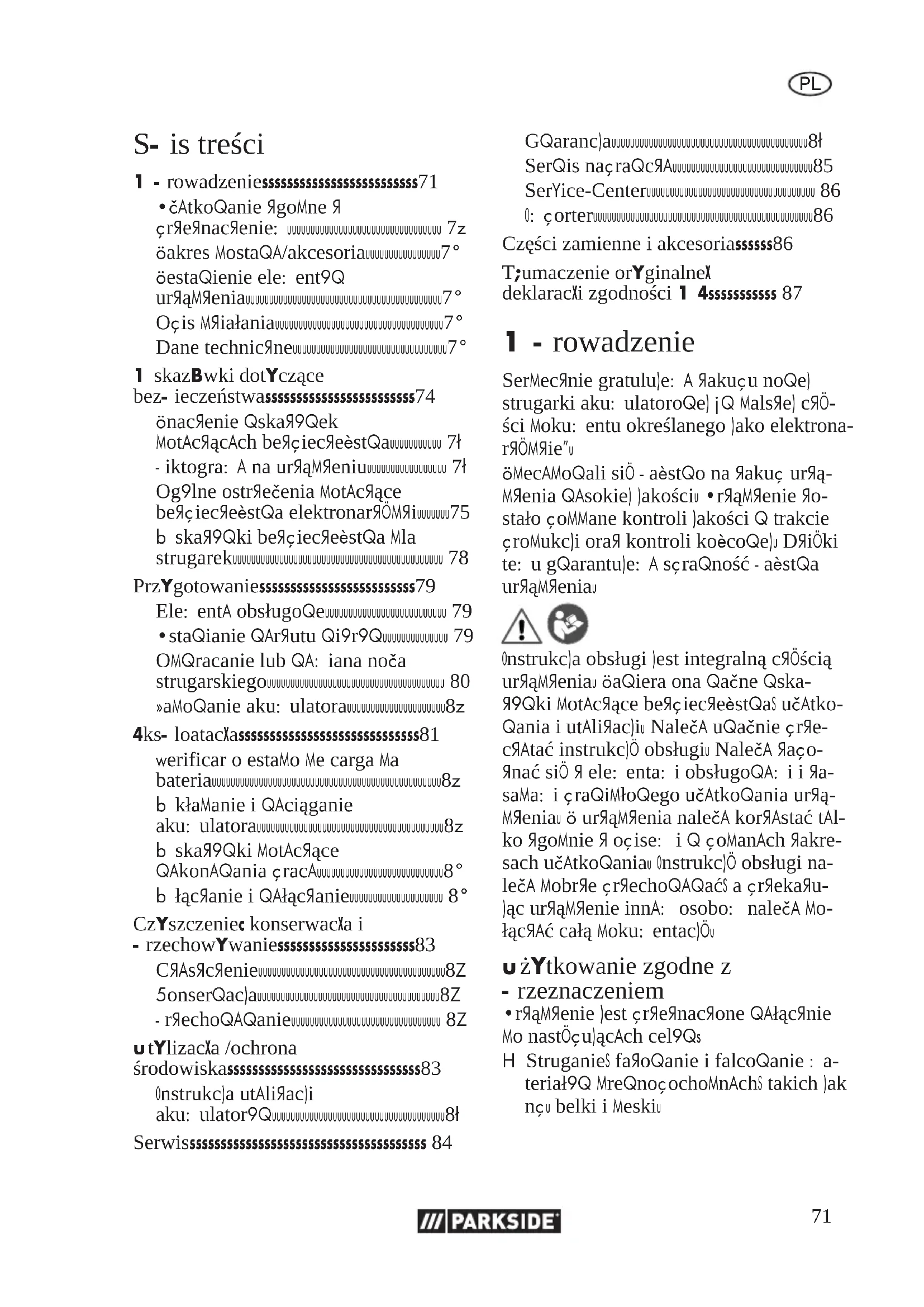- Tłumaczenie oryginalnej deklaracji zgodności WE Wprowadzenie Serdecznie gratulujemy zakupu nowej strugarki akumulatorowej (w dalszej czę- ści dokumentu określanego jako elektrona- rzędzie). Zdecydowali się Państwo na zakup urzą- dzenia wysokiej jakości. Urządzenie zo- stało poddane kontroli jakości w trakcie produkcji oraz kontroli końcowej. Dzięki temu gwarantujemy sprawność Państwa urządzenia. Instrukcja obsługi jest integralną częścią urządzenia. Zawiera ona ważne wska- zówki dotyczące bezpieczeństwa, użytko- wania i utylizacji. Należy uważnie prze- czytać instrukcję obsługi. Należy zapo- znać się z elementami obsługowymi i za- sadami prawidłowego użytkowania urzą- dzenia. Z urządzenia należy korzystać tyl- ko zgodnie z opisem i w podanych zakre- sach użytkowania. Instrukcję obsługi na- leży dobrze przechowywać, a przekazu- jąc urządzenie innym osobom należy do- łączyć całą dokumentację. Użytkowanie zgodne z przeznaczeniem Urządzenie jest przeznaczone wyłącznie do następujących celów: p. 87