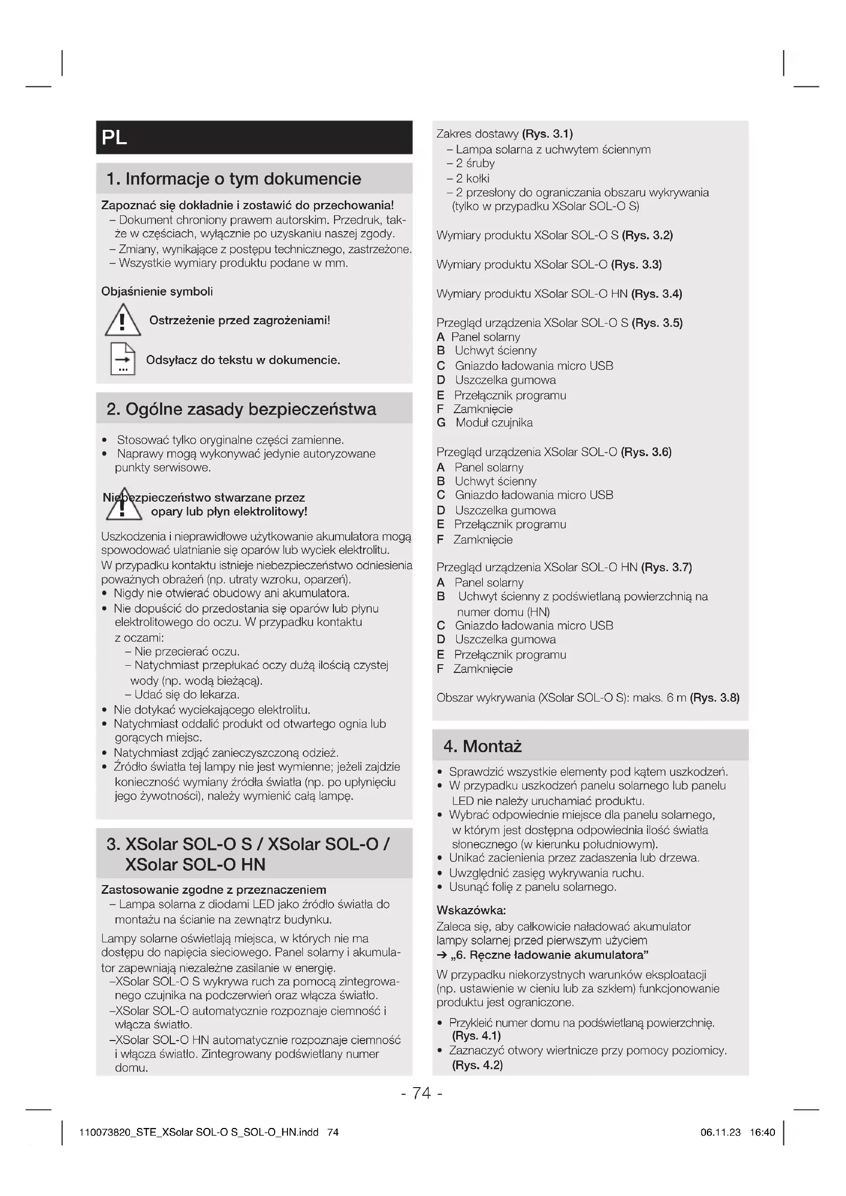 110073820_STE_XSolar SOL-O S_SOL-O_HN.indd 73110073820_STE_XSolar SOL-O S_SOL-O_HN.indd 73 06.11.23 16:4006.11.23 16:40- 74 - Zakres dostawy (Rys 31) – Lampa solarna z uchwytem ściennym – 2 śruby – 2 kołki – 2 przesłony do ograniczania obszaru wykrywania (tylko w przypadku XSolarSOL-OS) Wymiary produktu XSolarSOL-OS (Rys 32) Wymiary produktu XSolarSOL-O (Rys 33) Wymiary produktu XSolarSOL-OHN (Rys 34) Przegląd urządzenia XSolarSOL-OS (Rys 35) A Panel solarny B Uchwyt ścienny C Gniazdo ładowania micro USB D Uszczelka gumowa E Przełącznik programu F Zamknięcie G Moduł czujnika Przegląd urządzenia XSolarSOL-O (Rys 36) A Panel solarny B Uchwyt ścienny C Gniazdo ładowania micro USB D Uszczelka gumowa E Przełącznik programu F Zamknięcie Przegląd urządzenia XSolarSOL-OHN (Rys 37) A Panel solarny B Uchwyt ścienny z podświetlaną powierzchnią na numer domu (HN) C Gniazdo ładowania micro USB D Uszczelka gumowa E Przełącznik programu F Zamknięcie Obszar wykrywania (XSolarSOL-OS): maks. 6m (Rys 38) 4 Montaż