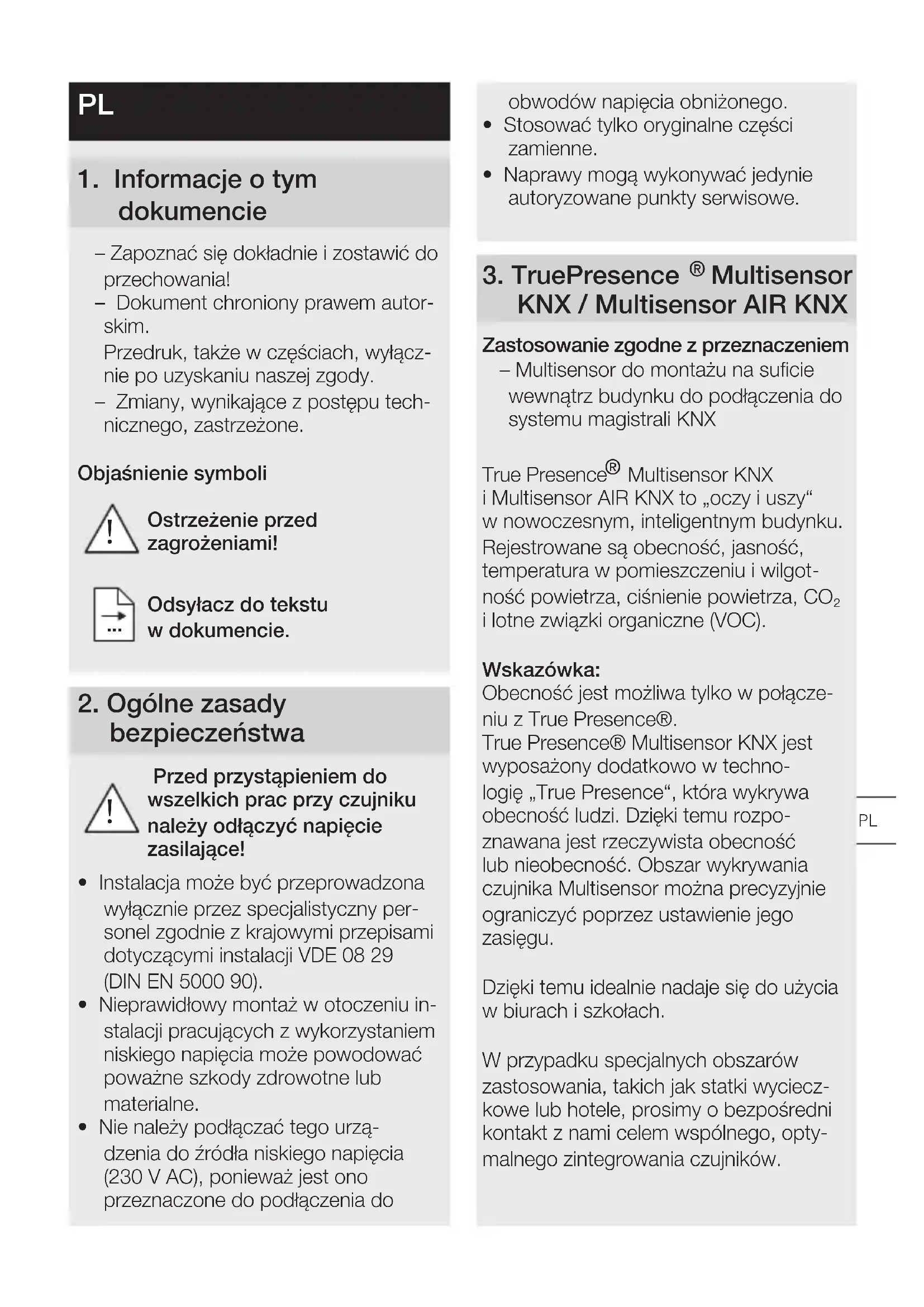 Multisensor KNX iMultisensor AIR KNX to „oczy i uszy“ wnowoczesnym, inteligentnym budynku. Rejestrowane są obecność, jasność, temperatura w pomieszczeniu i wilgot- ność powietrza, ciśnienie powietrza, CO₂ i lotne związki organiczne (VOC). Wskazówka: Obecność jest możliwa tylko w połącze- niu z True Presence®. True Presence® Multisensor KNX jest wyposażony dodatkowo w techno- logię „TruePresence“, która wykrywa obecność ludzi. Dzięki temu rozpo- znawana jest rzeczywista obecność lub nieobecność. Obszar wykrywania czujnika Multisensor można precyzyjnie ograniczyć poprzez ustawienie jego zasięgu. Dzięki temu idealnie nadaje się do użycia w biurach i szkołach. W przypadku specjalnych obszarów zastosowania, takich jak statki wyciecz- kowe lub hotele, prosimy o bezpośredni kontakt z nami celem wspólnego, opty- malnego zintegrowania czujników. PL– 112 –