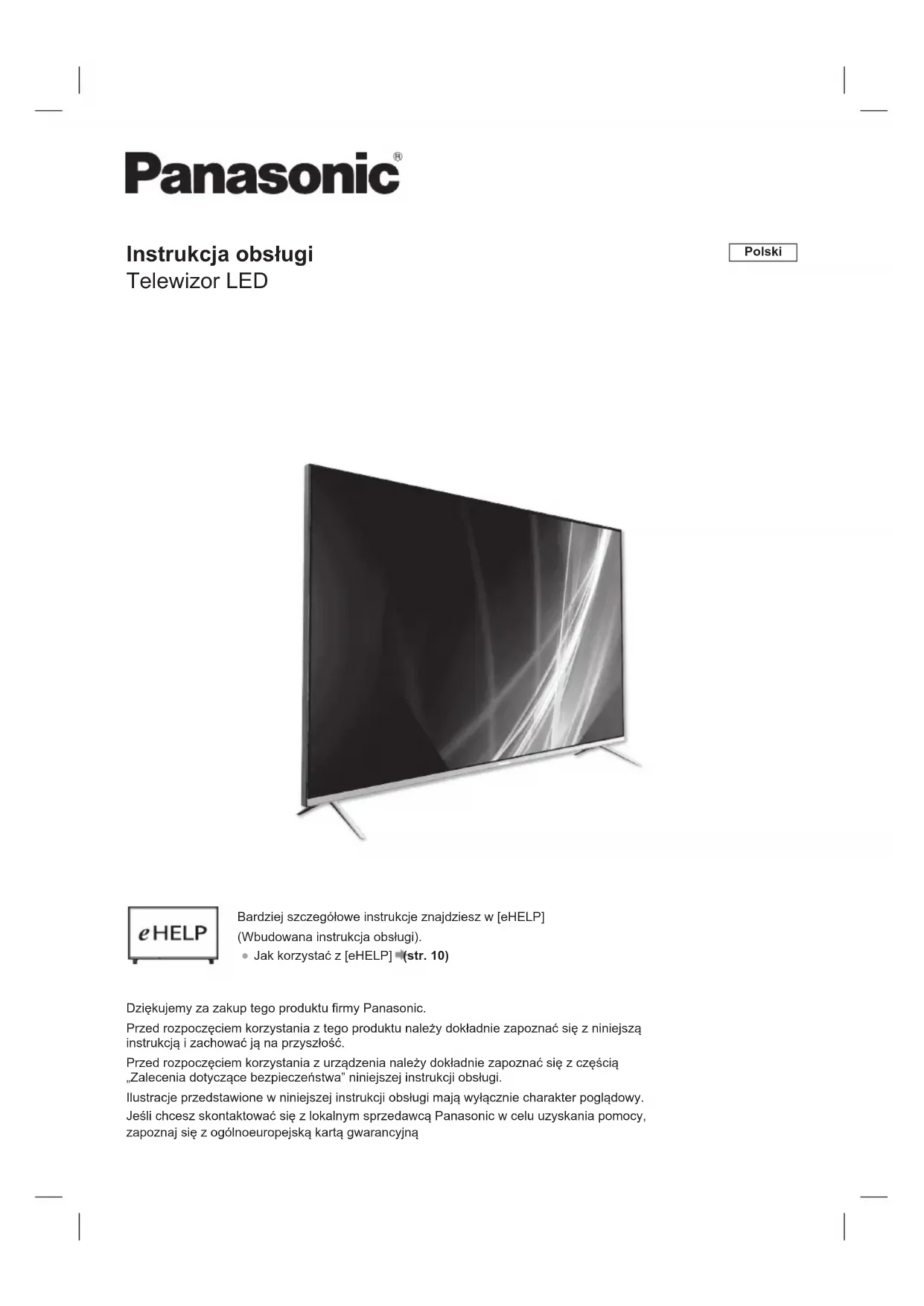 Zgodność z przyszłymi usługami nie jest gwarantowana Aplikacje internetowe są dostarczane przez odpowiednich dostawców usług i mogą zostać zmienione, przerwane lub wycofane w dowolnym momencie. Firma Panasonic nie ponosi żadnej odpowiedzialności i nie gwarantuje dostępności ani ciągłości usług. Firma Panasonic nie gwarantuje działania ani wydajności urządzeń peryferyjnych innych producentów. Ponadto firma Panasonic nie ponosi żadnej odpowiedzialności za jakiekolwiek uszkodzenia powstałe w wyniku korzystania z urządzeń peryferyjnych innych producentów. Obsługa informacji o kliencie W przypadku korzystania z funkcji połączenia internetowego tego telewizora, po zaakceptowaniu zasad świadczenia usług / zasad poufności (zwanych dalej warunkami), informacje o kliencie dotyczące korzystania z tego urządzenia mogą być gromadzone i wykorzystywane zgodnie z warunkami. Dane osobowe klienta mogą być zapisywane na tym telewizorze przez organizację nadawczą lub dostawcę aplikacji. Przed naprawą, przekazaniem lub wyrzuceniem tego telewizora należy usunąć wszystkie informacje zapisane w nim zgodnie z poniższą procedurą. [eHELP] (Wyszukiwanie przez Ustawienia > Przywracanie ustawień fabrycznych) Informacje o kliencie mogą być gromadzone przez dostawcę za pośrednictwem aplikacji udostępnionej przez strony trzecie na tym telewizorze lub stronie internetowej. Prosimy o wcześniejsze potwierdzenie warunków dostawcy.