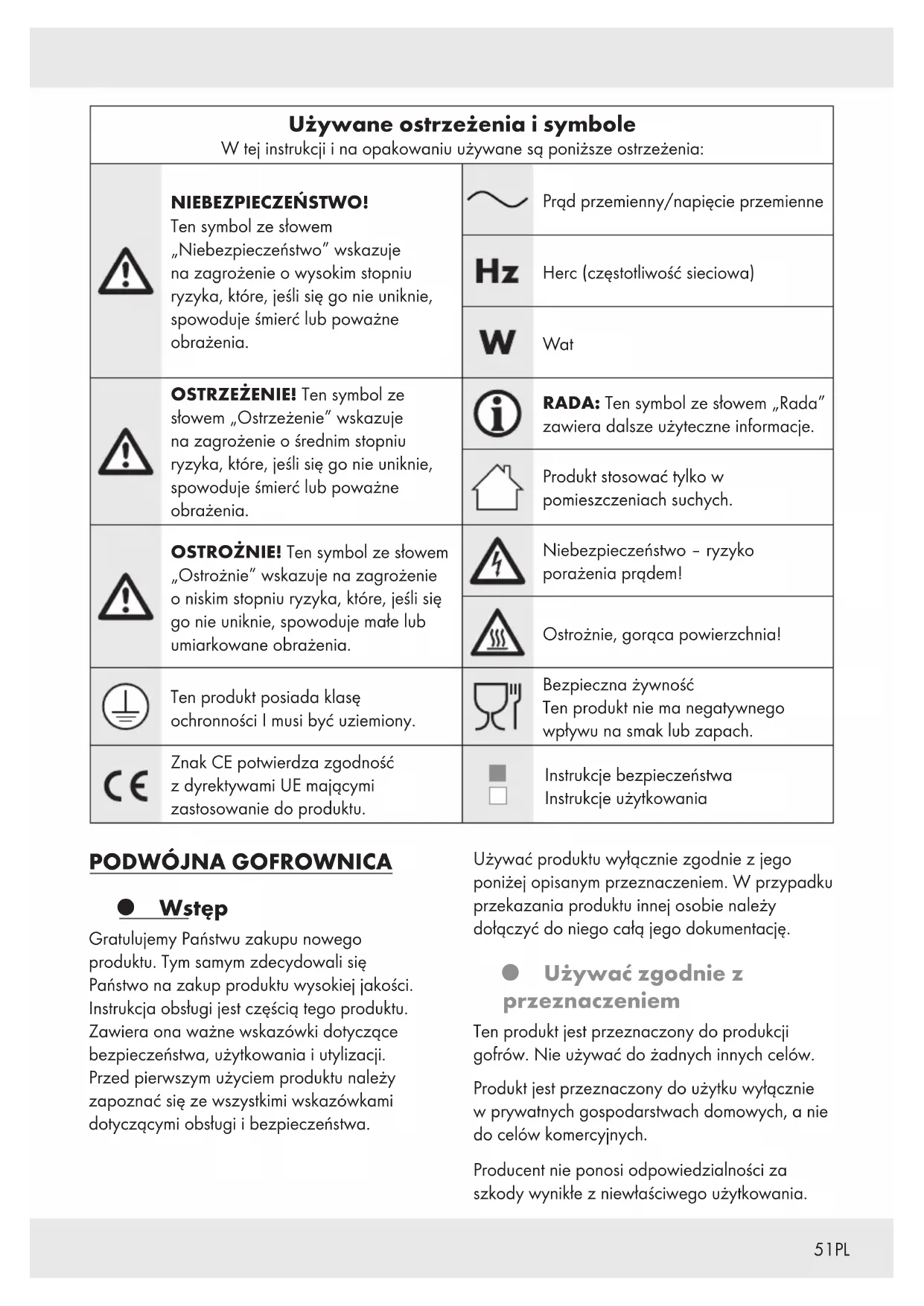 Wstęp Gratulujemy Państwu zakupu nowego produktu. Tym samym zdecydowali się Państwo na zakup produktu wysokiej jakości. Instrukcja obsługi jest częścią tego produktu. Zawiera ona ważne wskazówki dotyczące bezpieczeństwa, użytkowania i utylizacji. Przed pierwszym użyciem produktu należy zapoznać się ze wszystkimi wskazówkami dotyczącymi obsługi i bezpieczeństwa. Używać produktu wyłącznie zgodnie z jego poniżej opisanym przeznaczeniem. W przypadku przekazania produktu innej osobie należy dołączyć do niego całą jego dokumentację. Używać zgodnie z przeznaczeniem Ten produkt jest przeznaczony do produkcji gofrów. Nie używać do żadnych innych celów. Produkt jest przeznaczony do użytku wyłącznie w prywatnych gospodarstwach domowych, a nie do celów komercyjnych. Producent nie ponosi odpowiedzialności za szkody wynikłe z niewłaściwego użytkowania.52 PL Zakres dostawy Po rozpakowaniu produktu należy sprawdzić, czy dostawa jest kompletna i czy wszystkie części są w dobrym stanie. Przed użyciem usunąć wszystkie materiały pakunkowe. 1× Podwójna gofrownica 1× Instrukcja obsługi Opis części [1] Uchwyt [2] Wskaźniki (zielony/czerwony) [3] Regulator brązowienia [4] Płyty [5] Uchwyt na kabel zasilania [6] Kabel zasilania z wtyczką sieciową Dane techniczne Napięcie wejściowe: 220–240V∼, 50–60Hz Pobór mocy: 1200W Klasa ochronności: I Pobór mocy w stanie wyłączonym: 0,0W Certyfikat