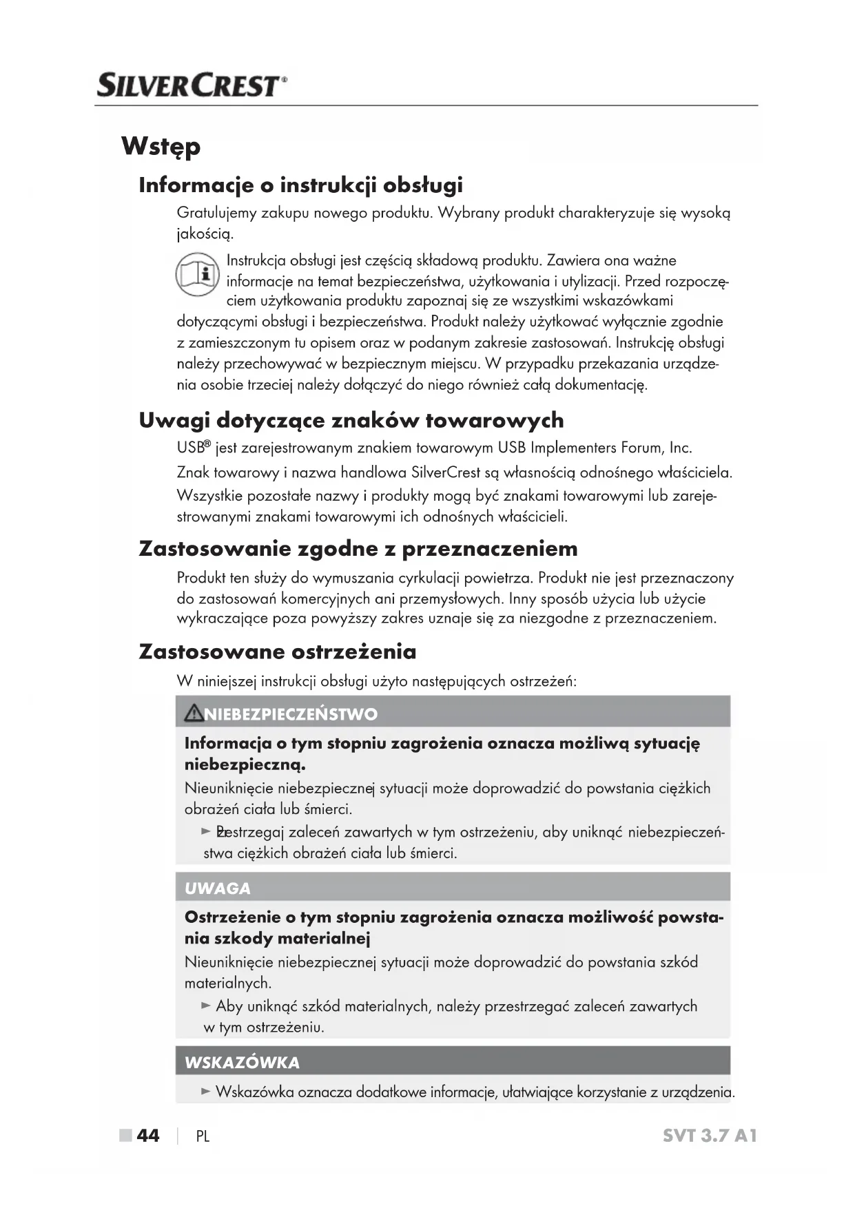 jest zarejestrowanym znakiem towarowym USB Implementers Forum, Inc. Znak towarowy inazwa handlowa SilverCrest są własnością odnośnego właściciela. Wszystkie pozostałe nazwy iprodukty mogą być znakami towarowymi lub zareje- strowanymi znakami towarowymi ich odnośnych właścicieli. Zastosowanie zgodne zprzeznaczeniem Produkt ten służy do wymuszania cyrkulacji powietrza. Produkt nie jest przeznaczony do zastosowań komercyjnych ani przemysłowych. Inny sposób użycia lub użycie wykraczające poza powyższy zakres uznaje się za niezgodne zprzeznaczeniem. Zastosowane ostrzeżenia W niniejszej instrukcji obsługi użyto następujących ostrzeżeń: NIEBEZPIECZEŃSTWO Informacja otym stopniu zagrożenia oznacza możliwą sytuację niebezpieczną. Nieuniknięcie niebezpieczne j sytuacji może doprowadzić do powstania ciężkich obrażeń ciała lub śmierci. ► Pr zestrzegaj zaleceń zawartych wtym ostrzeżeniu, aby uniknąć niebezpieczeń- stwa ciężkich obrażeń ciała lub śmierci. UWAGA Ostrzeżenie o tym stopniu zagrożenia oznacza możliwość powsta- nia szkody materialnej Nieuniknięcie niebezpiecznej sytuacji może doprowadzić do powstania szkód materialnych. ► Aby uniknąć szkód materialnych, należy przestrzegać zaleceń zawartych wtym ostrzeżeniu. WSKAZÓWKA ► Wskazówka oznacza dodatkowe informacje, ułatwiające korzystanie zurządzenia.PL