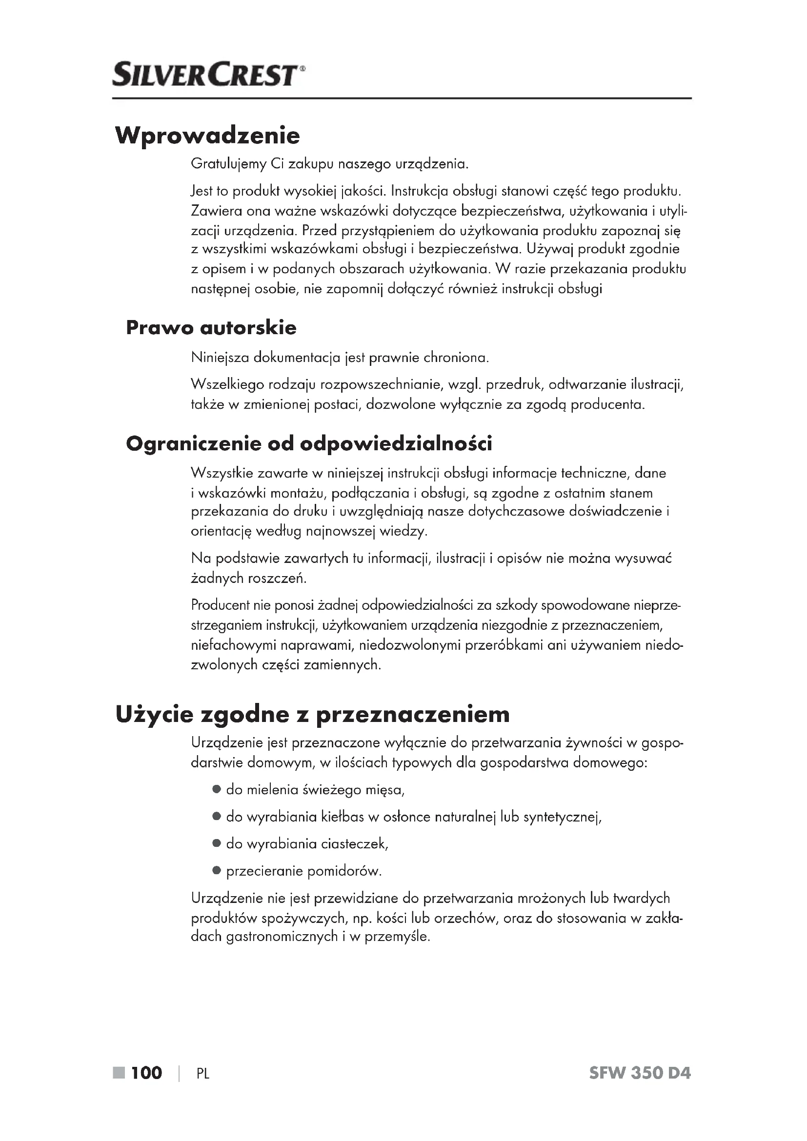 PL SFW 350 D4 Wprowadzenie Gratulujemy Ci zakupu naszego urządzenia. Jest to produkt wysokiej jakości. Instrukcja obsługi stanowi część tego produktu. Zawiera ona ważne wskazówki dotyczące bezpieczeństwa, użytkowania i utyli- zacji urządzenia. Przed przystąpieniem do użytkowania produktu zapoznaj się z wszystkimi wskazówkami obsługi i bezpieczeństwa. Używaj produkt zgodnie z opisem i w podanych obszarach użytkowania. W razie przekazania produktu następnej osobie, nie zapomnij dołączyć również instrukcji obsługi Prawo autorskie Niniejsza dokumentacja jest prawnie chroniona. Wszelkiego rodzaju rozpowszechnianie, wzgl. przedruk, odtwarzanie ilustracji, także w zmienionej postaci, dozwolone wyłącznie za zgodą producenta. Ograniczenie od odpowiedzialności Wszystkie zawarte w niniejszej instrukcji obsługi informacje techniczne, dane i wskazówki montażu, podłączania i obsługi, są zgodne z ostatnim stanem przekazania do druku i uwzględniają nasze dotychczasowe doświadczenie i orientację według najnowszej wiedzy. Na podstawie zawartych tu informacji, ilustracji i opisów nie można wysuwać żadnych roszczeń. Producent nie ponosi żadnej odpowiedzialności za szkody spowodowane nieprze- strzeganiem instrukcji, użytkowaniem urządzenia niezgodnie z przeznaczeniem, niefachowymi naprawami, niedozwolonymi przeróbkami ani używaniem niedo- zwolonych części zamiennych. Użycie zgodne z przeznaczeniem Urządzenie jest przeznaczone wyłącznie do przetwarzania żywności w gospo- darstwie domowym, w ilościach typowych dla gospodarstwa domowego: ▯ do mielenia świeżego mięsa, ▯ do wyrabiania kiełbas w osłonce naturalnej lub syntetycznej, ▯ do wyrabiania ciasteczek, ▯ przecieranie pomidorów. Urządzenie nie jest przewidziane do przetwarzania mrożonych lub twardych produktów spożywczych, np. kości lub orzechów, oraz do stosowania w zakła- dach gastronomicznych i w przemyśle.PL