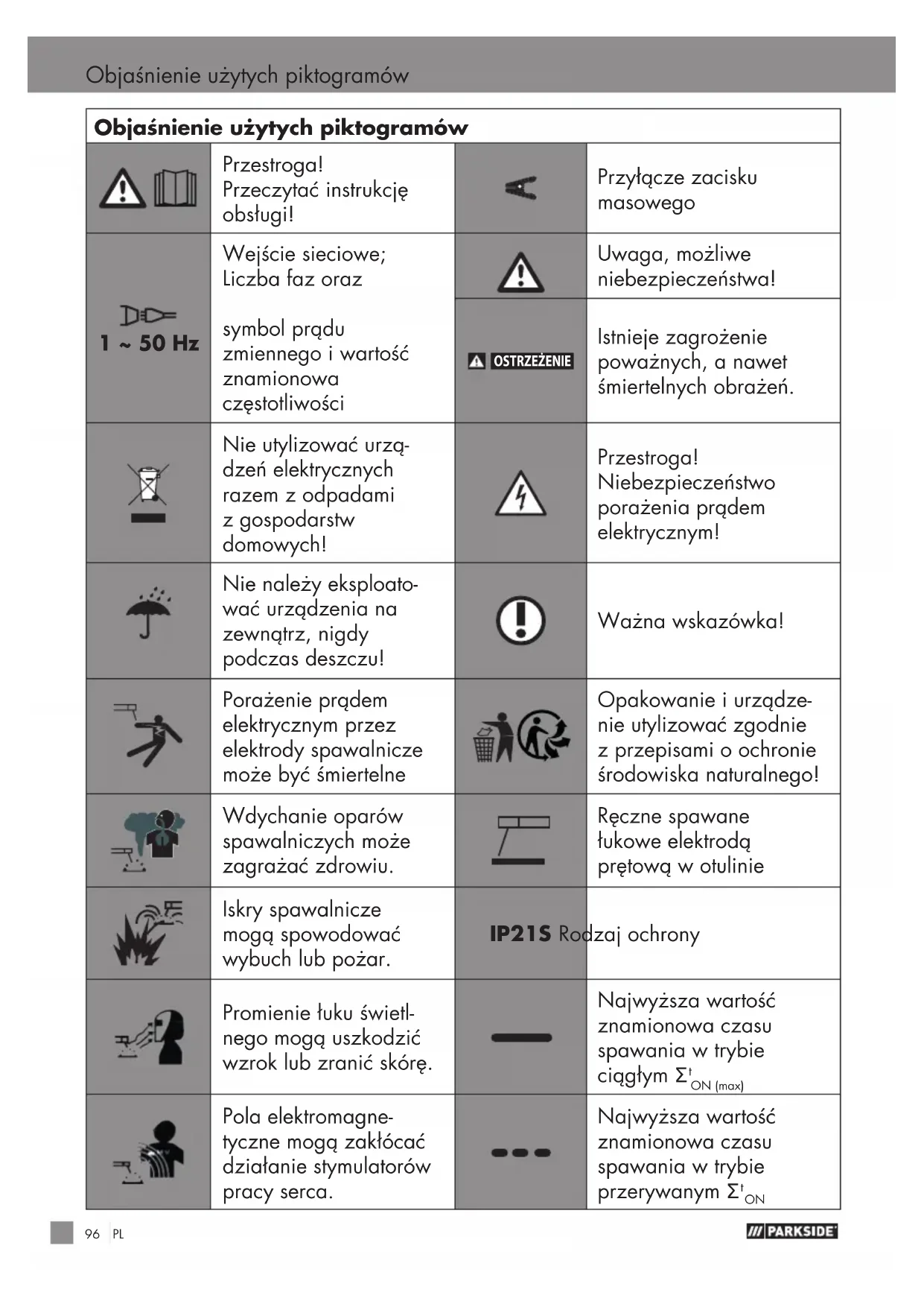 rąd spawalniczy wytwarza pola elektromagnetyczne. Nie należy stosować z medycz- nymi implantami. Nigdy nie należy owijać przewodów spawalniczych wokół ciała. Przewody spawalnicze należy połączyć. z Wskazówki dotyczące bezpieczeństwa stosowa- nia maski spawalniczej Zawsze przed rozpoczęciem spawania należy upewnić się przy pomocy jasnego źródła światła (np. zapalniczki), czy maska spawalnicza prawidłowo funkcjonuje. Odpryski mogą uszkodzić szybkę ochronną. Uszkodzone lub porysowane szybki ochronne należy natychmiast wymienić. Bezzwłocznie należy wymienić uszkodzone, bardzo zabrudzone lub wyszczerbione komponenty.PL 105 Wskazówki dotyczące bezpieczeństwa Urządzenie może być obsługi- wane wyłączne przez osoby, które ukończyły 16. rok życia. Należy zapoznać się zprzepisami dotyczącymi bezpieczeństwa spawania. Wtym c elu należy uwzględnić również wskazówki dotyczące bezpieczeństwa eksploatacji urządzenia spawalniczego. Podczas spawania zawsze należy zakładać maskę spawal- niczą. W r azie niestosowania mogą wystąpić ciężkie obraże- nia siatkówki. Podczas spawania zawsze należy zakładać odzież ochronną. Maski spawalniczej nigdy nie należy stosować bez szybki ochronnej, ponieważ w przeciwnym razie może zostać uszkodzona jednostka optyczna. W porę należy wymienić szybkę ochronną, aby mieć dobrą widoczność i pracować bez zmęczenia. z Otoczenie o zwięk- szonym zagrożeniu elektrycznym Otoczenia o zwiększonym zagro- żeniu elektrycznym występują na przykład: w miejscach pracy, w których przestrzeń ruchu jest ogra- niczona, w związku z czym operator pracuje w pozycji wymuszonej (np. klęczącej, siedzącej lub leżącej) i dotyka elementów przewodzących elektrycznie; w miejscach pracy, które są całkowicie lub częściowo ograniczone pod kątem przewodzenia elektrycznego i w których występuje duże zagrożenie z powodu moż- liwego do uniknięcia lub przypadkowego dotknięcia przez operatora; w mokrych, wilgotnych lub gorących miejscach pracy, wktórych wilgotność powie- trza lub pot znacznie obniżają opór ludzkiej skóry i właści- wości izolacyjne wyposażenia ochronnego. Przewodniki metalowe lub rusztowanie również mogą spowodować, że w otoczeniuPL106 wystąpi większe zagrożenie elektryczne. Podczas stosowania urządzeń spawalniczych w niebezpiecz- nych warunkach elektrycznych napięcie wyjściowe urządzenia spawalniczego na biegu jało- wym nie może być wyższe niż 35V (wartość rzeczywista). Ze względu na napięcie wyjściowe to urządzenie spawalnicze nie może być użytkowane w takich okolicznościach. z Spawanie w ciasnych pomieszczeniach Podczas spawania w ciasnych pomieszczeniach może wystąpić niebezpieczeństwo toksycznych gazów (niebezpieczeństwo uduszenia). W ciasnych pomieszczeniach urządzenie można obsługiwać tylko wtedy, gdy bezpośred- nio w pobliżu przebywają poinstruowane osoby, które mogą interweniować w sytuacji krytycznej. Tutaj przed użyciem urządzenia spawalniczego należy dokonać oceny eks- perta, aby ustalić, jakie kroki są konieczne, aby zapewnić bezpieczeństwo pracy i jakie środki ostrożności należy podjąć podczas właściwego procesu spawania. z Sumowanie napięć biegu jałowego Jeśli w tym samym czasie działa więcej niż jedno źródło prądu spawania, ich napięcia jałowe mogą się sumować i prowadzić do zwiększonego zagrożenia elektrycznego Źródła prądu spawalniczego z oddzielnymi elementami sterującymi i przy- łączami muszą być wyraźnie oznaczone, aby wskazać, co należy do którego obwodu. z Odzież ochronna Podczas pracy spawacz musi być chroniony na całym ciele odpowiednią odzieżą i osłoną twarzy przed promieniowaniem i oparzeniami. Należy wziąć pod uwagę następujące kroki: – przed pracami związanymi ze spawaniem należy założyć odzież ochronną; – należy założyć rękawice ochronne; Wskazówki dotyczące bezpieczeństwaPL 107 Wskazówki dotyczące bezpieczeństwa – otworzyć okno lub użyć wentylatora, aby zagwaran- tować dopływ powietrza; – założyć okulary ochronne iosłonę ust. Na obu dłoniach należy nosić rękawice z mankietami z odpowiedniego materiału (skóra). Muszą one być wnie