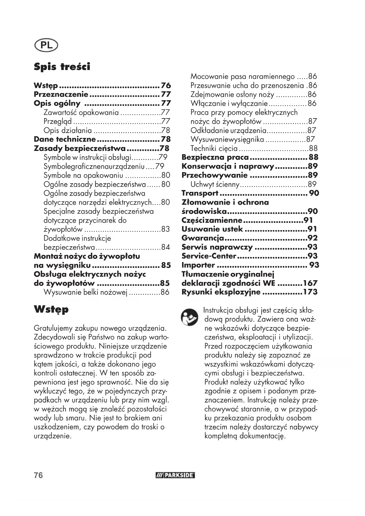 - Dodatkowe instrukcje bezpieczeństwa p. 84