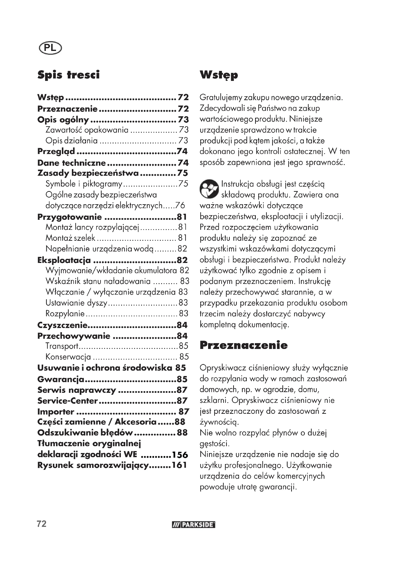 Za niezgodne z przeznaczeniem należy uznawać w szczególności rozpylanie następujących substancji: - rozpuszczalniki - płyny zawierające rozpuszczalniki - środki ochrony roślin - środki do zwalczania chwastów - środki dezynfekujące - nawozy - oleje, smary - lakiery, bejce - środki impregnujące - płyny łatwopalne - płyny żrące takie jak kwasy i ługi Osoby niepełnoletnie nie mogą wykonywać prac z urządzeniem – wyjątek stanowią osoby młodociane, które ukończyły 16 rok życia i zostały przeszkolone pod nadzorem. Operator lub użytkownik jest odpowiedzialny za wypadki lub szkody innych osób lub ich własności. Producent nie odpowiada za szkody spowodowane użyciem niezgodnym z przeznaczeniem urządzenia lub jego nieprawidłową obsługą. Każdy inny rodzaj zastosowania, który nie został wyraźnie dopuszczony w tej instrukcji, może prowadzić do uszkodzenia urządzenia i stanowić źródło poważnych niebezpieczeństw dla użytkownika. Urządzenie należy do serii Parkside X12VTEAM i X20VTEAM można je uru- chamiać opcjonalnie z akumulatorami serii Parkside X12VTEAM wzgl. X20VTEAM. Akumulatory można ładować tylko za po- mocą ładowarek z serii Parkside X12 VTEAM wzgl. X20VTEAM. Opis ogólny Rysunki znajdują się na rozkładanych stronach. Zawartość opakowania Rozpakuj urządzenie i sprawdź, czy jest ono kompletne. - Akumulatorowy spryskiwacz cisnieniowy - Lanca rozpylająca: Uchwyt pistoletu z rurą Rura rozpylająca z dyszą - Instrukcja obsługi Akumulator i ładowarka nie są zawarte w zestawie. Prawidłowo posegreguj i usuń materiały opakowania. Opis działania Za pomocą lany rozpylającej można opryskiwać wodą ze zbiornika rośliny lub powierzchnie. Funkcje elementów urządzenia są podane wponiższym opisie.74
