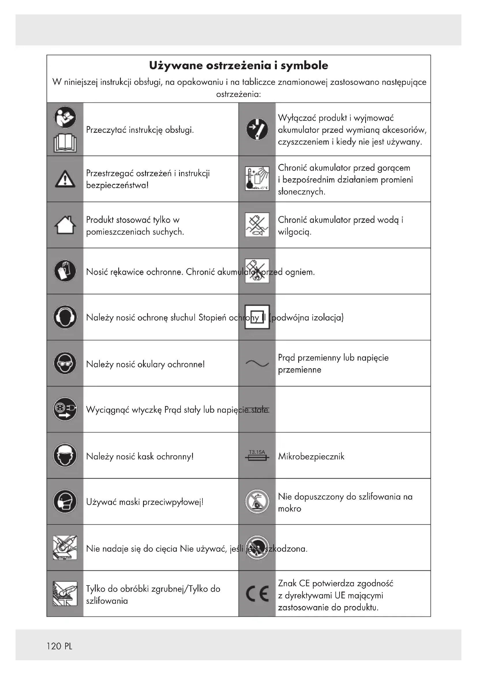 Chronić akumulator przed gorącem i bezpośrednim działaniem promieni słonecznych. Produkt stosować tylko w pomieszczeniach suchych. Chronić akumulator przed wodą i wilgocią. Nosić rękawice ochronne. Chronić akumulator przed ogniem. Należy nosić ochronę słuchu! Stopień ochrony II (podwójna izolacja) Należy nosić okulary ochronne! Prąd przemienny lub napięcie przemienne Wyciągnąć wtyczkę Prąd stały lub napięcie stałe Należy nosić kask ochronny! T3.15A Mikrobezpiecznik Używać maski przeciwpyłowej! Nie dopuszczony do szlifowania na mokro Nie nadaje się do cięcia Nie używać, jeśli jest uszkodzona. Tylko do obróbki zgrubnej/Tylko do szlifowania Znak CE potwierdza zgodność z dyrektywami UE mającymi zastosowanie do produktu.121