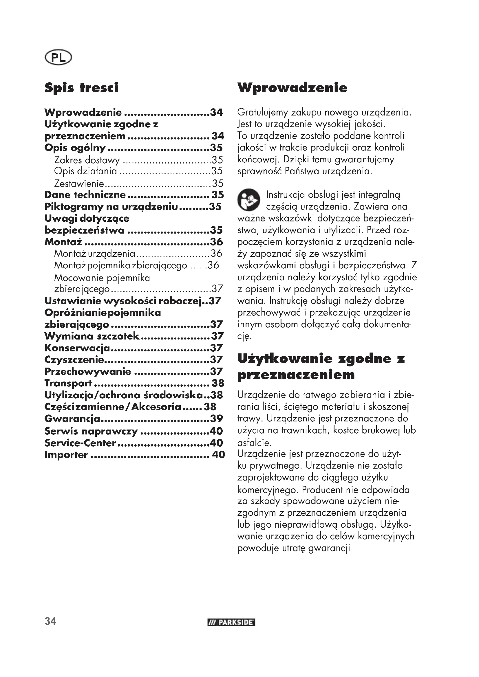 - Wprowadzenie Gratulujemy zakupu nowego urządzenia. Jest to urządzenie wysokiej jakości. To urządzenie zostało poddane kontroli jakości w trakcie produkcji oraz kontroli końcowej. Dzięki temu gwarantujemy sprawność Państwa urządzenia. Instrukcja obsługi jest integralną częścią urządzenia. Zawiera ona ważne wskazówki dotyczące bezpieczeń- stwa, użytkowania i utylizacji. Przed roz- poczęciem korzystania z urządzenia nale- ży zapoznać się ze wszystkimi wskazówkami obsługi i bezpieczeństwa. Z urządzenia należy korzystać tylko zgodnie z opisem i w podanych zakresach użytko- wania. Instrukcję obsługi należy dobrze przechowywać i przekazując urządzenie innym osobom dołączyć całą dokumenta- cję. Użytkowanie zgodne z przeznaczeniem Urządzenie do łatwego zabierania i zbie- rania liści, ściętego materiału i skoszonej trawy. Urządzenie jest przeznaczone do użycia na trawnikach, kostce brukowej lub asfalcie. Urządzenie jest przeznaczone do użyt- ku prywatnego. Urządzenie nie zostało zaprojektowane do ciągłego użytku komercyjnego. Producent nie odpowiada za szkody spowodowane użyciem nie- zgodnym z przeznaczeniem urządzenia lub jego nieprawidłową obsługą. Użytko- wanie urządzenia do celów komercyjnych powoduje utratę gwarancji Spis tresci Wprowadzenie p. 34