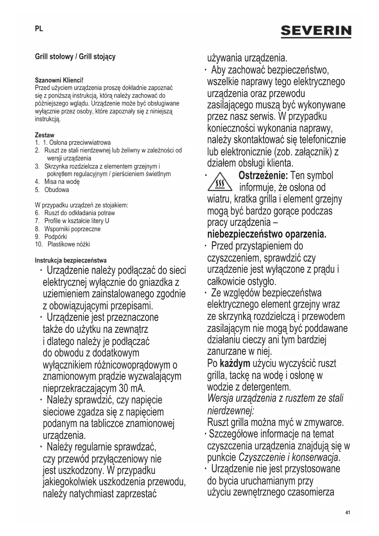 Ostrzeżenie: Ten symbol informuje, że osłona od wiatru, kratka grilla i element grzejny mogą być bardzo gorące podczas pracy urządzenia – niebezpieczeństwo oparzenia. ∙ Przed przystąpieniem do czyszczeniem, sprawdzić czy urządzenie jest wyłączone z prądu i całkowicie ostygło. ∙ Ze względów bezpieczeństwa elektrycznego element grzejny wraz ze skrzynką rozdzielczą i przewodem zasilającym nie mogą być poddawane działaniu cieczy ani tym bardziej zanurzane w niej. Po każdym użyciu wyczyścić ruszt grilla, tackę na wodę i osłonę w wodzie z detergentem. Wersja urządzenia z rusztem ze stali nierdzewnej: Ruszt grilla można myć w zmywarce. ∙ Szczegółowe informacje na temat czyszczenia urządzenia znajdują się w punkcie Czyszczenie i konserwacja. ∙ Urządzenie nie jest przystosowane do bycia uruchamianym przy użyciu zewnętrznego czasomierza PL42 142 x 208 mm lub odrębnego systemu zdalnego sterowania. ∙ Ostrzeżenie! W żadnym wypadku nie stosować węgla drzewnego lub innego stałego bądź ciekłego paliwa. ∙ Ostrzeżenie: Nie przykrywać siatki grilla aluminiową folią, naczyniami do „Barbecue” czy innymi przedmiotami, gdyż gromadzące się pod nią ciepło może spowodować poważne uszkodzenie urządzenia. ∙ Do tacki na wodę można wlać maksymalnie 1,1 litra wody. ∙ Urządzenie przeznaczone jest do zastosowań domowych lub podobnych, jak np. w - kuchniach biurowych lub innych miejscach pracy; - agroturystyce; - hotelach, motelach itp. oraz innych podobnych lokalach (przez klientów); - pensjonatach. ∙ Osoby o ograniczonych zdolnościach zycznych, czuciowych lub psychicznych albo nieposiadające stosownego doświadczenia lub wiedzy, a także dzieci (w wieku co najmniej 8 lat), mogą korzystać z urządzenia, pod warunkiem że znajdują się pod nadzorem lub zostały poinstruowane, jak używać urządzenia i są w pełni świadome wszelkich zagrożeń i wymaganych środków ostrożności. ∙ Nie dopuszczać do używania urządzenia jako zabawki przez dzieci. ∙ Nie wolno pozwalać dzieciom na wykonywanie jakichkolwiek prac związanych bezpośrednio z konserwacją lub czyszczeniem urządzenia, a jeżeli już, to dziecko musi mieć co najmniej 8 lat i być nadzorowane przez osobę dorosłą. ∙ Nie dopuszczać do urządzenia i jego przewodu zasilającego dzieci poniżej 8 lat. ∙ Ostrzeżenie: Nie pozwalać, aby dzieci miały dostęp do elementów opakowania, ponieważ mogą one spowodować zagrożenie, np. uduszenia. ∙ Przed użyciem urządzenia należy dokładnie sprawdzić, czy główny korpus i wszystkie elementy czynnościowe są sprawne i nie noszą śladów uszkodzenia. Jeżeli urządzenie spadło na twardą powierzchnię, nie nadaje się do dalszego użytku, gdyż nawet najmniejsza, niewidoczna usterka powstała z tego powodu, może mieć ujemny wpływ na jego działanie i bezpieczeństwo użytkownika. ∙ W czasie pracy, urządzenie musi być umieszczone na powierzchni odpornej na wysokie temperatury, plamy i rozgrzany tłuszcz. Podczas opiekania żywności z dużą zawartością tłuszczu nie zawsze można uniknąć odprysków. ∙ Nie stawiać grilla w rogu, ani nie opierać go o ścianę. Upewnić się, czy w pobliżu nie znajdują się żadne materiały łatwopalne. ∙ Osłony przeciwwiatrowej nie należy instalować podczas użytkowania urządzenia w pomieszczeniach. ∙ Tłuste potrawy z grilla mogą się zapalić, dlatego przy każdym użyciu urządzenia należy wlewać wodę do misy na wodę! Dopiero wówczas należy podłączyć wtyczkę zasilania. Pozwala to schłodzić misę na wodę, zmniejsza zadymienie i ułatwia czyszczenie. ∙ Należy nadzorować poziom wody. Wodę należy dolewać z odpowiednim wyprzedzeniem, pamiętając, aby nie zetknęła się ona z elementem grzejnym. Ostrzeżenie: Przed przystąpieniem do dolewania wody, odłączyć grilla od zasilania. ∙ Przed uruchomieniem należy sprawdzić, czy element grzejny jest prawidłowo umieszczony w obudowie i misie na wodę. ∙ Nie pozostawiać włączonego urządzenia bez nadzoru. ∙ Podczas pracy urządzenia element grzejny i ruszt grilla są bardzo gorące. Nawet po wyłączeniu nie należy dotykać elementu grzejnego, tak długo, jak pozostaje gorący. Istnieje ryzyko poparzenia! ∙ Należy uważać, aby przewód zasilający nie dotykał żadnych gorących elementów. ∙ Poprowadzić przewód w taki sposób, aby nikt nie mógł się o niego potknąć. ∙ Wtyczkę należy wyjmować z gniazdka każdorazowo:43 142 x 208 mm - przed przystąpieniem do wlewania wody do tacki odblaskowej; - po zakończeniu pracy; - w przypadku stwierdzenia awarii urządzenia; - i przed przystąpieniem do czyszczenia. ∙ Użycie przedłużacza lub szpuli powoduje utratę mocy, często połączoną z nagrzewaniem się przewodów. Dlatego przed użyciem należy całkowicie rozwinąć przewód. Sprawdzić, czy przewód jest przeznaczony do użytku na zewnątrz i do określonej mocy (zob. etykieta znamionowa). ∙ W przypadku urządzeń ze stojakiem: Ruszt do odkładania potraw można obciążyć maksymalnie 4 kg. ∙ Nigdy nie przenosić grilla w trakcie jego pracy. ∙ Uwaga! Zawsze zaczekać na zupełne ostygnięcie grilla przed jego przenoszeniem, czyszczeniem, przykryciem lub schowaniem. ∙ Uwaga! Jeśli grill nie jest używany, wyjąć element grzewczy wraz ze skrzynką zaciskową z grilla i przechowywać go w suchym pomieszczeniu. ∙ Niedozwolone jest przechowywanie innych części grilla na zewnątrz lub w otwartych miejscach, gdzie mogą być narażone na niekorzystne warunki pogodowe. ∙ Za szkody wynikłe z nieprawidłowego używania sprzętu lub użytkowania niezgodnego z instrukcją obsługi odpowiedzialność ponosi wyłącznie użytkownik. ∙ Niniejszy wyrób zgodny jest z obowiązującymi w UE przepisami dotyczącymi oznakowania produktu. Przed użyciem urządzenia po raz pierwszy ∙ Zdjąć z urządzenia wszystkie elementy opakowania i nakl