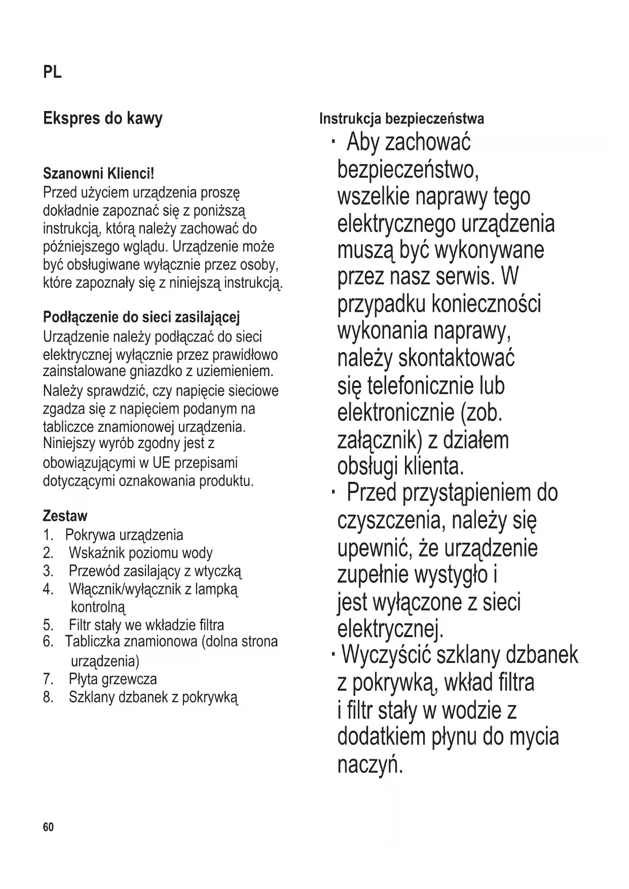 ∙ Szczegółoweinformacje na temat czyszczenia urządzeniaznajdująsię w punkcie Czyszczenie i konserwacja. ∙ Abyniedopuścićdo porażeniaprądem,nie czyścićurządzenia cieczamianiniezanurzać go. ∙ Ostrzeżenie! Nieprawidłoweużytkowanie urządzeniamoże doprowadzićdopoważnych obrażeńciała. ∙ Uwaga!Płytagrzewcza rozgrzewasiędowysokiej temperatury w trakcie pracyipozostajegorąca przezjakiśczaspojej zakończeniu. ∙ Urządzenieniemoże byćeksploatowanew zamkniętejszae. ∙ Urządzenieprzeznaczone jestdozastosowań domowych lub podobnych, jak np. w - kuchniach biurowych lub innych miejscach pracy; - agroturystyce; - hotelach, motelach itp. oraz innych podobnych lokalach (przez klientów); - pensjonatach. ∙ Osoby o ograniczonych zdolnościachzycznych, czuciowych lub psychicznych albo nieposiadającestosownego doświadczenialubwiedzy, atakżedzieci(wwieku conajmniej8lat),mogą korzystaćzurządzenia, podwarunkiemżeznajdują siępodnadzoremlub zostałypoinstruowane,jak używaćurządzeniaisąw pełniświadomewszelkich zagrożeńiwymaganych środkówostrożności. ∙ Niedopuszczaćdo62 104 x 142 mm używaniaurządzeniajako zabawki przez dzieci. ∙ Niewolnopozwalać dzieciom na wykonywanie jakichkolwiek prac związanychbezpośrednio zkonserwacjąlub czyszczeniemurządzenia, ajeżelijuż,todzieckomusi miećconajmniej8latibyć nadzorowaneprzezosobę dorosłą. ∙ Niedopuszczaćdo urządzeniaijegoprzewodu zasilającegodzieciponiżej 8 lat. ∙ Ostrzeżenie:Niepozwalać,abydzieci miałydostępdoelementówopakowania, ponieważmogąonespowodować zagrożenie,np.uduszenia. ∙ Przedużyciemnależydokładnie sprawdzić,czygłównykorpus urządzeniaiwszystkieelementy czynnościowesąsprawneinienoszą śladówuszkodzenia.Jeżeliurządzenie np.spadłonatwardąpowierzchnięalbo przewódzasilającyzostałnarażony nazbytsilneszarpnięcie,nienadaje sięonododalszegoużytku:nawet najmniejsza, niewidoczna usterka powstałaztegopowodu,możemieć ujemnywpływnadziałanieurządzeniai bezpieczeństwoużytkownika. ∙ Podczasparzeniakawy,urządzenie musibyćustawionenarównejinie śliskiejpowierzchni,odpornejna ewentualne zaplamienie i rozpryski. ∙ Urządzenieorazprzewódsieciowy niemogąstykaćsięzgorącymi powierzchniami,aniteżbyćpoddawane działaniuwysokichtemperatur. ∙ Ostrzeżenie! Przed otwarciem ekspresu do kawy lub wyjęciem akcesoriów, wyłączone urządzenie musi najpierw dobrze ostygnąć. W przeciwnym razie może dojść do wycieku gorącej wody lub pary. ∙ Niezostawiaćurządzeniabeznadzoru, kiedyjestpodłączonedozasilania. ∙ Wtyczkę należy wyjąć z gniazda elektrycznego: - w przypadku stwierdzenia usterki urządzenia; - po zakończeniu pracy; - i przed przystąpieniem do czyszczenia. ∙ Nigdynienależyciągnąćzaprzewód przy wyjmowaniu wtyczki z gniazdka elektrycznego. ∙ Przewódprzyłączeniowyniepowinien zwisaćwolno,należyuważaćaby znajdowałsięwbezpiecznejodległości odgorącychczęściurządzenia. ∙ Nieponosisięodpowiedzialności,jeśli szkodawynikłaznieprawidłowego używaniasprzętulubużytkowania niezgodnegozinstrukcjąobsługi.104 x 142 mm