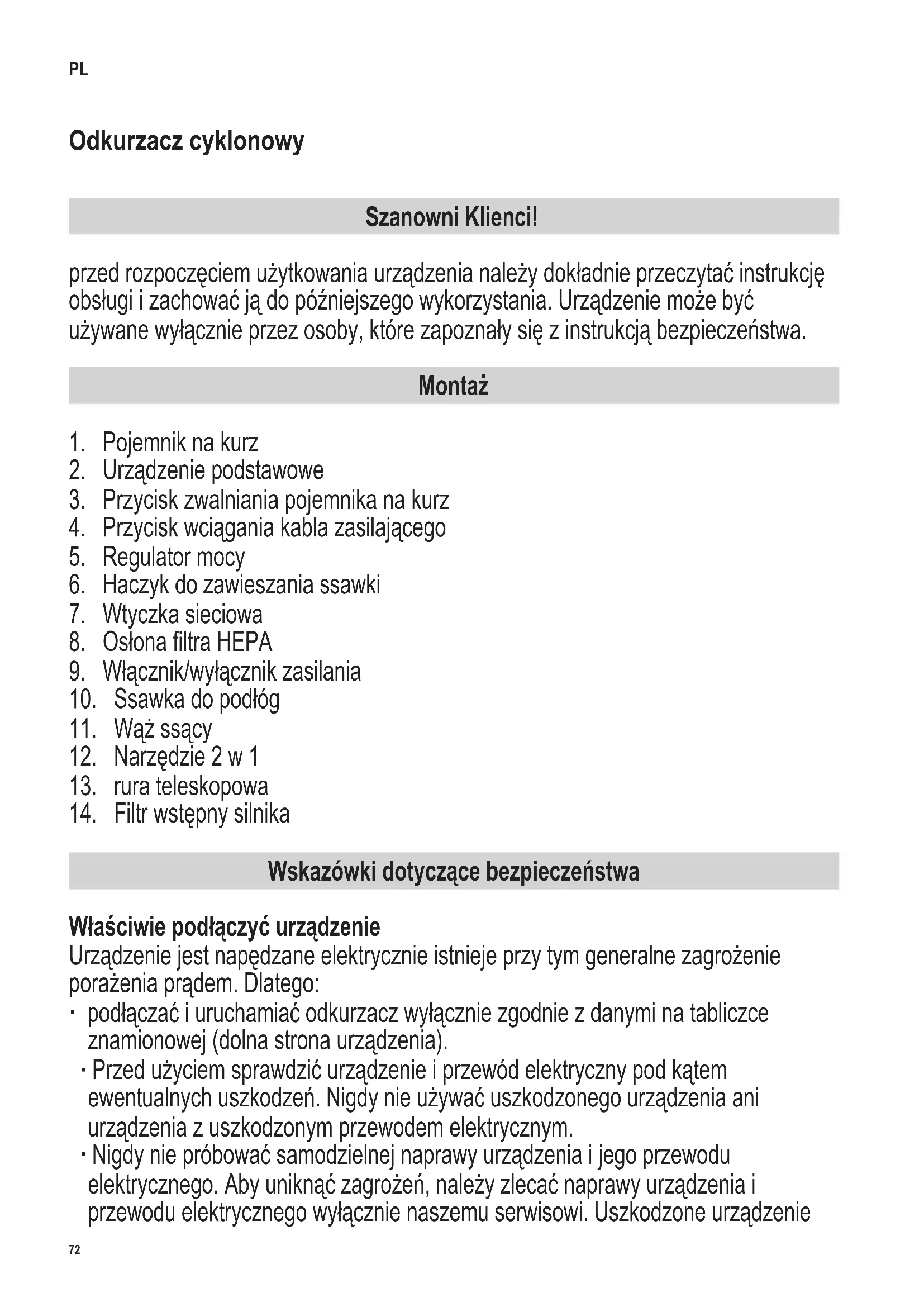 Wskazówki dotyczące bezpieczeństwa Właściwie podłączyć urządzenie Urządzenie jest napędzane elektrycznie istnieje przy tym generalne zagrożenie porażenia prądem. Dlatego: ∙ podłączać i uruchamiać odkurzacz wyłącznie zgodnie z danymi na tabliczce znamionowej (dolna strona urządzenia). ∙ Przed użyciem sprawdzić urządzenie i przewód elektryczny pod kątem ewentualnych uszkodzeń. Nigdy nie używać uszkodzonego urządzenia ani urządzenia z uszkodzonym przewodem elektrycznym. ∙ Nigdy nie próbować samodzielnej naprawy urządzenia i jego przewodu elektrycznego. Aby uniknąć zagrożeń, należy zlecać naprawy urządzenia i przewodu elektrycznego wyłącznie naszemu serwisowi. Uszkodzone urządzenie PL73 142 x 208 mm należy oddać do naprawy w sklepie specjalistycznym lub skontaktować się z serwisem SEVERIN. ∙ Nie zanurzać urządzenia w wodzie ani w innych płynach i nie traktować go płynami. Nie używać urządzenia na wolnym powietrzu i w pomieszczeniach o wysokiej wilgotności. Nie dotykać wtyczki mokrymi rękami. ∙ Zwracać uwagę na to, aby wyciągać kabel zasilający z urządzenia tylko do pierwszego oznaczenia. ∙ Zwracać uwagę na to, aby przewód elektryczny nie został załamany, zakleszczony, aby nic po nim nie przejechało i aby nie miał kontaktu ze źródłami wysokiej temperatury, wilgocią i ostrymi krawędziami. Uważać, aby przewód elektryczny nie powodował zagrożenia potknięciem. ∙ Nie ciągnąć ani nie transportować urządzenia za przewód elektryczny. Przy wyjmowaniu wtyczki z gniazdka należy zawsze ciągnąć za wtyczkę. W miarę możliwości nie używać przedłużaczy. Jeśli jest to jednak konieczne, używać wyłącznie zwykłych przedłużaczy ze znakiem GS (bez gniazd zespolonych), przystosowanych do poboru mocy urządzenia. ∙ Przed czyszczeniem lub konserwacją urządzenia oraz przed wymianą osprzętu należy wyłączyć urządzenie i wyjąć wtyczkę z gniazdka. Bezpieczeństwo określonych grup osób ∙ Niniejsze urządzenie wolno użytkować dzieciom powyżej 8 lat oraz osobom o ograniczonej zdolności zycznej, czuciowej lub intelektualnej i osobom nie mającym doświadczenia i/lub znajomości sprzętu, pod warunkiem że odbywa się to pod nadzorem lub po zapoznaniu się z zasadami bezpiecznego użytkowania sprzętu oraz ewentualnymi zagrożeniami z nim związanymi. Dzieci poniżej 8 lat trzymać z dala od urządzenia i przewodu zasilającego. ∙ Dzieciom nie wolno bawić się urządzeniem, na niego stawać ani siadać. Bez nadzoru nie wolno dzieciom czyścić ani wykonywać prac konserwacyjnych przewidzianych dla użytkownika. ∙ Materiały opakowaniowe trzymać i utylizować poza zasięgiem dzieci. W innym przypadku istnieje niebezpieczeństwo uduszenia. Zastosowanie zgodne z przeznaczeniem Urządzenie wolno stosować jedynie w gospodarstwie domowym. Odkurzać jedynie suche, normalnie zabrudzone podłogi lub - zależnie od wyposażenia - meble i tapicerkę. Każde inne zastosowanie jest niezgodne z przeznaczeniem i jest niedozwolone. Aby zapobiec obrażeniom ciała, pożarom i szkodom, nie wolno stosować urządzenia do odkurzania:74 142 x 208 mm ∙ ludzi, zwierząt i roślin, Dysze i otwór zasysający należy zawsze trzymać z dala od wszystkich części ciała, włosów i odzieży. Nie odkurzać w pobliżu głowy. ∙ żarzących się, palących się lub tlących cząsteczek (np. popiół, węgiel, węgiel drzewny, papierosy, zapałki), ∙ wybuchowych lub łatwopalnych materiałów lub tonerów, ∙ wody lub innych płynów, np. środków do czyszczenia dywanów na mokro, ∙ ostrych przedmiotów, takich jak odłamki szkła, gwoździe lub gruz budowlany. ∙ Drobny pył, taki jak gips, cement, drobny pył pochodzący z wiercenia, proszek. Oznaczenie CE Urządzenie jest zgodne z dyrektywami UE, które są wiążące dla oznakowania CE. Obsługa urządzenia Przed pierwszym uruchomieniem ∙ Usunąć z urządzenia resztki opakowania lub wkładki. ∙ Zmontować urządzenie zgodnie z poniższymi wskazówkami i sprawdzić, czy pojemnik na kurz i ltry są prawidłowo zamontowane (patrz również „Opróżnianie pojemnika na kurz” i „Czyszczenie lub wymiana ltrów”. Montaż ∙ Elementy urzMontaż ądzenia wolno montować jedynie po wyciągnięciu wtyczki z gniazdka. ∙ W razie potrzeby włożyć pojemnik na kurz do urządzenia, aż będzie słyszalne kliknięcie. ∙ Podłączyć wąż do urządzenia i zablokować go, przekręcając o 1/4 obrotu. ∙ Nasunąć rurę teleskopową na wąż aż do słyszalnego kliknięcia i ustawić żądaną długość. ∙ Wybrać ssawkę odpowiednią do powierzchni, która ma być odkurzana: Przełączalna dysza podłogowa ma 2 możliwości ustawienia: Położenie 1 doskonale nadaje się do zbierania zabrudzenia i włókien z wykładzin podłogowych, chodników itp. oraz do głębokiego czyszczenia tych podłoży. Położenie 2 jest idealne do gładkich podłóg wszelkiego rodzaju. Narzędzie 2 w 1 ze złożoną szczotką jest idealne do czyszczenia szczelin w kanapach i innych trudno dostępnych miejsc. Z rozłożoną szczotką nadaje się idealnie do odkurzania mebli.