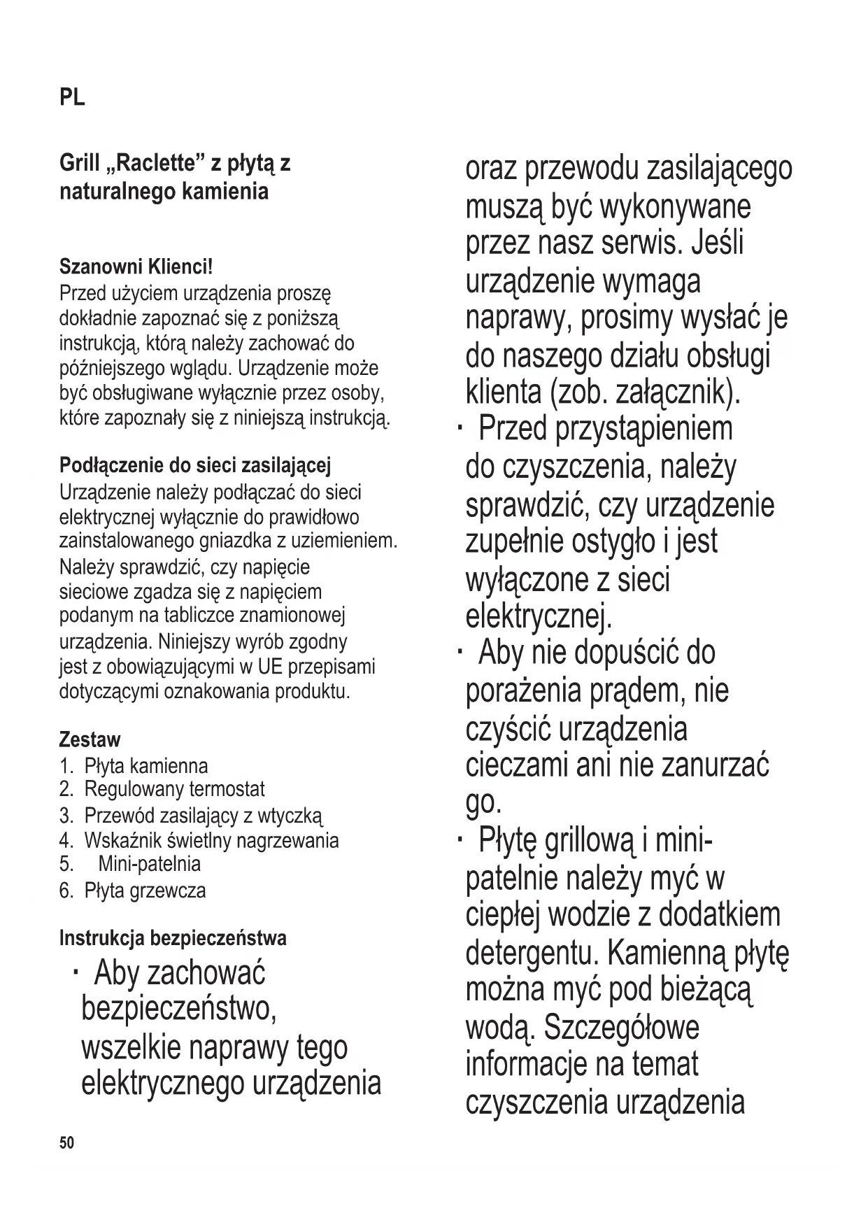 czasie wykonywania tej czynności należy zapewnić odpowiednią wentylację w pomieszczeniu. Kamienna płyta ∙ Położyć kamienną płytę na elemencie grzejnym gładką stroną do góry. Płytę należy położyć w taki sposób, aby została unieruchomiona przez szyny ramy, które powinny wpasować się w rowki w spodzie płyty. ∙ Ostrzeżenie: Nie należy kłaść zimnej płyty na gorącym elemencie grzejnym. ∙ Kamienną płytę można używać do pieczenia/smażenia warzyw, plasterków mięsa, ryb itp. ∙ Płyta kamienna wykonana jest z naturalnego materiału. Niewielkie pęknięcia wynikające z naturalnego rozkurczania i kurczenia się płyty podczas ogrzewania i stygnięcia urządzenia są zjawiskiem normalnym, podobnie jak zmiana barwy na ciemniejszą. Nie ma to negatywnego wpływu na pracę urządzenia. ∙ Na płycie kamiennej nie należy umieszczać zamrożonej żywności ani produktów zawierających cukier (jak np. korniszony czy musztarda). Płyta grzewcza ∙ Przed włączeniem urządzenia umieścić płytę na górze, nad elementem grzejnym, żeberkowaną stroną skierowaną w górę. ∙ Szyny ramy urządzenia muszą wpasować się w rowki w spodzie płyty. Przesunąć płytę lekko w bok, tak aby została unieruchomiona, zwracając uwagę na oznaczenia na płycie. ∙ Płyta grzewcza przeznaczona jest do grillowania warzyw, mięsa i ryb. Regulowany termostat ∙ Regulowany termostat steruje czasem pracy elementu grzejnego, o którego aktualnym stanie informuje wskaźnik świetlny. Element grzejny pracuje = wskaźnik świetlny włączony Element grzejny nie pracuje = wskaźnik świetlny wyłączony ∙ Do topienia sera lub grillowania należy używać maksymalnego ustawienia (regulator termostatu przesunięty maksymalnie w prawo). ∙ W celu utrzymywania temperatury dania, przesunąć regulator na niższe ustawienie (bardziej w lewo). ∙ Po zakończeniu pracy, przekręcić regulator termostatu maksymalnie w lewo i wyjąć wtyczkę z kontaktu. Obsługa ∙ Założyć płyty grzewczą i kamienną w sposób opisany powyżej. ∙ Włożyć wtyczkę do kontaktu elektrycznego i przekręcić termostat maksymalnie w prawo. ∙ Po około 10 minutach rozgrzewania urządzenie jest gotowe do pracy. Użycie płyty kamiennej wymaga rozgrzewania przez około 40 minut. ∙ Umieścić przygotowywane danie na płytach. Zaleca się pokrycie płyty grzewczej cienką warstwą oleju oraz posypanie płyty kamiennej niewielką ilością soli, aby zapobiec przywieraniu54 104 x 142 mm żywności. ∙ Do mini-patelni włożyć ser raclette. Włożyć mini-patelnie pod element grzejny i zostawić je tak długo, aż ser się rozpuści. ∙ Ostrzeżenie: Nie wkładać pustych mini- patelni (z powrotem) do włączonego urządzenia – należy je postawić na żaroodpornej powierzchni. ∙ Po zakończeniu pracy, przekręcić regulator termostatu maksymalnie w lewo i wyjąć wtyczkę z kontaktu. Jak przyrządzić ser raclette Użyć od 200 do 300 gramów sera na osobę. Pokroić ser na plasterki o grubości od 3 do 5 mm i ułożyć je na mini- patelniach. Najlepiej użyć oryginalnego sera „Raclette”, aczkolwiek można użyć każdego innego sera, który szybko się rozpuszcza. Kilka praktycznych rad ∙ Przed przystąpieniem do smażenia lub grillowania zamrożonej wcześniej żywności, należy ją całkowicie rozmrozić. ∙ Aby nie uszkodzić warstwy ochronnej mini-patelni oraz płyty grzewczej, używać wyłącznie takich przyborów, które rysują powierzchni naczyń. Czyszczenie i konserwacja ∙ Przed przystąpieniem do czyszczenia urządzenia, należy sprawdzić czy wtyczka jest wyjęta z gniazdka, a urządzenie już całkowicie ostygło. ∙ Nie zanurzać sprzętu w wodzie, ani nie myć go wodą, ponieważ grozi to porażeniem prądem. ∙ Do czyszczenia nie należy stosować żrących roztworów, ani środków ścierających. ∙ Wytrzeć powierzchnię zewnętrzną grilla czystą, wilgotną ściereczką. ∙ Przed zdjęciem kamiennej płyty grzewczej z urządzenia w celu jej wyczyszczenia, upewnić się, czy całkowicie ostygła. Kamienną płytę grzewczą można myć pod bieżącą wodą bez użycia detergentów. Następnie płytę należy dokładnie wysuszyć miękką ściereczką. Nie zanurzać płyty w wodzie. ∙ Zdjąć płytę grzewczą i umyć w ciepłej wodzie z detergentem, po czym dokładnie wytrzeć do sucha ściereczką. ∙ Mini-patelnie należy myć w ciepłej wodzie z dodatkiem płynu do mycia naczyń. Następnie należy je dokładnie wysuszyć. ∙ Nie nadają się natomiast do mycia w zmywarce. Utylizacja Urządzenia oznaczone powyższym symbolem należy utylizować osobno, a nie wraz ze zwykłymi odpadkami z gospodarstwa domowego. Urządzenia takie zawierają bowiem cenne materiały, które można poddać recyklingowi. Odpowiednia utylizacja takich urządzeń pomaga w ochronie środowiska i zdrowia człowieka. Szczegółowych informacji na ten temat udzielają lokalne władze lub sklepy prowadzące sprzedaż detaliczną.104 x 142 mm