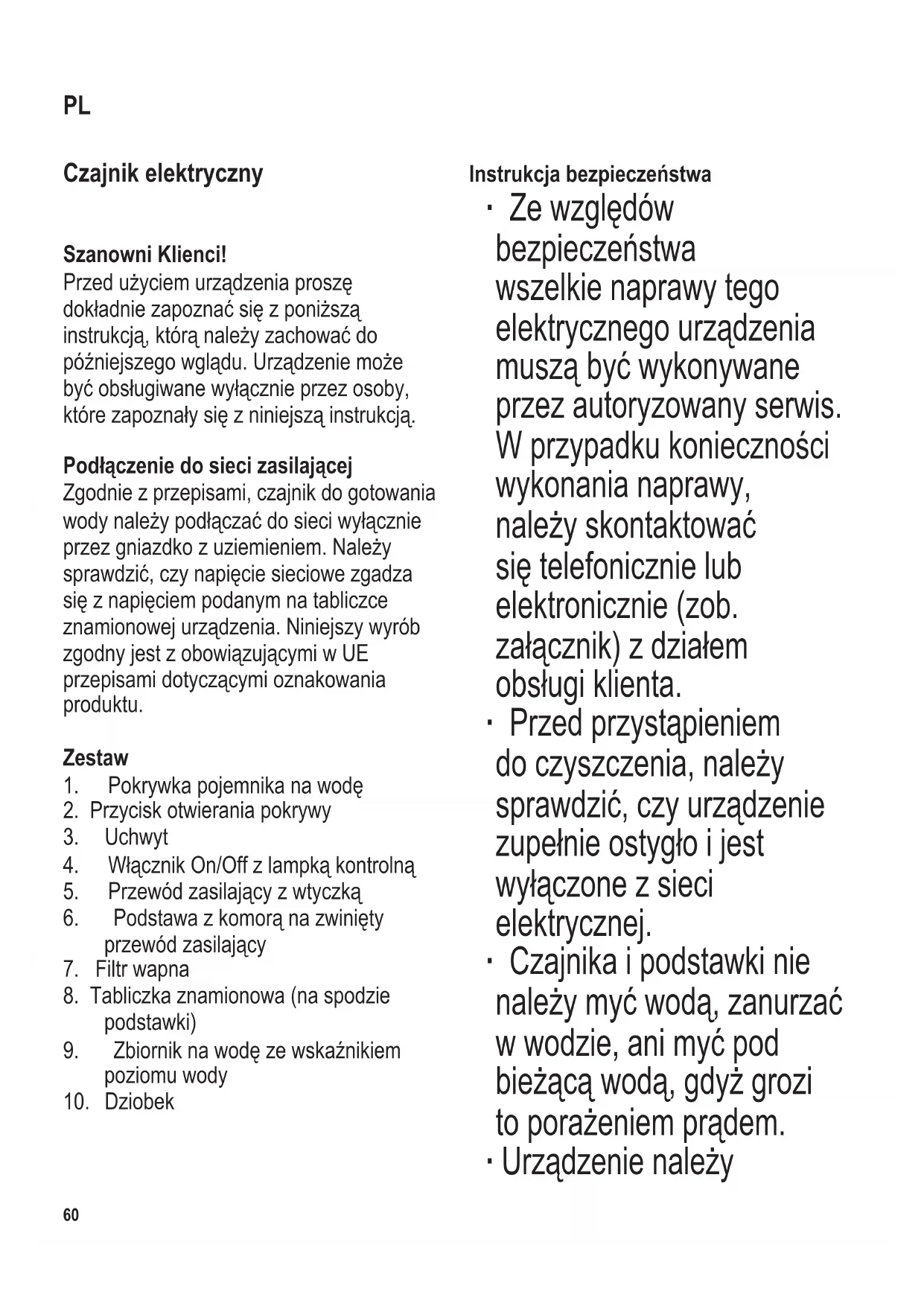 regularnieodkamieniać. W razie potrzeby pojemnik nawodęnależywyczyścić wilgotnąściereczką. ∙ Szczegółoweinformacje nt.czyszczeniaurządzenia znajdująsięwpunkcie Konserwacja i czyszczenie. ∙ Osoby o ograniczonych zdolnościachzycznych, czuciowych lub psychicznych albo nieposiadającestosownego doświadczenialubwiedzy, atakżedzieci(wwieku conajmniej8lat),mogą korzystaćzurządzenia, podwarunkiemżeznajdują siępodnadzoremlub zostałypoinstruowane,jak używaćurządzeniaisąw pełniświadomewszelkich zagrożeńiwymaganych środkówostrożności. ∙ Niedopuszczaćdo używaniaurządzeniajako zabawki przez dzieci. ∙ Niewolnopozwalać dzieciom na wykonywanie jakichkolwiek prac związanychbezpośrednio zkonserwacjąlub czyszczeniemurządzenia, ajeżelijuż,todzieckomusi miećconajmniej8latibyć nadzorowaneprzezosobę dorosłą. ∙ Niedopuszczaćdo urządzeniaijegoprzewodu zasilającegodzieciwwieku poniżej8lat. ∙ Urządzenieprzeznaczone jestdozastosowań domowych lub podobnych, jak np. w - kuchniach biurowych lub innych miejscach pracy; - agroturystyce; - hotelach, motelach itp. oraz innych podobnych lokalach (przez klientów); - pensjonatach.62 104 x 142 mm ∙ Korpusurządzenia rozgrzewasiędowysokiej temperatury w trakcie pracyipozostajegorący przezjakiśczaspojej zakończeniu. ∙ Nienależyzostawiać włączonegoczajnikabez nadzoru;używaćwyłącznie czystejwodyiuważać,aby przynapełnianiupojemnika poziom wody zawsze znajdowałsiępomiędzy oznaczeniami: minimum (0,5 l) / maksimum (1,7 l). Przepełnieniepojemnika groziwylaniemsięwrzątku zurządzenia. ∙ Należytakżeuważać,aby nieoparzyćsięgorącąparą wydobywającąsiępodczas gotowania.Niedotykać żadnychczęściurządzenia oprócz uchwytu. ∙ Ostrzeżenie: Podczas gotowaniaatakże wylewaniagorącejwody, pokrywka pojemnika na wodęmusibyćzamknięta. ∙ Korzystajączczajnika należyużywaćwyłącznie dostarczonej wraz z nim podstawki. ∙ Ostrożnie! Nie wolno zdejmowaćpojemnika nawodęzpodstawki (lubwymieniaćgo)kiedy urządzeniejestwłączone. ∙ Jeżelipojemnikustawiany jestwmiejscuinnymniżna podstawce,zwrócićuwagę, abyniemógłsiępoślizgnąć nagładkiejpowierzchni. ∙ Ostrzeżenie! Styk elektryczny na podstawie należychronićprzed pryskającąiprzelewającą sięwodą. ∙ Ostrzeżenie! Nieprawidłoweużytkowanie urządzeniamoże doprowadzićdopoważnych104 x 142 mm