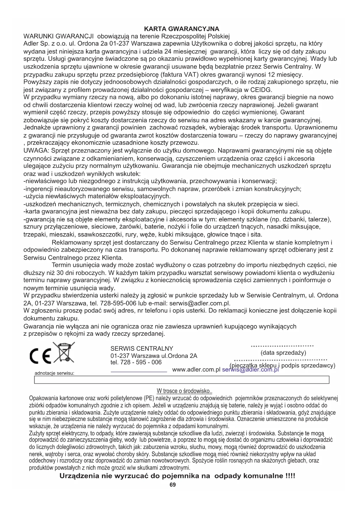 Минимално време за почивка между работните цикли: 3 минути ТЕХНИЧЕСКИ ДАННИ Максимално време за непрекъсната работа: 60 секунди ЗАБЕЛЕЖКА: Никога не потапяйте корпуса на блендера (1D) във вода или други течности. Мощност: 500W ЗАБЕЛЕЖКА: Не мийте частите на блендера в съдомиялни машини. Източник на захранване: 220-240V ~ 50/60Hz За да защитите околната си среда: моля, отделете картонените кутии и найлоновите торбички и ги изхвърлете в съответните кошчета за отпадъци. Използваният уред трябва да бъде доставен до специалните пунктове за събиране, които могат да повлияят на околната среда. Не изхвърляйте този уред в обикновен кош за отпадъци.69 Powyższy zapis nie dotyczy jednoosobowych działalności gospodarczych, o ile rodzaj zakupionego sprzętu, nie jest związany z profilem prowadzonej działalności gospodarczej – weryfikacja w CEIDG. W przypadku wymiany rzeczy na nową, albo po dokonaniu istotnej naprawy, okres gwarancji biegnie na nowo od chwili dostarczenia klientowi rzeczy wolnej od wad, lub zwrócenia rzeczy naprawionej. Jeżeli gwarant wymienił część rzeczy, przepis powyższy stosuje się odpowiednio do części wymienionej. Gwarant zobowiązuje się pokryć koszty dostarczenia rzeczy do serwisu na adres wskazany w karcie gwarancyjnej. Jednakże uprawniony z gwarancji powinien zachować rozsądek, wybierając środek transportu. Uprawnionemu z gwarancji nie przysługuje od gwaranta zwrot kosztów dostarczenia towaru – rzeczy do naprawy gwarancyjnej , przekraczający ekonomicznie uzasadnione koszty przewozu. -ingerencji nieautoryzowanego serwisu, samowolnych napraw, przeróbek i zmian konstrukcyjnych; W przypadku stwierdzenia usterki należy ją zgłosić w punkcie sprzedaży lub w Serwisie Centralnym, ul. Ordona 2A, 01-237 Warszawa, tel. 728-595-006 lub e-mail: serwis@adler.com.pl. -uszkodzeń mechanicznych, termicznych, chemicznych i powstałych na skutek przepięcia w sieci. UWAGA: Sprzęt przeznaczony jest wyłącznie do użytku domowego. Naprawami gwarancyjnymi nie są objęte czynności związane z odkamienianiem, konserwacją, czyszczeniem urządzenia oraz części i akcesoria ulegające zużyciu przy normalnym użytkowaniu. Gwarancja nie obejmuje mechanicznych uszkodzeń sprzętu oraz wad i uszkodzeń wynikłych wskutek: -gwarancją nie są objęte elementy eksploatacyjne i akcesoria w tym: elementy szklane (np. dzbanki, talerze), sznury przyłączeniowe, sieciowe, żarówki, baterie, nożyki i folie do urządzeń tnących, nasadki miksujące, trzepaki, mieszaki, ssawkoszczotki, rury, węże, kubki miksujące, głowice tnące i sita. WARUNKI GWARANCJI obowiązują na terenie Rzeczpospolitej Polskiej -użycia niewłaściwych materiałów eksploatacyjnych. W zgłoszeniu proszę podać swój adres, nr telefonu i opis usterki. Do reklamacji konieczne jest dołączenie kopii dokumentu zakupu. z przepisów o rękojmi za wady rzeczy sprzedanej. Gwarancja nie wyłącza ani nie ogranicza oraz nie zawiesza uprawnień kupującego wynikających Adler Sp. z o.o. ul. Ordona 2a 01-237 Warszawa zapewnia Użytkownika o dobrej jakości sprzętu, na który wydana jest niniejsza karta gwarancyjna i udziela 24 miesięcznej gwarancji, która liczy się od daty zakupu sprzętu. Usługi gwarancyjne świadczone są po okazaniu prawidłowo wypełnionej karty gwarancyjnej. Wady lub uszkodzenia sprzętu ujawnione w okresie gwarancji usuwane będą bezpłatnie przez Serwis Centralny. W przypadku zakupu sprzętu przez przedsiębiorcę (faktura VAT) okres gwarancji wynosi 12 miesięcy. Reklamowany sprzęt jest dostarczany do Serwisu Centralnego przez Klienta w stanie kompletnym i odpowiednio zabezpieczony na czas transportu. Po dokonanej naprawie reklamowany sprzęt odbierany jest z Serwisu Centralnego przez Klienta. Termin usunięcia wady może zostać wydłużony o czas potrzebny do importu niezbędnych części, nie dłuższy niż 30 dni roboczych. W każdym takim przypadku warsztat serwisowy powiadomi klienta o wydłużeniu terminu naprawy gwarancyjnej. W związku z koniecznością sprowadzenia części zamiennych i poinformuje o nowym terminie usunięcia wady. -niewłaściwego lub niezgodnego z instrukcją użytkowania, przechowywania i konserwacji; KARTA GWARANCYJNA -karta gwarancyjna jest nieważna bez daty zakupu, pieczęci sprzedającego i kopii dokumentu zakupu. SERWIS CENTRALNY 01-237 Warszawa ul.Ordona 2A tel. 728 - 595 - 006 www.adler.com.pl serwis@adler.com.pl (data sprzedaży) (pieczątka sklepu i podpis sprzedawcy) adnotacje serwisu: Urządzenia nie wyrzucać do pojemnika na odpady komunalne !!!! W trosce o środowisko.. Opakowania kartonowe oraz worki polietylenowe (PE) należy wrzucać do odpowiednich pojemników przeznaczonych do selektywnej zbiórki odpadów komunalnych zgodnie z ich opisem. Jeżeli w urządzeniu znajdują się baterie, należy je wyjąć i osobno oddać do punktu zbierania i składowania. Zużyte urządzenie należy oddać do odpowiedniego punktu zbierania i składowania, gdyż znajdujące się w nim niebezpieczne substancje mogą stanowić zagrożenie dla zdrowia i środowiska. Oznaczenie umieszczone na produkcie wskazuje, że urządzenia nie należy wyrzucać do pojemnika z odpadami komunalnymi. Zużyty sprzęt elektryczny, to odpady, które zawierają substancje szkodliwe dla ludzi, zwierząt i środowiska. Substancje te mogą doprowadzić do zanieczyszczenia gleby, wody lub powietrze, a poprzez to mogą się dostać do organizmu człowieka i doprowadz