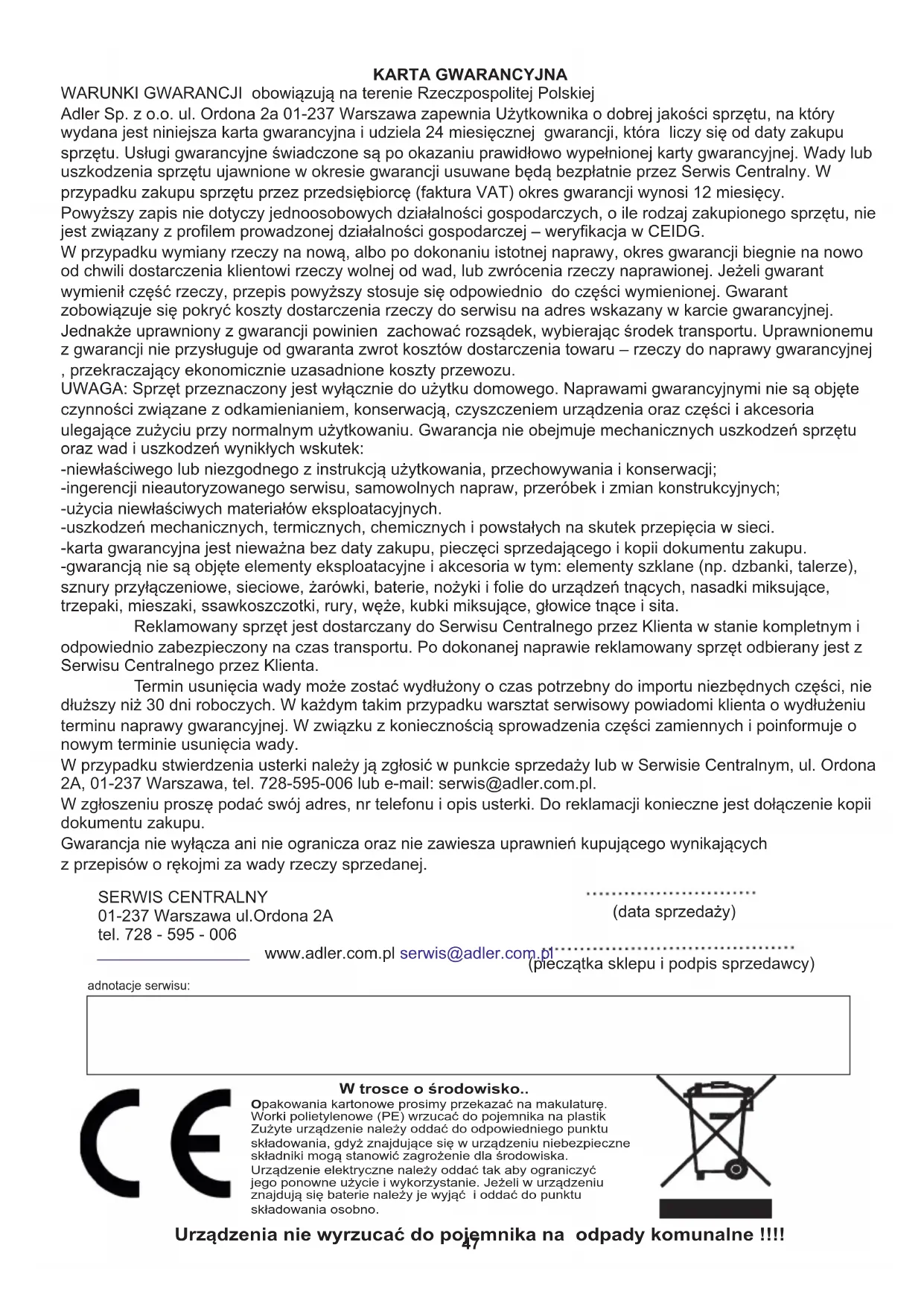 ﯾﺪﮭﺗ تﺎﻧﻮﻜﻤﻟا ﻞﻜﺸﺗ ﺪﻗ زﺎﮭﺠﻟا ﻲﻓ تﺎﯾرﺎﻄﺑ كﺎﻨھ نﺎﻛ اذإ .ﺎﮭﻣاﺪﺨﺘﺳاو ﺎﮭﻣاﺪﺨﺘﺳا ةدﺎﻋإ ،.ﻞﺼﻔﻨﻣ ﻞﻜﺸﺑ ﺔﻧﺰﺨﻤﻟا ﺔﻄﻘﻨﻟا ﻰﻟإ ﺎﮭﺋﺎﻄﻋإو ﺎﮭﺟاﺮﺧإ ﻚﯿﻠﻌﻓ47 KARTA GWARANCYJNA WARUNKI GWARANCJI obowiązują na terenie Rzeczpospolitej Polskiej Adler Sp. z o.o. ul. Ordona 2a 01-237 Warszawa zapewnia Użytkownika o dobrej jakości sprzętu, na który wydana jest niniejsza karta gwarancyjna i udziela 24 miesięcznej gwarancji, która liczy się od daty zakupu sprzętu. Usługi gwarancyjne świadczone są po okazaniu prawidłowo wypełnionej karty gwarancyjnej. Wady lub uszkodzenia sprzętu ujawnione w okresie gwarancji usuwane będą bezpłatnie przez Serwis Centralny. W przypadku zakupu sprzętu przez przedsiębiorcę (faktura VAT) okres gwarancji wynosi 12 miesięcy. Powyższy zapis nie dotyczy jednoosobowych działalności gospodarczych, o ile rodzaj zakupionego sprzętu, nie jest związany z profilem prowadzonej działalności gospodarczej – weryfikacja w CEIDG. W przypadku wymiany rzeczy na nową, albo po dokonaniu istotnej naprawy, okres gwarancji biegnie na nowo od chwili dostarczenia klientowi rzeczy wolnej od wad, lub zwrócenia rzeczy naprawionej. Jeżeli gwarant wymienił część rzeczy, przepis powyższy stosuje się odpowiednio do części wymienionej. Gwarant zobowiązuje się pokryć koszty dostarczenia rzeczy do serwisu na adres wskazany w karcie gwarancyjnej. Jednakże uprawniony z gwarancji powinien zachować rozsądek, wybierając środek transportu. Uprawnionemu z gwarancji nie przysługuje od gwaranta zwrot kosztów dostarczenia towaru – rzeczy do naprawy gwarancyjnej , przekraczający ekonomicznie uzasadnione koszty przewozu. UWAGA: Sprzęt przeznaczony jest wyłącznie do użytku domowego. Naprawami gwarancyjnymi nie są objęte czynności związane z odkamienianiem, konserwacją, czyszczeniem urządzenia oraz części i akcesoria ulegające zużyciu przy normalnym użytkowaniu. Gwarancja nie obejmuje mechanicznych uszkodzeń sprzętu oraz wad i uszkodzeń wynikłych wskutek: -niewłaściwego lub niezgodnego z instrukcją użytkowania, przechowywania i konserwacji; -ingerencji nieautoryzowanego serwisu, samowolnych napraw, przeróbek i zmian konstrukcyjnych; -użycia niewłaściwych materiałów eksploatacyjnych. -uszkodzeń mechanicznych, termicznych, chemicznych i powstałych na skutek przepięcia w sieci. -karta gwarancyjna jest nieważna bez daty zakupu, pieczęci sprzedającego i kopii dokumentu zakupu. -gwarancją nie są objęte elementy eksploatacyjne i akcesoria w tym: elementy szklane (np. dzbanki, talerze), sznury przyłączeniowe, sieciowe, żarówki, baterie, nożyki i folie do urządzeń tnących, nasadki miksujące, trzepaki, mieszaki, ssawkoszczotki, rury, węże, kubki miksujące, głowice tnące i sita. Reklamowany sprzęt jest dostarczany do Serwisu Centralnego przez Klienta w stanie kompletnym i odpowiednio zabezpieczony na czas transportu. Po dokonanej naprawie reklamowany sprzęt odbierany jest z Serwisu Centralnego przez Klienta. Termin usunięcia wady może zostać wydłużony o czas potrzebny do importu niezbędnych części, nie dłuższy niż 30 dni roboczych. W każdym takim przypadku warsztat serwisowy powiadomi klienta o wydłużeniu terminu naprawy gwarancyjnej. W związku z koniecznością sprowadzenia części zamiennych i poinformuje o nowym terminie usunięcia wady. W przypadku stwierdzenia usterki należy ją zgłosić w punkcie sprzedaży lub w Serwisie Centralnym, ul. Ordona 2A, 01-237 Warszawa, tel. 728-595-006 lub e-mail: serwis@adler.com.pl. W zgłoszeniu proszę podać swój adres, nr telefonu i opis usterki. Do reklamacji konieczne jest dołączenie kopii dokumentu zakupu. Gwarancja nie wyłącza ani nie ogranicza oraz nie zawiesza uprawnień kupującego wynikających z przepisów o rękojmi za wady rzeczy sprzedanej. SERWIS CENTRALNY 01-237 Warszawa ul.Ordona 2A tel. 728 - 595 - 006 www.adler.com.pl serwis@adler.com.pl (data sprzedaży) (pieczątka sklepu i podpis sprzedawcy) adnotacje serwisu: Urządzenia nie wyrzucać do pojemnika na odpady komunalne !!!! W trosce o środowisko.. Opakowania kartonowe prosimy przekazać na makulaturę.Worki polietylenowe (PE) wrzucać do pojemnika na plastikZużyte urządzenie należy oddać do odpowiedniego punktu składowania, gdyż znajdujące się w urządzeniu niebezpieczne składniki mogą stanowić zagrożenie dla środowiska. Urządzenie elektryczne należy oddać tak aby ograniczyćjego ponowne użycie i wykorzystanie. Jeżeli w urządzeniuznajdują się baterie należy je wyjąć i oddać do punktu składowania osobno.48 (PL) POLSKI