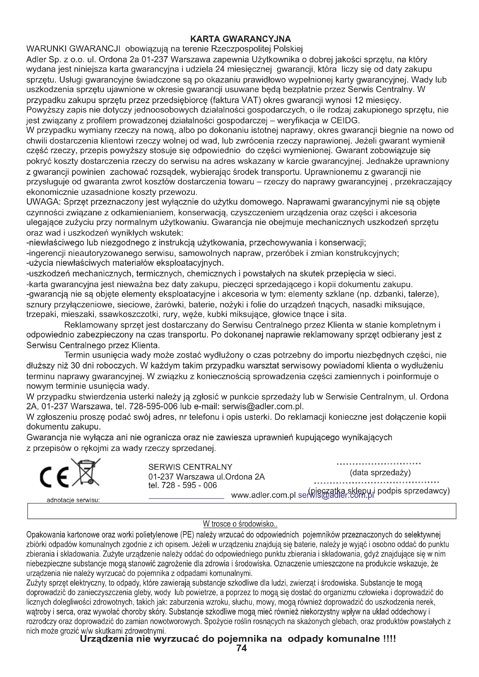 ЗАБЕЛЕЖКА: Можете да почистите капака (1A), капака на буркана (1B) и буркана на пасатора (1C) в съдомиялна машина. Не използвайте съдомиялна машина за почистване на двигателя (1H) и острието (1D). Минимално време за почивка между работните цикли: 5 минути За да защитите околната си среда: моля, отделете картонените кутии и найлоновите торбички и ги изхвърлете в съответните кошчета за отпадъци. Използваният уред трябва да бъде доставен до специалните пунктове за събиране, които могат да повлияят на околната среда. Не изхвърляйте този уред в обикновен кош за отпадъци.74 -ingerencji nieautoryzowanego serwisu, samowolnych napraw, przeróbek i zmian konstrukcyjnych; Reklamowany sprzęt jest dostarczany do Serwisu Centralnego przez Klienta w stanie kompletnym i odpowiednio zabezpieczony na czas transportu. Po dokonanej naprawie reklamowany sprzęt odbierany jest z Serwisu Centralnego przez Klienta. -uszkodzeń mechanicznych, termicznych, chemicznych i powstałych na skutek przepięcia w sieci. W przypadku wymiany rzeczy na nową, albo po dokonaniu istotnej naprawy, okres gwarancji biegnie na nowo od chwili dostarczenia klientowi rzeczy wolnej od wad, lub zwrócenia rzeczy naprawionej. Jeżeli gwarant wymienił część rzeczy, przepis powyższy stosuje się odpowiednio do części wymienionej. Gwarant zobowiązuje się pokryć koszty dostarczenia rzeczy do serwisu na adres wskazany w karcie gwarancyjnej. Jednakże uprawniony z gwarancji powinien zachować rozsądek, wybierając środek transportu. Uprawnionemu z gwarancji nie przysługuje od gwaranta zwrot kosztów dostarczenia towaru – rzeczy do naprawy gwarancyjnej , przekraczający ekonomicznie uzasadnione koszty przewozu. Termin usunięcia wady może zostać wydłużony o czas potrzebny do importu niezbędnych części, nie dłuższy niż 30 dni roboczych. W każdym takim przypadku warsztat serwisowy powiadomi klienta o wydłużeniu terminu naprawy gwarancyjnej. W związku z koniecznością sprowadzenia części zamiennych i poinformuje o nowym terminie usunięcia wady. W przypadku stwierdzenia usterki należy ją zgłosić w punkcie sprzedaży lub w Serwisie Centralnym, ul. Ordona 2A, 01-237 Warszawa, tel. 728-595-006 lub e-mail: serwis@adler.com.pl. W zgłoszeniu proszę podać swój adres, nr telefonu i opis usterki. Do reklamacji konieczne jest dołączenie kopii dokumentu zakupu. UWAGA: Sprzęt przeznaczony jest wyłącznie do użytku domowego. Naprawami gwarancyjnymi nie są objęte czynności związane z odkamienianiem, konserwacją, czyszczeniem urządzenia oraz części i akcesoria ulegające zużyciu przy normalnym użytkowaniu. Gwarancja nie obejmuje mechanicznych uszkodzeń sprzętu oraz wad i uszkodzeń wynikłych wskutek: -użycia niewłaściwych materiałów eksploatacyjnych. Adler Sp. z o.o. ul. Ordona 2a 01-237 Warszawa zapewnia Użytkownika o dobrej jakości sprzętu, na który wydana jest niniejsza karta gwarancyjna i udziela 24 miesięcznej gwarancji, która liczy się od daty zakupu sprzętu. Usługi gwarancyjne świadczone są po okazaniu prawidłowo wypełnionej karty gwarancyjnej. Wady lub uszkodzenia sprzętu ujawnione w okresie gwarancji usuwane będą bezpłatnie przez Serwis Centralny. W przypadku zakupu sprzętu przez przedsiębiorcę (faktura VAT) okres gwarancji wynosi 12 miesięcy. WARUNKI GWARANCJI obowiązują na terenie Rzeczpospolitej Polskiej KARTA GWARANCYJNA -niewłaściwego lub niezgodnego z instrukcją użytkowania, przechowywania i konserwacji; -karta gwarancyjna jest nieważna bez daty zakupu, pieczęci sprzedającego i kopii dokumentu zakupu. Powyższy zapis nie dotyczy jednoosobowych działalności gospodarczych, o ile rodzaj zakupionego sprzętu, nie jest związany z profilem prowadzonej działalności gospodarczej – weryfikacja w CEIDG. -gwarancją nie są objęte elementy eksploatacyjne i akcesoria w tym: elementy szklane (np. dzbanki, talerze), sznury przyłączeniowe, sieciowe, żarówki, baterie, nożyki i folie do urządzeń tnących, nasadki miksujące, trzepaki, mieszaki, ssawkoszczotki, rury, węże, kubki miksujące, głowice tnące i sita. z przepisów o rękojmi za wady rzeczy sprzedanej. Gwarancja nie wyłącza ani nie ogranicza oraz nie zawiesza uprawnień kupującego wynikających SERWIS CENTRALNY 01-237 Warszawa ul.Ordona 2A tel. 728 - 595 - 006 www.adler.com.pl serwis@adler.com.pl (data sprzedaży) (pieczątka sklepu i podpis sprzedawcy) adnotacje serwisu: Urządzenia nie wyrzucać do pojemnika na odpady komunalne !!!! Zużyty sprzęt elektryczny, to odpady, które zawierają substancje szkodliwe dla ludzi, zwierząt i środowiska. Substancje te mogą doprowadzić do zanieczyszczenia gleby, wody lub powietrze, a poprzez to mogą się dostać do organizmu człowieka i doprowadzić do licznych dolegliwości zdrowotnych, takich jak: zaburzenia wzroku, słuchu, mowy, mogą również doprowadzić do uszkodzenia nerek, wątroby i serca, oraz wywołać choroby skóry. Substancje szkodliwe mogą mieć również niekorzystny wpływ na układ oddechowy i rozrodczy oraz doprowadzić do zamian nowotworowych. Spożycie roślin rosnących na skażonych glebach, oraz produktów powstałych z nich może grozić w/w skutkami zdrowotnymi. W trosce o środowisko.. Opakowania kartonowe oraz worki polietylenowe (PE) należy wrzucać do odpowiednich pojemników przeznaczonych do selektywnej zbiórki odpadów komunalnych zgodnie z ich opisem. Jeżeli w urządzeniu znajdują się baterie, należy je wyjąć i osobno oddać do punktu zbierania i składo