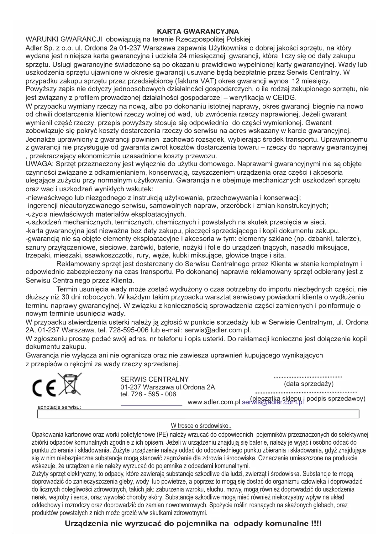 Asnjëherë mos e vendosni pjesën e motorit (1c) në ujë dhe mbajeni larg nga lagështia. Përpara pastrimit fikeni gjithmonë pajisjen dhe hiqeni nga priza. 2.Lani aksesorët e shkëputshëm në ujë me sapun, si boshti i blenderit, kamxhiku, tehu i grirës. Koha e pushimit para ripërdorimit të pajisjes: 3 min Për të mbrojtur mjedisin: ndani kartonat dhe qeset plastike dhe vendosini në kontejnerët e duhur të mbeturinave. Pajisja e përdorur duhet të dorëzohet në pika të veçanta grumbullimi që mund të ndikojnë në mjedis. Mos e hidhni këtë pajisje në mbeturina normale.73 WARUNKI GWARANCJI obowiązują na terenie Rzeczpospolitej Polskiej UWAGA: Sprzęt przeznaczony jest wyłącznie do użytku domowego. Naprawami gwarancyjnymi nie są objęte czynności związane z odkamienianiem, konserwacją, czyszczeniem urządzenia oraz części i akcesoria ulegające zużyciu przy normalnym użytkowaniu. Gwarancja nie obejmuje mechanicznych uszkodzeń sprzętu oraz wad i uszkodzeń wynikłych wskutek: Termin usunięcia wady może zostać wydłużony o czas potrzebny do importu niezbędnych części, nie dłuższy niż 30 dni roboczych. W każdym takim przypadku warsztat serwisowy powiadomi klienta o wydłużeniu terminu naprawy gwarancyjnej. W związku z koniecznością sprowadzenia części zamiennych i poinformuje o nowym terminie usunięcia wady. Powyższy zapis nie dotyczy jednoosobowych działalności gospodarczych, o ile rodzaj zakupionego sprzętu, nie jest związany z profilem prowadzonej działalności gospodarczej – weryfikacja w CEIDG. KARTA GWARANCYJNA -niewłaściwego lub niezgodnego z instrukcją użytkowania, przechowywania i konserwacji; -uszkodzeń mechanicznych, termicznych, chemicznych i powstałych na skutek przepięcia w sieci. -karta gwarancyjna jest nieważna bez daty zakupu, pieczęci sprzedającego i kopii dokumentu zakupu. -gwarancją nie są objęte elementy eksploatacyjne i akcesoria w tym: elementy szklane (np. dzbanki, talerze), sznury przyłączeniowe, sieciowe, żarówki, baterie, nożyki i folie do urządzeń tnących, nasadki miksujące, trzepaki, mieszaki, ssawkoszczotki, rury, węże, kubki miksujące, głowice tnące i sita. Reklamowany sprzęt jest dostarczany do Serwisu Centralnego przez Klienta w stanie kompletnym i odpowiednio zabezpieczony na czas transportu. Po dokonanej naprawie reklamowany sprzęt odbierany jest z Serwisu Centralnego przez Klienta. W przypadku stwierdzenia usterki należy ją zgłosić w punkcie sprzedaży lub w Serwisie Centralnym, ul. Ordona 2A, 01-237 Warszawa, tel. 728-595-006 lub e-mail: serwis@adler.com.pl. W zgłoszeniu proszę podać swój adres, nr telefonu i opis usterki. Do reklamacji konieczne jest dołączenie kopii dokumentu zakupu. z przepisów o rękojmi za wady rzeczy sprzedanej. Gwarancja nie wyłącza ani nie ogranicza oraz nie zawiesza uprawnień kupującego wynikających -użycia niewłaściwych materiałów eksploatacyjnych. Adler Sp. z o.o. ul. Ordona 2a 01-237 Warszawa zapewnia Użytkownika o dobrej jakości sprzętu, na który wydana jest niniejsza karta gwarancyjna i udziela 24 miesięcznej gwarancji, która liczy się od daty zakupu sprzętu. Usługi gwarancyjne świadczone są po okazaniu prawidłowo wypełnionej karty gwarancyjnej. Wady lub uszkodzenia sprzętu ujawnione w okresie gwarancji usuwane będą bezpłatnie przez Serwis Centralny. W przypadku zakupu sprzętu przez przedsiębiorcę (faktura VAT) okres gwarancji wynosi 12 miesięcy. -ingerencji nieautoryzowanego serwisu, samowolnych napraw, przeróbek i zmian konstrukcyjnych; W przypadku wymiany rzeczy na nową, albo po dokonaniu istotnej naprawy, okres gwarancji biegnie na nowo od chwili dostarczenia klientowi rzeczy wolnej od wad, lub zwrócenia rzeczy naprawionej. Jeżeli gwarant wymienił część rzeczy, przepis powyższy stosuje się odpowiednio do części wymienionej. Gwarant zobowiązuje się pokryć koszty dostarczenia rzeczy do serwisu na adres wskazany w karcie gwarancyjnej. Jednakże uprawniony z gwarancji powinien zachować rozsądek, wybierając środek transportu. Uprawnionemu z gwarancji nie przysługuje od gwaranta zwrot kosztów dostarczenia towaru – rzeczy do naprawy gwarancyjnej , przekraczający ekonomicznie uzasadnione koszty przewozu. SERWIS CENTRALNY 01-237 Warszawa ul.Ordona 2A tel. 728 - 595 - 006 www.adler.com.pl serwis@adler.com.pl (data sprzedaży) (pieczątka sklepu i podpis sprzedawcy) adnotacje serwisu: Urządzenia nie wyrzucać do pojemnika na odpady komunalne !!!! Zużyty sprzęt elektryczny, to odpady, które zawierają substancje szkodliwe dla ludzi, zwierząt i środowiska. Substancje te mogą doprowadzić do zanieczyszczenia gleby, wody lub powietrze, a poprzez to mogą się dostać do organizmu człowieka i doprowadzić do licznych dolegliwości zdrowotnych, takich jak: zaburzenia wzroku, słuchu, mowy, mogą również doprowadzić do uszkodzenia nerek, wątroby i serca, oraz wywołać choroby skóry. Substancje szkodliwe mogą mieć również niekorzystny wpływ na układ oddechowy i rozrodczy oraz doprowadzić do zamian nowotworowych. Spożycie roślin rosnących na skażonych glebach, oraz produktów powstałych z nich może grozić w/w skutkami zdrowotnymi. Opakowania kartonowe oraz worki polietylenowe (PE) należy wrzucać do odpowiednich pojemników przeznaczonych do selektywnej zbiórki odpadów komunalnych zgodnie z ich opisem. Jeżeli w urządzeniu znajdują się baterie, należy je wyjąć i osobno oddać do punktu zbierania i składowania. Zużyte urządzenie należy oddać do odpowiedniego punktu zbierania i składowania, gdyż znajdujące się w nim niebezpieczne substancje mogą stanowić zagrożenie dla zdrowia i środowiska. Oznaczenie umieszczone na produkcie wskazuje, że urządzenia nie należy wyrzucać do pojemnika z odpadami komunalnymi. W trosce o środowisko..74 POLSKI
