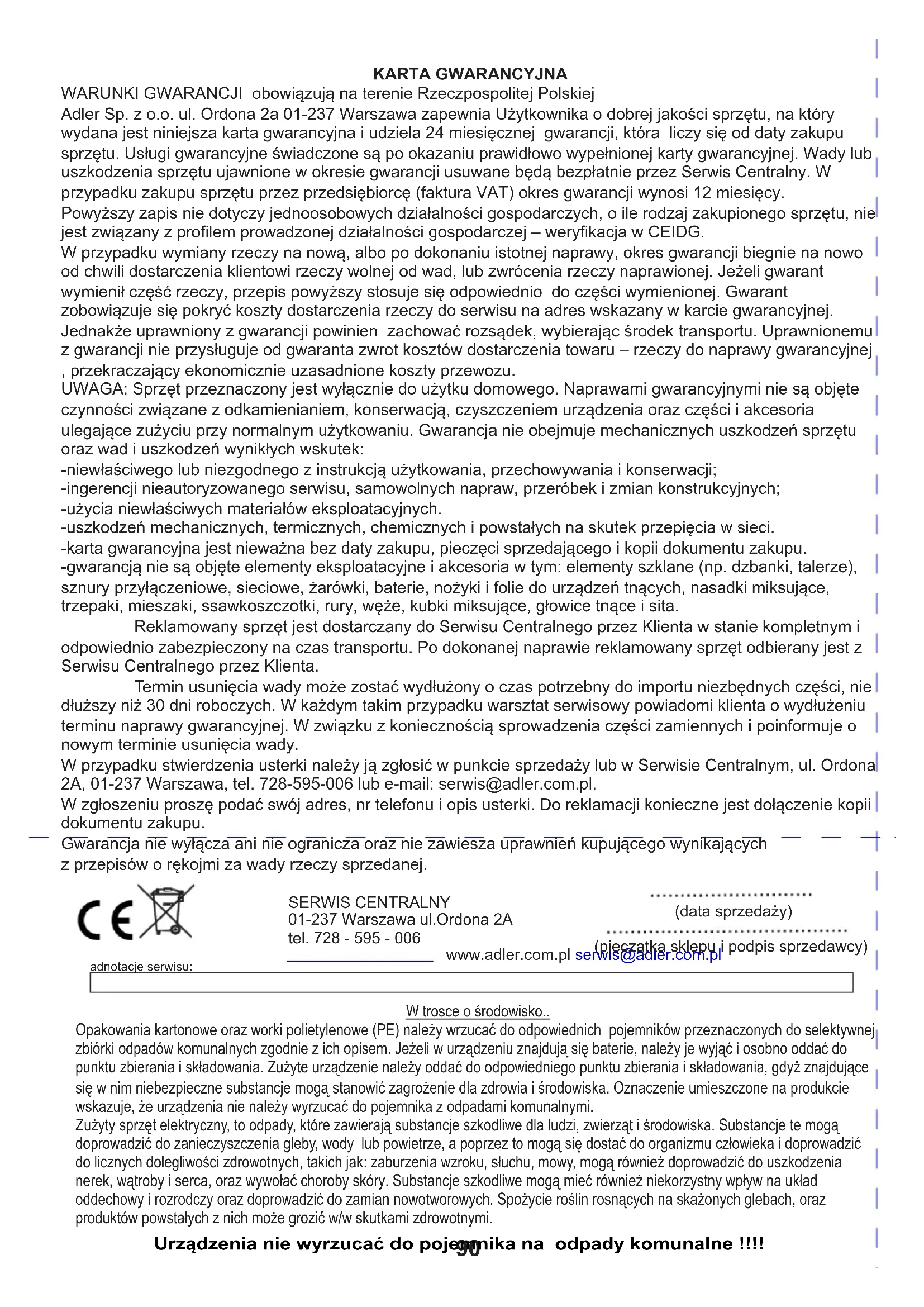 Пържени картофи: време 25 минути / температура 190 ˚C За да защитите околната си среда: моля, отделете картонените кутии и найлоновите торбички и ги изхвърлете в съответните кошчета за отпадъци. Използваният уред трябва да бъде доставен до специалните пунктове за събиране, които могат да повлияят на околната среда. Не изхвърляйте този уред в обикновен кош за отпадъци.90 Powyższy zapis nie dotyczy jednoosobowych działalności gospodarczych, o ile rodzaj zakupionego sprzętu, nie jest związany z profilem prowadzonej działalności gospodarczej – weryfikacja w CEIDG. W przypadku stwierdzenia usterki należy ją zgłosić w punkcie sprzedaży lub w Serwisie Centralnym, ul. Ordona 2A, 01-237 Warszawa, tel. 728-595-006 lub e-mail: serwis@adler.com.pl. W przypadku wymiany rzeczy na nową, albo po dokonaniu istotnej naprawy, okres gwarancji biegnie na nowo od chwili dostarczenia klientowi rzeczy wolnej od wad, lub zwrócenia rzeczy naprawionej. Jeżeli gwarant wymienił część rzeczy, przepis powyższy stosuje się odpowiednio do części wymienionej. Gwarant zobowiązuje się pokryć koszty dostarczenia rzeczy do serwisu na adres wskazany w karcie gwarancyjnej. Jednakże uprawniony z gwarancji powinien zachować rozsądek, wybierając środek transportu. Uprawnionemu z gwarancji nie przysługuje od gwaranta zwrot kosztów dostarczenia towaru – rzeczy do naprawy gwarancyjnej , przekraczający ekonomicznie uzasadnione koszty przewozu. KARTA GWARANCYJNA WARUNKI GWARANCJI obowiązują na terenie Rzeczpospolitej Polskiej UWAGA: Sprzęt przeznaczony jest wyłącznie do użytku domowego. Naprawami gwarancyjnymi nie są objęte czynności związane z odkamienianiem, konserwacją, czyszczeniem urządzenia oraz części i akcesoria ulegające zużyciu przy normalnym użytkowaniu. Gwarancja nie obejmuje mechanicznych uszkodzeń sprzętu oraz wad i uszkodzeń wynikłych wskutek: -użycia niewłaściwych materiałów eksploatacyjnych. -karta gwarancyjna jest nieważna bez daty zakupu, pieczęci sprzedającego i kopii dokumentu zakupu. -uszkodzeń mechanicznych, termicznych, chemicznych i powstałych na skutek przepięcia w sieci. Reklamowany sprzęt jest dostarczany do Serwisu Centralnego przez Klienta w stanie kompletnym i odpowiednio zabezpieczony na czas transportu. Po dokonanej naprawie reklamowany sprzęt odbierany jest z Serwisu Centralnego przez Klienta. -niewłaściwego lub niezgodnego z instrukcją użytkowania, przechowywania i konserwacji; Termin usunięcia wady może zostać wydłużony o czas potrzebny do importu niezbędnych części, nie dłuższy niż 30 dni roboczych. W każdym takim przypadku warsztat serwisowy powiadomi klienta o wydłużeniu terminu naprawy gwarancyjnej. W związku z koniecznością sprowadzenia części zamiennych i poinformuje o nowym terminie usunięcia wady. Adler Sp. z o.o. ul. Ordona 2a 01-237 Warszawa zapewnia Użytkownika o dobrej jakości sprzętu, na który wydana jest niniejsza karta gwarancyjna i udziela 24 miesięcznej gwarancji, która liczy się od daty zakupu sprzętu. Usługi gwarancyjne świadczone są po okazaniu prawidłowo wypełnionej karty gwarancyjnej. Wady lub uszkodzenia sprzętu ujawnione w okresie gwarancji usuwane będą bezpłatnie przez Serwis Centralny. W przypadku zakupu sprzętu przez przedsiębiorcę (faktura VAT) okres gwarancji wynosi 12 miesięcy. -gwarancją nie są objęte elementy eksploatacyjne i akcesoria w tym: elementy szklane (np. dzbanki, talerze), sznury przyłączeniowe, sieciowe, żarówki, baterie, nożyki i folie do urządzeń tnących, nasadki miksujące, trzepaki, mieszaki, ssawkoszczotki, rury, węże, kubki miksujące, głowice tnące i sita. W zgłoszeniu proszę podać swój adres, nr telefonu i opis usterki. Do reklamacji konieczne jest dołączenie kopii dokumentu zakupu. -ingerencji nieautoryzowanego serwisu, samowolnych napraw, przeróbek i zmian konstrukcyjnych; Gwarancja nie wyłącza ani nie ogranicza oraz nie zawiesza uprawnień kupującego wynikających z przepisów o rękojmi za wady rzeczy sprzedanej. SERWIS CENTRALNY 01-237 Warszawa ul.Ordona 2A tel. 728 - 595 - 006 www.adler.com.pl serwis@adler.com.pl (data sprzedaży) (pieczątka sklepu i podpis sprzedawcy) adnotacje serwisu: Urządzenia nie wyrzucać do pojemnika na odpady komunalne !!!! W trosce o środowisko.. Opakowania kartonowe oraz worki polietylenowe (PE) należy wrzucać do odpowiednich pojemników przeznaczonych do selektywnej zbiórki odpadów komunalnych zgodnie z ich opisem. Jeżeli w urządzeniu znajdują się baterie, należy je wyjąć i osobno oddać do punktu zbierania i składowania. Zużyte urządzenie należy oddać do odpowiedniego punktu zbierania i składowania, gdyż znajdujące się w nim niebezpieczne substancje mogą stanowić zagrożenie dla zdrowia i środowiska. Oznaczenie umieszczone na produkcie wskazuje, że urządzenia nie należy wyrzucać do pojemnika z odpadami komunalnymi. Zużyty sprzęt elektryczny, to odpady, które zawierają substancje szkodliwe dla ludzi, zwierząt i środowiska. Substancje te mogą doprowadzić do zanieczyszczenia gleby, wody lub powietrze, a poprzez to mogą się dostać do organizmu człowieka i doprowadzić do licznych dolegliwości zdrowotnych, takich jak: zaburzenia wzroku, słuchu, mowy, mogą również doprowadzić do uszkodzenia nerek, wątroby i serca, oraz wywołać choroby skóry. Substancje szkodliwe mogą mieć również niekorzystny wpływ na układ oddechowy i rozrodczy oraz doprowadzić do zamian nowotworowych. Spożycie roślin rosnących na skażonych glebach, oraz produktów powstałych z nich może grozić w/w skutkami zdrowotnymi.91 nadzorem osoby odpowiadającej z
