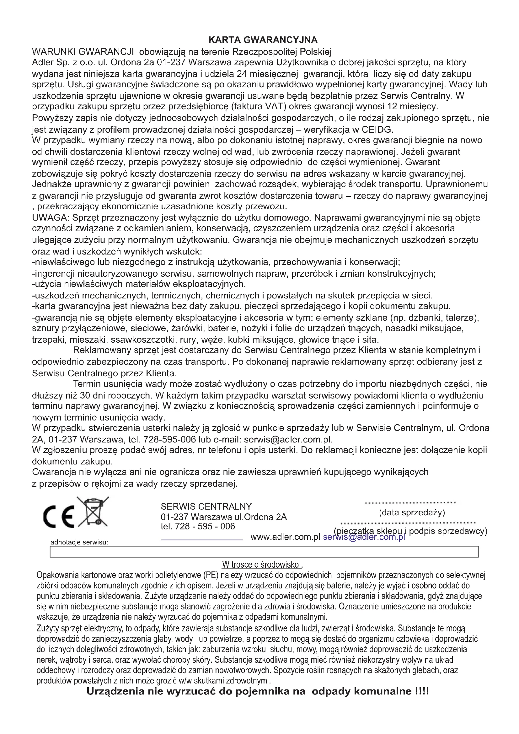 ﺪﯾﺪﮭﺗ تﺎﻧﻮﻜﻤﻟا ﻞﻜﺸﺗ ﺪﻗ زﺎﮭﺠﻟا ﻲﻓ تﺎﯾرﺎﻄﺑ كﺎﻨھ نﺎﻛ اذإ .ﺎﮭﻣاﺪﺨﺘﺳاو ﺎﮭﻣاﺪﺨﺘﺳا ةدﺎﻋإ ،.ﻞﺼﻔﻨﻣ ﻞﻜﺸﺑ ﺔﻧﺰﺨﻤﻟا ﺔﻄﻘﻨﻟا ﻰﻟإ ﺎﮭﺋﺎﻄﻋإو ﺎﮭﺟاﺮﺧإ ﻚﯿﻠﻌﻓ63 Powyższy zapis nie dotyczy jednoosobowych działalności gospodarczych, o ile rodzaj zakupionego sprzętu, nie jest związany z profilem prowadzonej działalności gospodarczej – weryfikacja w CEIDG. W przypadku wymiany rzeczy na nową, albo po dokonaniu istotnej naprawy, okres gwarancji biegnie na nowo od chwili dostarczenia klientowi rzeczy wolnej od wad, lub zwrócenia rzeczy naprawionej. Jeżeli gwarant wymienił część rzeczy, przepis powyższy stosuje się odpowiednio do części wymienionej. Gwarant zobowiązuje się pokryć koszty dostarczenia rzeczy do serwisu na adres wskazany w karcie gwarancyjnej. Jednakże uprawniony z gwarancji powinien zachować rozsądek, wybierając środek transportu. Uprawnionemu z gwarancji nie przysługuje od gwaranta zwrot kosztów dostarczenia towaru – rzeczy do naprawy gwarancyjnej , przekraczający ekonomicznie uzasadnione koszty przewozu. -gwarancją nie są objęte elementy eksploatacyjne i akcesoria w tym: elementy szklane (np. dzbanki, talerze), sznury przyłączeniowe, sieciowe, żarówki, baterie, nożyki i folie do urządzeń tnących, nasadki miksujące, trzepaki, mieszaki, ssawkoszczotki, rury, węże, kubki miksujące, głowice tnące i sita. -ingerencji nieautoryzowanego serwisu, samowolnych napraw, przeróbek i zmian konstrukcyjnych; -uszkodzeń mechanicznych, termicznych, chemicznych i powstałych na skutek przepięcia w sieci. W przypadku stwierdzenia usterki należy ją zgłosić w punkcie sprzedaży lub w Serwisie Centralnym, ul. Ordona 2A, 01-237 Warszawa, tel. 728-595-006 lub e-mail: serwis@adler.com.pl. Adler Sp. z o.o. ul. Ordona 2a 01-237 Warszawa zapewnia Użytkownika o dobrej jakości sprzętu, na który wydana jest niniejsza karta gwarancyjna i udziela 24 miesięcznej gwarancji, która liczy się od daty zakupu sprzętu. Usługi gwarancyjne świadczone są po okazaniu prawidłowo wypełnionej karty gwarancyjnej. Wady lub uszkodzenia sprzętu ujawnione w okresie gwarancji usuwane będą bezpłatnie przez Serwis Centralny. W przypadku zakupu sprzętu przez przedsiębiorcę (faktura VAT) okres gwarancji wynosi 12 miesięcy. UWAGA: Sprzęt przeznaczony jest wyłącznie do użytku domowego. Naprawami gwarancyjnymi nie są objęte czynności związane z odkamienianiem, konserwacją, czyszczeniem urządzenia oraz części i akcesoria ulegające zużyciu przy normalnym użytkowaniu. Gwarancja nie obejmuje mechanicznych uszkodzeń sprzętu oraz wad i uszkodzeń wynikłych wskutek: Reklamowany sprzęt jest dostarczany do Serwisu Centralnego przez Klienta w stanie kompletnym i odpowiednio zabezpieczony na czas transportu. Po dokonanej naprawie reklamowany sprzęt odbierany jest z Serwisu Centralnego przez Klienta. z przepisów o rękojmi za wady rzeczy sprzedanej. Gwarancja nie wyłącza ani nie ogranicza oraz nie zawiesza uprawnień kupującego wynikających -użycia niewłaściwych materiałów eksploatacyjnych. -karta gwarancyjna jest nieważna bez daty zakupu, pieczęci sprzedającego i kopii dokumentu zakupu. W zgłoszeniu proszę podać swój adres, nr telefonu i opis usterki. Do reklamacji konieczne jest dołączenie kopii dokumentu zakupu. KARTA GWARANCYJNA WARUNKI GWARANCJI obowiązują na terenie Rzeczpospolitej Polskiej -niewłaściwego lub niezgodnego z instrukcją użytkowania, przechowywania i konserwacji; Termin usunięcia wady może zostać wydłużony o czas potrzebny do importu niezbędnych części, nie dłuższy niż 30 dni roboczych. W każdym takim przypadku warsztat serwisowy powiadomi klienta o wydłużeniu terminu naprawy gwarancyjnej. W związku z koniecznością sprowadzenia części zamiennych i poinformuje o nowym terminie usunięcia wady. SERWIS CENTRALNY 01-237 Warszawa ul.Ordona 2A tel. 728 - 595 - 006 www.adler.com.pl serwis@adler.com.pl (data sprzedaży) (pieczątka sklepu i podpis sprzedawcy) adnotacje serwisu: Urządzenia nie wyrzucać do pojemnika na odpady komunalne !!!! Opakowania kartonowe oraz worki polietylenowe (PE) należy wrzucać do odpowiednich pojemników przeznaczonych do selektywnej zbiórki odpadów komunalnych zgodnie z ich opisem. Jeżeli w urządzeniu znajdują się baterie, należy je wyjąć i osobno oddać do punktu zbierania i składowania. Zużyte urządzenie należy oddać do odpowiedniego punktu zbierania i składowania, gdyż znajdujące się w nim niebezpieczne substancje mogą stanowić zagrożenie dla zdrowia i środowiska. Oznaczenie umieszczone na produkcie wskazuje, że urządzenia nie należy wyrzucać do pojemnika z odpadami komunalnymi. Zużyty sprzęt elektryczny, to odpady, które zawierają substancje szkodliwe dla ludzi, zwierząt i środowiska. Substancje te mogą doprowadzić do zanieczyszczenia gleby, wody lub powietrze, a poprzez to mogą się dostać do organizmu człowieka i doprowadzić do licznych dolegliwości zdrowotnych, takich jak: zaburzenia wzroku, słuchu, mowy, mogą również doprowadzić do uszkodzenia nerek, wątroby i serca, oraz wywołać choroby skóry. Substancje szkodliwe mogą mieć również niekorzystny wpływ na układ oddechowy i rozrodczy oraz doprowadzić do zamian nowotworowych. Spożycie roślin rosnących na skażonych glebach, oraz produktów powstałych z nich może grozić w/w skutkami zdrowotnymi. W trosce o środowisko..64 POLSKI