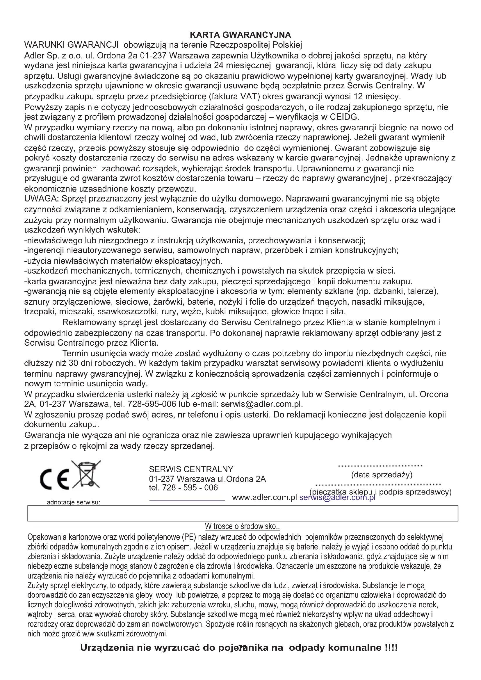 ЗАБЕЛЕЖКА: Устройството е горещо по време на работа. Не докосвайте плочите до скалпа или ръцете. За да защитите околната си среда: моля, отделете картонените кутии и найлоновите торбички и ги изхвърлете в съответните кошчета за отпадъци. Използваният уред трябва да бъде доставен до специалните пунктове за събиране, които могат да повлияят на околната среда. Не изхвърляйте този уред в обикновен кош за отпадъци.72 -karta gwarancyjna jest nieważna bez daty zakupu, pieczęci sprzedającego i kopii dokumentu zakupu. WARUNKI GWARANCJI obowiązują na terenie Rzeczpospolitej Polskiej Adler Sp. z o.o. ul. Ordona 2a 01-237 Warszawa zapewnia Użytkownika o dobrej jakości sprzętu, na który wydana jest niniejsza karta gwarancyjna i udziela 24 miesięcznej gwarancji, która liczy się od daty zakupu sprzętu. Usługi gwarancyjne świadczone są po okazaniu prawidłowo wypełnionej karty gwarancyjnej. Wady lub uszkodzenia sprzętu ujawnione w okresie gwarancji usuwane będą bezpłatnie przez Serwis Centralny. W przypadku zakupu sprzętu przez przedsiębiorcę (faktura VAT) okres gwarancji wynosi 12 miesięcy. Powyższy zapis nie dotyczy jednoosobowych działalności gospodarczych, o ile rodzaj zakupionego sprzętu, nie jest związany z profilem prowadzonej działalności gospodarczej – weryfikacja w CEIDG. W przypadku wymiany rzeczy na nową, albo po dokonaniu istotnej naprawy, okres gwarancji biegnie na nowo od chwili dostarczenia klientowi rzeczy wolnej od wad, lub zwrócenia rzeczy naprawionej. Jeżeli gwarant wymienił część rzeczy, przepis powyższy stosuje się odpowiednio do części wymienionej. Gwarant zobowiązuje się pokryć koszty dostarczenia rzeczy do serwisu na adres wskazany w karcie gwarancyjnej. Jednakże uprawniony z gwarancji powinien zachować rozsądek, wybierając środek transportu. Uprawnionemu z gwarancji nie przysługuje od gwaranta zwrot kosztów dostarczenia towaru – rzeczy do naprawy gwarancyjnej , przekraczający ekonomicznie uzasadnione koszty przewozu. UWAGA: Sprzęt przeznaczony jest wyłącznie do użytku domowego. Naprawami gwarancyjnymi nie są objęte czynności związane z odkamienianiem, konserwacją, czyszczeniem urządzenia oraz części i akcesoria ulegające zużyciu przy normalnym użytkowaniu. Gwarancja nie obejmuje mechanicznych uszkodzeń sprzętu oraz wad i uszkodzeń wynikłych wskutek: KARTA GWARANCYJNA -niewłaściwego lub niezgodnego z instrukcją użytkowania, przechowywania i konserwacji; -ingerencji nieautoryzowanego serwisu, samowolnych napraw, przeróbek i zmian konstrukcyjnych; -użycia niewłaściwych materiałów eksploatacyjnych. -uszkodzeń mechanicznych, termicznych, chemicznych i powstałych na skutek przepięcia w sieci. W przypadku stwierdzenia usterki należy ją zgłosić w punkcie sprzedaży lub w Serwisie Centralnym, ul. Ordona 2A, 01-237 Warszawa, tel. 728-595-006 lub e-mail: serwis@adler.com.pl. Termin usunięcia wady może zostać wydłużony o czas potrzebny do importu niezbędnych części, nie dłuższy niż 30 dni roboczych. W każdym takim przypadku warsztat serwisowy powiadomi klienta o wydłużeniu terminu naprawy gwarancyjnej. W związku z koniecznością sprowadzenia części zamiennych i poinformuje o nowym terminie usunięcia wady. -gwarancją nie są objęte elementy eksploatacyjne i akcesoria w tym: elementy szklane (np. dzbanki, talerze), sznury przyłączeniowe, sieciowe, żarówki, baterie, nożyki i folie do urządzeń tnących, nasadki miksujące, trzepaki, mieszaki, ssawkoszczotki, rury, węże, kubki miksujące, głowice tnące i sita. Reklamowany sprzęt jest dostarczany do Serwisu Centralnego przez Klienta w stanie kompletnym i odpowiednio zabezpieczony na czas transportu. Po dokonanej naprawie reklamowany sprzęt odbierany jest z Serwisu Centralnego przez Klienta. Gwarancja nie wyłącza ani nie ogranicza oraz nie zawiesza uprawnień kupującego wynikających W zgłoszeniu proszę podać swój adres, nr telefonu i opis usterki. Do reklamacji konieczne jest dołączenie kopii dokumentu zakupu. z przepisów o rękojmi za wady rzeczy sprzedanej. SERWIS CENTRALNY 01-237 Warszawa ul.Ordona 2A tel. 728 - 595 - 006 www.adler.com.pl serwis@adler.com.pl (data sprzedaży) (pieczątka sklepu i podpis sprzedawcy) adnotacje serwisu: Urządzenia nie wyrzucać do pojemnika na odpady komunalne !!!! W trosce o środowisko.. Opakowania kartonowe oraz worki polietylenowe (PE) należy wrzucać do odpowiednich pojemników przeznaczonych do selektywnej zbiórki odpadów komunalnych zgodnie z ich opisem. Jeżeli w urządzeniu znajdują się baterie, należy je wyjąć i osobno oddać do punktu zbierania i składowania. Zużyte urządzenie należy oddać do odpowiedniego punktu zbierania i składowania, gdyż znajdujące się w nim niebezpieczne substancje mogą stanowić zagrożenie dla zdrowia i środowiska. Oznaczenie umieszczone na produkcie wskazuje, że urządzenia nie należy wyrzucać do pojemnika z odpadami komunalnymi. Zużyty sprzęt elektryczny, to odpady, które zawierają substancje szkodliwe dla ludzi, zwierząt i środowiska. Substancje te mogą doprowadzić do zanieczyszczenia gleby, wody lub powietrze, a poprzez to mogą się dostać do organizmu człowieka i doprowadzić do licznych dolegliwości zdrowotnych, takich jak: zaburzenia wzroku, słuchu, mowy, mogą również doprowadzić do uszkodzenia nerek, wątroby i serca, oraz wywołać choroby skóry. Substancje szkodliwe mogą mieć również niekorzystny wpływ na układ oddechowy i rozrodczy oraz doprowadzić do zamian nowotworowych. Spożycie roślin rosnących na skażonych glebach, oraz produktów powstał