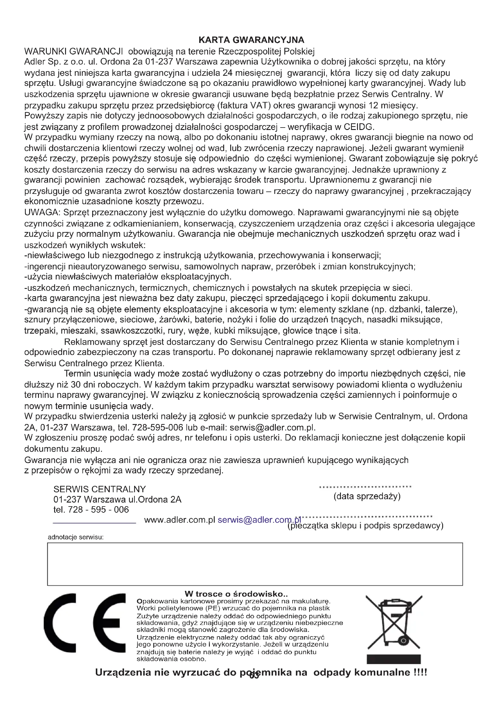 ﯾﺪﮭﺗ تﺎﻧﻮﻜﻤﻟا ﻞﻜﺸﺗ ﺪﻗ زﺎﮭﺠﻟا ﻲﻓ تﺎﯾرﺎﻄﺑ كﺎﻨھ نﺎﻛ اذإ .ﺎﮭﻣاﺪﺨﺘﺳاو ﺎﮭﻣاﺪﺨﺘﺳا ةدﺎﻋإ ،.ﻞﺼﻔﻨﻣ ﻞﻜﺸﺑ ﺔﻧﺰﺨﻤﻟا ﺔﻄﻘﻨﻟا ﻰﻟإ ﺎﮭﺋﺎﻄﻋإو ﺎﮭﺟاﺮﺧإ ﻚﯿﻠﻌﻓ63 KARTA GWARANCYJNA WARUNKI GWARANCJI obowiązują na terenie Rzeczpospolitej Polskiej Adler Sp. z o.o. ul. Ordona 2a 01-237 Warszawa zapewnia Użytkownika o dobrej jakości sprzętu, na który wydana jest niniejsza karta gwarancyjna i udziela 24 miesięcznej gwarancji, która liczy się od daty zakupu sprzętu. Usługi gwarancyjne świadczone są po okazaniu prawidłowo wypełnionej karty gwarancyjnej. Wady lub uszkodzenia sprzętu ujawnione w okresie gwarancji usuwane będą bezpłatnie przez Serwis Centralny. W przypadku zakupu sprzętu przez przedsiębiorcę (faktura VAT) okres gwarancji wynosi 12 miesięcy. Powyższy zapis nie dotyczy jednoosobowych działalności gospodarczych, o ile rodzaj zakupionego sprzętu, nie jest związany z profilem prowadzonej działalności gospodarczej – weryfikacja w CEIDG. W przypadku wymiany rzeczy na nową, albo po dokonaniu istotnej naprawy, okres gwarancji biegnie na nowo od chwili dostarczenia klientowi rzeczy wolnej od wad, lub zwrócenia rzeczy naprawionej. Jeżeli gwarant wymienił część rzeczy, przepis powyższy stosuje się odpowiednio do części wymienionej. Gwarant zobowiązuje się pokryć koszty dostarczenia rzeczy do serwisu na adres wskazany w karcie gwarancyjnej. Jednakże uprawniony z gwarancji powinien zachować rozsądek, wybierając środek transportu. Uprawnionemu z gwarancji nie przysługuje od gwaranta zwrot kosztów dostarczenia towaru – rzeczy do naprawy gwarancyjnej , przekraczający ekonomicznie uzasadnione koszty przewozu. UWAGA: Sprzęt przeznaczony jest wyłącznie do użytku domowego. Naprawami gwarancyjnymi nie są objęte czynności związane z odkamienianiem, konserwacją, czyszczeniem urządzenia oraz części i akcesoria ulegające zużyciu przy normalnym użytkowaniu. Gwarancja nie obejmuje mechanicznych uszkodzeń sprzętu oraz wad i uszkodzeń wynikłych wskutek: -niewłaściwego lub niezgodnego z instrukcją użytkowania, przechowywania i konserwacji; -ingerencji nieautoryzowanego serwisu, samowolnych napraw, przeróbek i zmian konstrukcyjnych; -użycia niewłaściwych materiałów eksploatacyjnych. -uszkodzeń mechanicznych, termicznych, chemicznych i powstałych na skutek przepięcia w sieci. -karta gwarancyjna jest nieważna bez daty zakupu, pieczęci sprzedającego i kopii dokumentu zakupu. -gwarancją nie są objęte elementy eksploatacyjne i akcesoria w tym: elementy szklane (np. dzbanki, talerze), sznury przyłączeniowe, sieciowe, żarówki, baterie, nożyki i folie do urządzeń tnących, nasadki miksujące, trzepaki, mieszaki, ssawkoszczotki, rury, węże, kubki miksujące, głowice tnące i sita. Reklamowany sprzęt jest dostarczany do Serwisu Centralnego przez Klienta w stanie kompletnym i odpowiednio zabezpieczony na czas transportu. Po dokonanej naprawie reklamowany sprzęt odbierany jest z Serwisu Centralnego przez Klienta. Termin usunięcia wady może zostać wydłużony o czas potrzebny do importu niezbędnych części, nie dłuższy niż 30 dni roboczych. W każdym takim przypadku warsztat serwisowy powiadomi klienta o wydłużeniu terminu naprawy gwarancyjnej. W związku z koniecznością sprowadzenia części zamiennych i poinformuje o nowym terminie usunięcia wady. W przypadku stwierdzenia usterki należy ją zgłosić w punkcie sprzedaży lub w Serwisie Centralnym, ul. Ordona 2A, 01-237 Warszawa, tel. 728-595-006 lub e-mail: serwis@adler.com.pl. W zgłoszeniu proszę podać swój adres, nr telefonu i opis usterki. Do reklamacji konieczne jest dołączenie kopii dokumentu zakupu. Gwarancja nie wyłącza ani nie ogranicza oraz nie zawiesza uprawnień kupującego wynikających z przepisów o rękojmi za wady rzeczy sprzedanej. SERWIS CENTRALNY 01-237 Warszawa ul.Ordona 2A tel. 728 - 595 - 006 www.adler.com.pl serwis@adler.com.pl (data sprzedaży) (pieczątka sklepu i podpis sprzedawcy) adnotacje serwisu: Urządzenia nie wyrzucać do pojemnika na odpady komunalne !!!! W trosce o środowisko.. Opakowania kartonowe prosimy przekazać na makulaturę.Worki polietylenowe (PE) wrzucać do pojemnika na plastikZużyte urządzenie należy oddać do odpowiedniego punktu składowania, gdyż znajdujące się w urządzeniu niebezpieczne składniki mogą stanowić zagrożenie dla środowiska. Urządzenie elektryczne należy oddać tak aby ograniczyćjego ponowne użycie i wykorzystanie. Jeżeli w urządzeniuznajdują się baterie należy je wyjąć i oddać do punktu składowania osobno.64 POLSKI