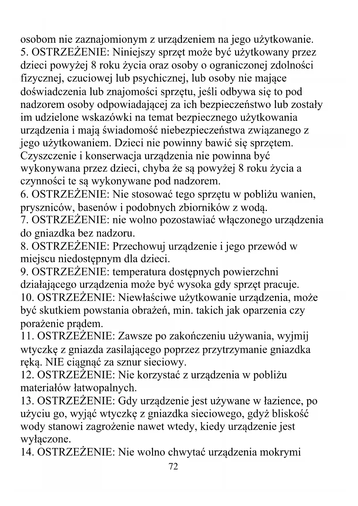 14. OSTRZEŻENIE: Nie wolno chwytać urządzenia mokrymi73