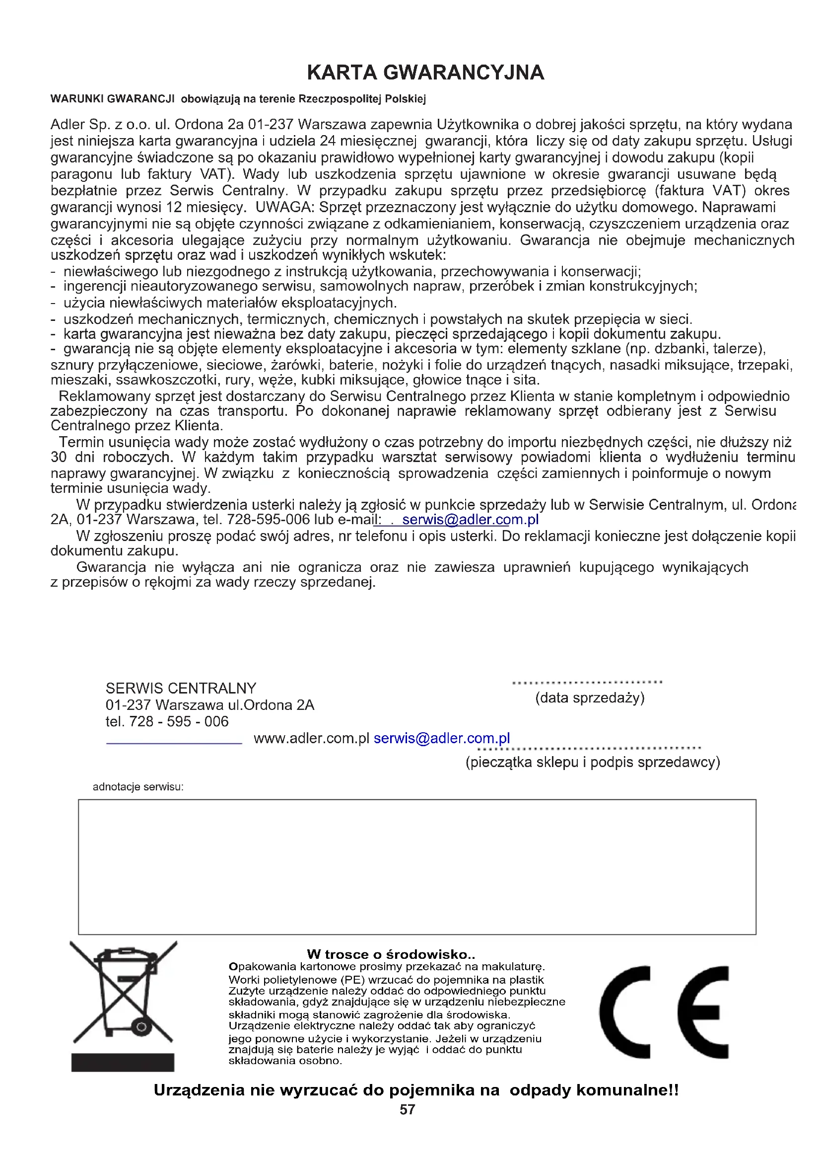 ТЕХНІЧНІ ДАНІ Потужність: 1800-2200 Вт Напруга: 220-240В ~50/60Гц У інтересах навколишнього середовища. Будь ласка, віддайте картонну упаковку в місце збору мукулатури. Політиленові мішки (PE) викинути в смітник для пластику. Відпрацьований пристрій повинен бути відправлений у відповідну точку зберігання, тому що в пристрої є небезпечні інгредієнти, які можуть становити загрозу навколишньому середовищу. Електричний пристрій потрібно повернути так, щоб обмежити його повторне використання. Якщо у пристрої є батерейки, то потрібно їх витягнути і віддати до відповідного пунтку.57 KARTA GWARANCYJNA WARUNKI GWARANCJI obowiązują na terenie Rzeczpospolitej Polskiej Adler Sp. z o.o. ul. Ordona 2a 01-237 Warszawa zapewnia Użytkownika o dobrej jakości sprzętu, na który wydana jest niniejsza karta gwarancyjna i udziela 24 miesięcznej gwarancji, która liczy się od daty zakupu sprzętu. Usługi gwarancyjne świadczone są po okazaniu prawidłowo wypełnionej karty gwarancyjnej i dowodu zakupu (kopii paragonu lub faktury VAT). Wady lub uszkodzenia sprzętu ujawnione w okresie gwarancji usuwane będą bezpłatnie przez Serwis Centralny. W przypadku zakupu sprzętu przez przedsiębiorcę (faktura VAT) okres gwarancji wynosi 12 miesięcy. UWAGA: Sprzęt przeznaczony jest wyłącznie do użytku domowego. Naprawami gwarancyjnymi nie są objęte czynności związane z odkamienianiem, konserwacją, czyszczeniem urządzenia oraz części i akcesoria ulegające zużyciu przy normalnym użytkowaniu. Gwarancja nie obejmuje mechanicznych uszkodzeń sprzętu oraz wad i uszkodzeń wynikłych wskutek: - niewłaściwego lub niezgodnego z instrukcją użytkowania, przechowywania i konserwacji; - ingerencji nieautoryzowanego serwisu, samowolnych napraw, przeróbek i zmian konstrukcyjnych; - użycia niewłaściwych materiałów eksploatacyjnych. - uszkodzeń mechanicznych, termicznych, chemicznych i powstałych na skutek przepięcia w sieci. - karta gwarancyjna jest nieważna bez daty zakupu, pieczęci sprzedającego i kopii dokumentu zakupu. - gwarancją nie są objęte elementy eksploatacyjne i akcesoria w tym: elementy szklane (np. dzbanki, talerze), sznury przyłączeniowe, sieciowe, żarówki, baterie, nożyki i folie do urządzeń tnących, nasadki miksujące, trzepaki, mieszaki, ssawkoszczotki, rury, węże, kubki miksujące, głowice tnące i sita. Reklamowany sprzęt jest dostarczany do Serwisu Centralnego przez Klienta w stanie kompletnym i odpowiednio zabezpieczony na czas transportu. Po dokonanej naprawie reklamowany sprzęt odbierany jest z Serwisu Centralnego przez Klienta. Termin usunięcia wady może zostać wydłużony o czas potrzebny do importu niezbędnych części, nie dłuższy niż 30 dni roboczych. W każdym takim przypadku warsztat serwisowy powiadomi klienta o wydłużeniu terminu naprawy gwarancyjnej. W związku z koniecznością sprowadzenia części zamiennych i poinformuje o nowym terminie usunięcia wady. W przypadku stwierdzenia usterki należy ją zgłosić w punkcie sprzedaży lub w Serwisie Centralnym, ul. Ordona 2A, 01-237 Warszawa, tel. 728-595-006 lub e-mail: . serwis@adler.com.pl W zgłoszeniu proszę podać swój adres, nr telefonu i opis usterki. Do reklamacji konieczne jest dołączenie kopii dokumentu zakupu. Gwarancja nie wyłącza ani nie ogranicza oraz nie zawiesza uprawnień kupującego wynikających z przepisów o rękojmi za wady rzeczy sprzedanej. SERWIS CENTRALNY 01-237 Warszawa ul.Ordona 2A tel. 728 - 595 - 006 www.adler.com.pl serwis@adler.com.pl (data sprzedaży) (pieczątka sklepu i podpis sprzedawcy) adnotacje serwisu: Urządzenia nie wyrzucać do pojemnika na odpady komunalne!! W trosce o środowisko.. Opakowania kartonowe prosimy przekazać na makulaturę.Worki polietylenowe (PE) wrzucać do pojemnika na plastikZużyte urządzenie należy oddać do odpowiedniego punktu składowania, gdyż znajdujące się w urządzeniu niebezpieczne składniki mogą stanowić zagrożenie dla środowiska. Urządzenie elektryczne należy oddać tak aby ograniczyćjego ponowne użycie i wykorzystanie. Jeżeli w urządzeniuznajdują się baterie należy je wyjąć i oddać do punktu składowania osobno.58 POLSKI