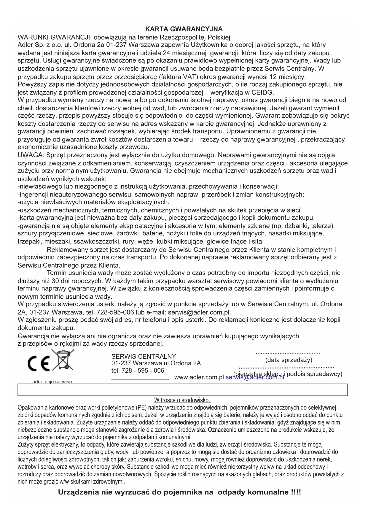 61Maksimum güc: 1400W Gərginlik: 220-240V~50Hz Ətraf mühiti qorumaq üçün: kartonları və plastik torbaları ayırın və müvafiq tullantı qablarına qoyun. İstifadə olunmuş cihaz ətraf mühitə təsir göstərə bilən xüsusi toplama məntəqələrinə çatdırılmalıdır. Bu cihazı adi zibilliyə atmayın. 62KARTA GWARANCYJNA WARUNKI GWARANCJI obowiązują na terenie Rzeczpospolitej Polskiej Adler Sp. z o.o. ul. Ordona 2a 01-237 Warszawa zapewnia Użytkownika o dobrej jakości sprzętu, na który wydana jest niniejsza karta gwarancyjna i udziela 24 miesięcznej gwarancji, która liczy się od daty zakupu sprzętu. Usługi gwarancyjne świadczone są po okazaniu prawidłowo wypełnionej karty gwarancyjnej. Wady lub uszkodzenia sprzętu ujawnione w okresie gwarancji usuwane będą bezpłatnie przez Serwis Centralny. W przypadku zakupu sprzętu przez przedsiębiorcę (faktura VAT) okres gwarancji wynosi 12 miesięcy. Powyższy zapis nie dotyczy jednoosobowych działalności gospodarczych, o ile rodzaj zakupionego sprzętu, nie jest związany z profilem prowadzonej działalności gospodarczej – weryfikacja w CEIDG. -gwarancją nie są objęte elementy eksploatacyjne i akcesoria w tym: elementy szklane (np. dzbanki, talerze), sznury przyłączeniowe, sieciowe, żarówki, baterie, nożyki i folie do urządzeń tnących, nasadki miksujące, trzepaki, mieszaki, ssawkoszczotki, rury, węże, kubki miksujące, głowice tnące i sita. Gwarancja nie wyłącza ani nie ogranicza oraz nie zawiesza uprawnień kupującego wynikających -niewłaściwego lub niezgodnego z instrukcją użytkowania, przechowywania i konserwacji; W zgłoszeniu proszę podać swój adres, nr telefonu i opis usterki. Do reklamacji konieczne jest dołączenie kopii dokumentu zakupu. -ingerencji nieautoryzowanego serwisu, samowolnych napraw, przeróbek i zmian konstrukcyjnych; -użycia niewłaściwych materiałów eksploatacyjnych. -karta gwarancyjna jest nieważna bez daty zakupu, pieczęci sprzedającego i kopii dokumentu zakupu. Reklamowany sprzęt jest dostarczany do Serwisu Centralnego przez Klienta w stanie kompletnym i odpowiednio zabezpieczony na czas transportu. Po dokonanej naprawie reklamowany sprzęt odbierany jest z Serwisu Centralnego przez Klienta. Termin usunięcia wady może zostać wydłużony o czas potrzebny do importu niezbędnych części, nie dłuższy niż 30 dni roboczych. W każdym takim przypadku warsztat serwisowy powiadomi klienta o wydłużeniu terminu naprawy gwarancyjnej. W związku z koniecznością sprowadzenia części zamiennych i poinformuje o nowym terminie usunięcia wady. W przypadku stwierdzenia usterki należy ją zgłosić w punkcie sprzedaży lub w Serwisie Centralnym, ul. Ordona 2A, 01-237 Warszawa, tel. 728-595-006 lub e-mail: serwis@adler.com.pl. UWAGA: Sprzęt przeznaczony jest wyłącznie do użytku domowego. Naprawami gwarancyjnymi nie są objęte czynności związane z odkamienianiem, konserwacją, czyszczeniem urządzenia oraz części i akcesoria ulegające zużyciu przy normalnym użytkowaniu. Gwarancja nie obejmuje mechanicznych uszkodzeń sprzętu oraz wad i uszkodzeń wynikłych wskutek: z przepisów o rękojmi za wady rzeczy sprzedanej. -uszkodzeń mechanicznych, termicznych, chemicznych i powstałych na skutek przepięcia w sieci. W przypadku wymiany rzeczy na nową, albo po dokonaniu istotnej naprawy, okres gwarancji biegnie na nowo od chwili dostarczenia klientowi rzeczy wolnej od wad, lub zwrócenia rzeczy naprawionej. Jeżeli gwarant wymienił część rzeczy, przepis powyższy stosuje się odpowiednio do części wymienionej. Gwarant zobowiązuje się pokryć koszty dostarczenia rzeczy do serwisu na adres wskazany w karcie gwarancyjnej. Jednakże uprawniony z gwarancji powinien zachować rozsądek, wybierając środek transportu. Uprawnionemu z gwarancji nie przysługuje od gwaranta zwrot kosztów dostarczenia towaru – rzeczy do naprawy gwarancyjnej , przekraczający ekonomicznie uzasadnione koszty przewozu. SERWIS CENTRALNY 01-237 Warszawa ul.Ordona 2A tel. 728 - 595 - 006 www.adler.com.pl serwis@adler.com.pl (data sprzedaży) (pieczątka sklepu i podpis sprzedawcy) adnotacje serwisu: Urządzenia nie wyrzucać do pojemnika na odpady komunalne !!!! W trosce o środowisko.. Opakowania kartonowe oraz worki polietylenowe (PE) należy wrzucać do odpowiednich pojemników przeznaczonych do selektywnej zbiórki odpadów komunalnych zgodnie z ich opisem. Jeżeli w urządzeniu znajdują się baterie, należy je wyjąć i osobno oddać do punktu zbierania i składowania. Zużyte urządzenie należy oddać do odpowiedniego punktu zbierania i składowania, gdyż znajdujące się w nim niebezpieczne substancje mogą stanowić zagrożenie dla zdrowia i środowiska. Oznaczenie umieszczone na produkcie wskazuje, że urządzenia nie należy wyrzucać do pojemnika z odpadami komunalnymi. Zużyty sprzęt elektryczny, to odpady, które zawierają substancje szkodliwe dla ludzi, zwierząt i środowiska. Substancje te mogą doprowadzić do zanieczyszczenia gleby, wody lub powietrze, a poprzez to mogą się dostać do organizmu człowieka i doprowadzić do licznych dolegliwości zdrowotnych, takich jak: zaburzenia wzroku, słuchu, mowy, mogą również doprowadzić do uszkodzenia nerek, wątroby i serca, oraz wywołać choroby skóry. Substancje szkodliwe mogą mieć również niekorzystny wpływ na układ oddechowy i rozrodczy oraz doprowadzić do zamian nowotworowych. Spożycie roślin rosnących na skażonych glebach, oraz produktów powstałych z nich może grozić w/w skutkami zdrowotnymi.POLSKI