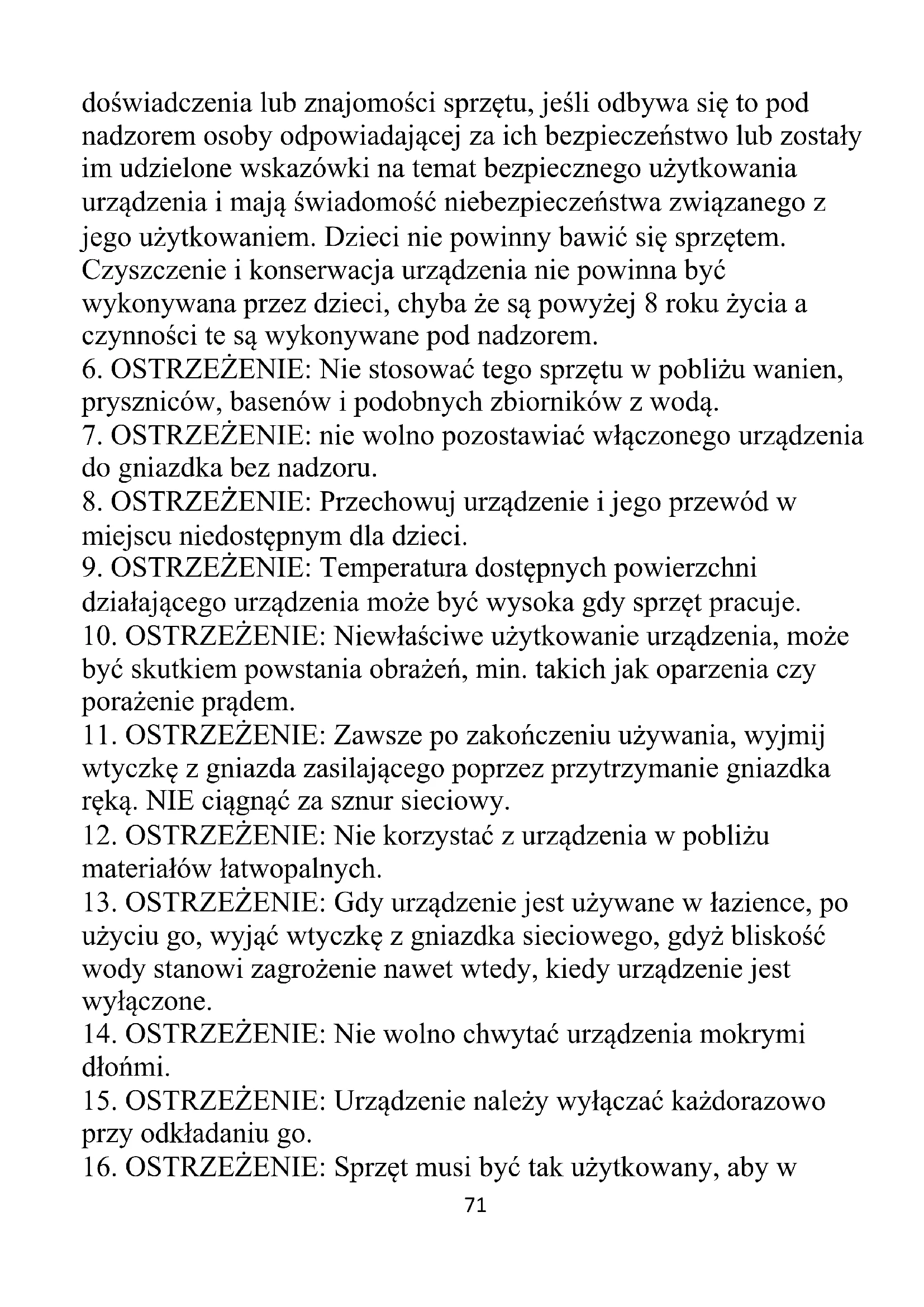 dzieci powyżej 8 roku życia oraz osoby o ograniczonej zdolności fizycznej, czuciowej lub psychicznej, lub osoby nie mające71 doświadczenia lub znajomości sprzętu, jeśli odbywa się to pod nadzorem osoby odpowiadającej za ich bezpieczeństwo lub zostały im udzielone wskazówki na temat bezpiecznego użytkowania urządzenia i mają świadomość niebezpieczeństwa związanego z jego użytkowaniem. Dzieci nie powinny bawić się sprzętem. Czyszczenie i konserwacja urządzenia nie powinna być wykonywana przez dzieci, chyba że są powyżej 8 roku życia a czynności te są wykonywane pod nadzorem.