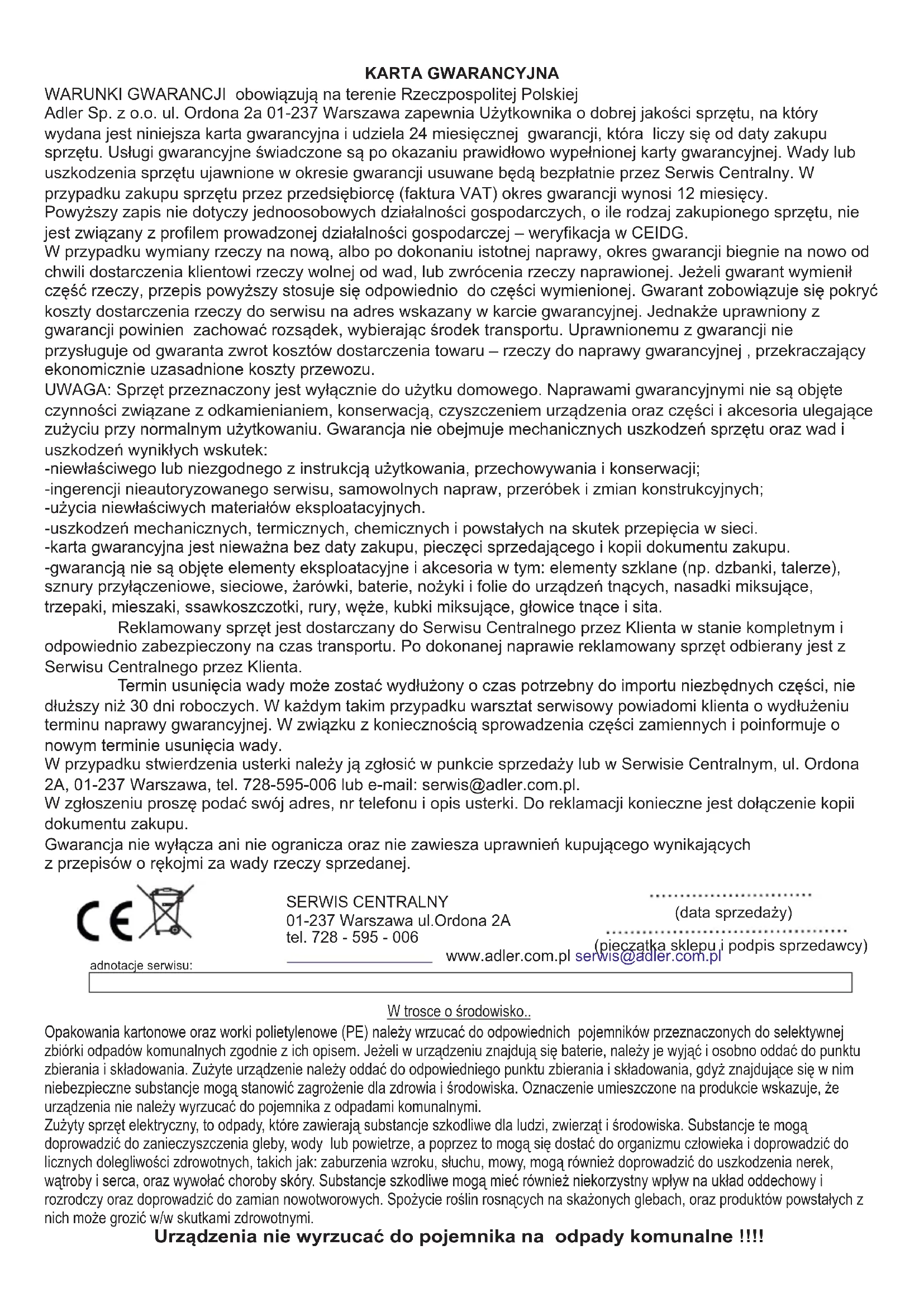 - студен въздух ТЕХНИЧЕСКИ ДАННИ ИЗПОЛЗВАНЕ НА УСТРОЙСТВОТО ПОЧИСТВАНЕ И ПОДДРЪЖКА 2. Мръсният корпус се почиства с мокра мека кърпа, след което се избърсва, за да изсъхне. Не използвайте никакви агресивни почистващи препарати. За да защитите околната си среда: моля, отделете картонените кутии и найлоновите торбички и ги изхвърлете в съответните кошчета за отпадъци. Използваният уред трябва да бъде доставен до специалните пунктове за събиране, които могат да повлияят на околната среда. Не изхвърляйте този уред в обикновен кош за отпадъци.61 Adler Sp. z o.o. ul. Ordona 2a 01-237 Warszawa zapewnia Użytkownika o dobrej jakości sprzętu, na który wydana jest niniejsza karta gwarancyjna i udziela 24 miesięcznej gwarancji, która liczy się od daty zakupu sprzętu. Usługi gwarancyjne świadczone są po okazaniu prawidłowo wypełnionej karty gwarancyjnej. Wady lub uszkodzenia sprzętu ujawnione w okresie gwarancji usuwane będą bezpłatnie przez Serwis Centralny. W przypadku zakupu sprzętu przez przedsiębiorcę (faktura VAT) okres gwarancji wynosi 12 miesięcy. KARTA GWARANCYJNA -niewłaściwego lub niezgodnego z instrukcją użytkowania, przechowywania i konserwacji; W przypadku wymiany rzeczy na nową, albo po dokonaniu istotnej naprawy, okres gwarancji biegnie na nowo od chwili dostarczenia klientowi rzeczy wolnej od wad, lub zwrócenia rzeczy naprawionej. Jeżeli gwarant wymienił część rzeczy, przepis powyższy stosuje się odpowiednio do części wymienionej. Gwarant zobowiązuje się pokryć koszty dostarczenia rzeczy do serwisu na adres wskazany w karcie gwarancyjnej. Jednakże uprawniony z gwarancji powinien zachować rozsądek, wybierając środek transportu. Uprawnionemu z gwarancji nie przysługuje od gwaranta zwrot kosztów dostarczenia towaru – rzeczy do naprawy gwarancyjnej , przekraczający ekonomicznie uzasadnione koszty przewozu. -ingerencji nieautoryzowanego serwisu, samowolnych napraw, przeróbek i zmian konstrukcyjnych; -gwarancją nie są objęte elementy eksploatacyjne i akcesoria w tym: elementy szklane (np. dzbanki, talerze), sznury przyłączeniowe, sieciowe, żarówki, baterie, nożyki i folie do urządzeń tnących, nasadki miksujące, trzepaki, mieszaki, ssawkoszczotki, rury, węże, kubki miksujące, głowice tnące i sita. WARUNKI GWARANCJI obowiązują na terenie Rzeczpospolitej Polskiej W przypadku stwierdzenia usterki należy ją zgłosić w punkcie sprzedaży lub w Serwisie Centralnym, ul. Ordona 2A, 01-237 Warszawa, tel. 728-595-006 lub e-mail: serwis@adler.com.pl. z przepisów o rękojmi za wady rzeczy sprzedanej. Powyższy zapis nie dotyczy jednoosobowych działalności gospodarczych, o ile rodzaj zakupionego sprzętu, nie jest związany z profilem prowadzonej działalności gospodarczej – weryfikacja w CEIDG. Reklamowany sprzęt jest dostarczany do Serwisu Centralnego przez Klienta w stanie kompletnym i odpowiednio zabezpieczony na czas transportu. Po dokonanej naprawie reklamowany sprzęt odbierany jest z Serwisu Centralnego przez Klienta. -karta gwarancyjna jest nieważna bez daty zakupu, pieczęci sprzedającego i kopii dokumentu zakupu. -użycia niewłaściwych materiałów eksploatacyjnych. Termin usunięcia wady może zostać wydłużony o czas potrzebny do importu niezbędnych części, nie dłuższy niż 30 dni roboczych. W każdym takim przypadku warsztat serwisowy powiadomi klienta o wydłużeniu terminu naprawy gwarancyjnej. W związku z koniecznością sprowadzenia części zamiennych i poinformuje o nowym terminie usunięcia wady. W zgłoszeniu proszę podać swój adres, nr telefonu i opis usterki. Do reklamacji konieczne jest dołączenie kopii dokumentu zakupu. -uszkodzeń mechanicznych, termicznych, chemicznych i powstałych na skutek przepięcia w sieci. UWAGA: Sprzęt przeznaczony jest wyłącznie do użytku domowego. Naprawami gwarancyjnymi nie są objęte czynności związane z odkamienianiem, konserwacją, czyszczeniem urządzenia oraz części i akcesoria ulegające zużyciu przy normalnym użytkowaniu. Gwarancja nie obejmuje mechanicznych uszkodzeń sprzętu oraz wad i uszkodzeń wynikłych wskutek: Gwarancja nie wyłącza ani nie ogranicza oraz nie zawiesza uprawnień kupującego wynikających SERWIS CENTRALNY 01-237 Warszawa ul.Ordona 2A tel. 728 - 595 - 006 www.adler.com.pl serwis@adler.com.pl (data sprzedaży) (pieczątka sklepu i podpis sprzedawcy) adnotacje serwisu: Urządzenia nie wyrzucać do pojemnika na odpady komunalne !!!! W trosce o środowisko.. Zużyty sprzęt elektryczny, to odpady, które zawierają substancje szkodliwe dla ludzi, zwierząt i środowiska. Substancje te mogą doprowadzić do zanieczyszczenia gleby, wody lub powietrze, a poprzez to mogą się dostać do organizmu człowieka i doprowadzić do licznych dolegliwości zdrowotnych, takich jak: zaburzenia wzroku, słuchu, mowy, mogą również doprowadzić do uszkodzenia nerek, wątroby i serca, oraz wywołać choroby skóry. Substancje szkodliwe mogą mieć również niekorzystny wpływ na układ oddechowy i rozrodczy oraz doprowadzić do zamian nowotworowych. Spożycie roślin rosnących na skażonych glebach, oraz produktów powstałych z nich może grozić w/w skutkami zdrowotnymi. Opakowania kartonowe oraz worki polietylenowe (PE) należy wrzucać do odpowiednich pojemników przeznaczonych do selektywnej zbiórki odpadów komunalnych zgodnie z ich opisem. Jeżeli w urządzeniu znajdują się baterie, należy je wyjąć i osobno oddać do punktu zbierania i składowania. Zużyte urządzenie nale