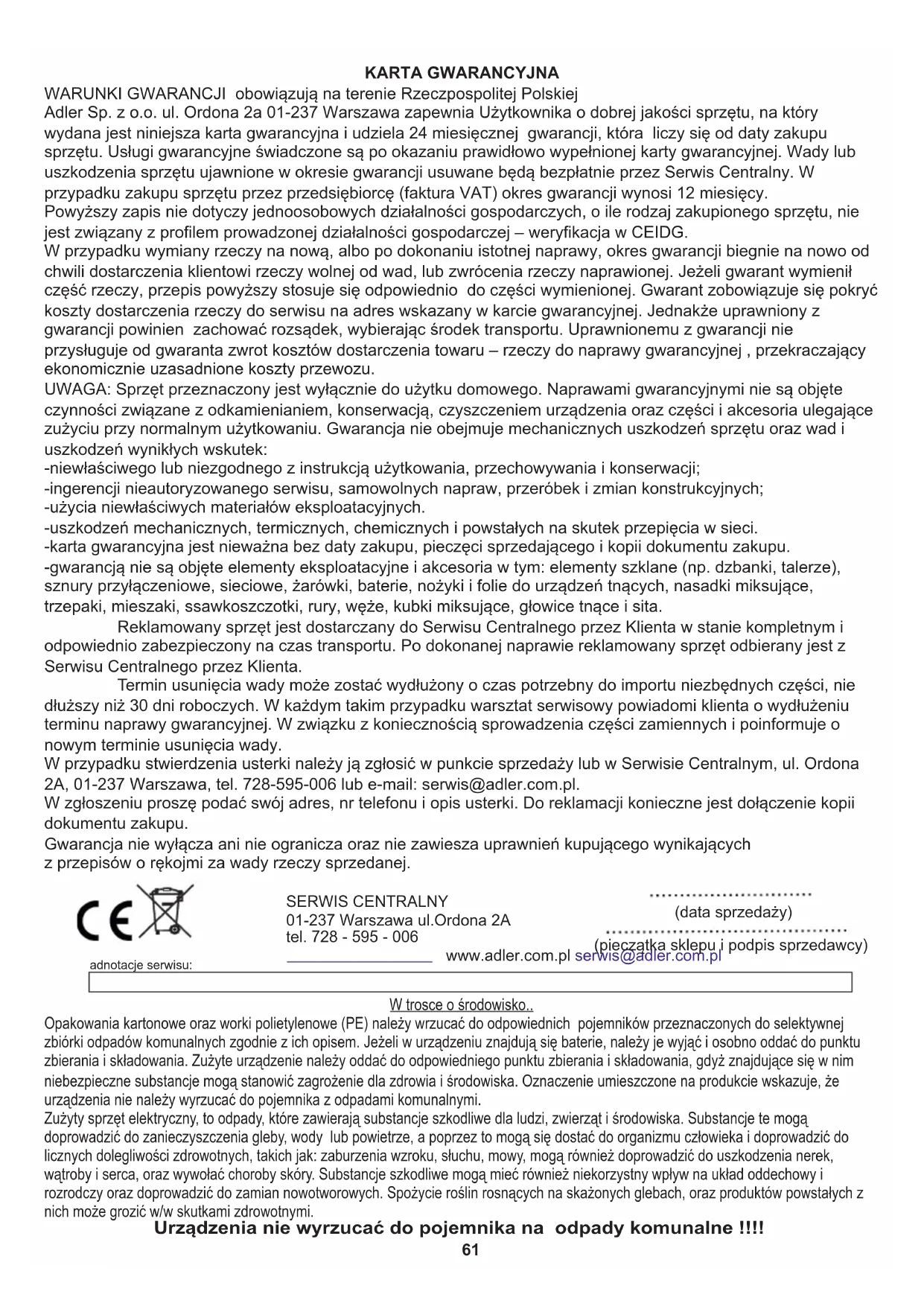 За да защитите околната си среда: моля, отделете картонените кутии и найлоновите торбички и ги изхвърлете в съответните кошчета за отпадъци. Използваният уред трябва да бъде доставен до специалните пунктове за събиране, които могат да повлияят на околната среда. Не изхвърляйте този уред в обикновен кош за отпадъци.61 Powyższy zapis nie dotyczy jednoosobowych działalności gospodarczych, o ile rodzaj zakupionego sprzętu, nie jest związany z profilem prowadzonej działalności gospodarczej – weryfikacja w CEIDG. -uszkodzeń mechanicznych, termicznych, chemicznych i powstałych na skutek przepięcia w sieci. -karta gwarancyjna jest nieważna bez daty zakupu, pieczęci sprzedającego i kopii dokumentu zakupu. W przypadku wymiany rzeczy na nową, albo po dokonaniu istotnej naprawy, okres gwarancji biegnie na nowo od chwili dostarczenia klientowi rzeczy wolnej od wad, lub zwrócenia rzeczy naprawionej. Jeżeli gwarant wymienił część rzeczy, przepis powyższy stosuje się odpowiednio do części wymienionej. Gwarant zobowiązuje się pokryć koszty dostarczenia rzeczy do serwisu na adres wskazany w karcie gwarancyjnej. Jednakże uprawniony z gwarancji powinien zachować rozsądek, wybierając środek transportu. Uprawnionemu z gwarancji nie przysługuje od gwaranta zwrot kosztów dostarczenia towaru – rzeczy do naprawy gwarancyjnej , przekraczający ekonomicznie uzasadnione koszty przewozu. -niewłaściwego lub niezgodnego z instrukcją użytkowania, przechowywania i konserwacji; Adler Sp. z o.o. ul. Ordona 2a 01-237 Warszawa zapewnia Użytkownika o dobrej jakości sprzętu, na który wydana jest niniejsza karta gwarancyjna i udziela 24 miesięcznej gwarancji, która liczy się od daty zakupu sprzętu. Usługi gwarancyjne świadczone są po okazaniu prawidłowo wypełnionej karty gwarancyjnej. Wady lub uszkodzenia sprzętu ujawnione w okresie gwarancji usuwane będą bezpłatnie przez Serwis Centralny. W przypadku zakupu sprzętu przez przedsiębiorcę (faktura VAT) okres gwarancji wynosi 12 miesięcy. UWAGA: Sprzęt przeznaczony jest wyłącznie do użytku domowego. Naprawami gwarancyjnymi nie są objęte czynności związane z odkamienianiem, konserwacją, czyszczeniem urządzenia oraz części i akcesoria ulegające zużyciu przy normalnym użytkowaniu. Gwarancja nie obejmuje mechanicznych uszkodzeń sprzętu oraz wad i uszkodzeń wynikłych wskutek: -użycia niewłaściwych materiałów eksploatacyjnych. -gwarancją nie są objęte elementy eksploatacyjne i akcesoria w tym: elementy szklane (np. dzbanki, talerze), sznury przyłączeniowe, sieciowe, żarówki, baterie, nożyki i folie do urządzeń tnących, nasadki miksujące, trzepaki, mieszaki, ssawkoszczotki, rury, węże, kubki miksujące, głowice tnące i sita. KARTA GWARANCYJNA WARUNKI GWARANCJI obowiązują na terenie Rzeczpospolitej Polskiej -ingerencji nieautoryzowanego serwisu, samowolnych napraw, przeróbek i zmian konstrukcyjnych; Reklamowany sprzęt jest dostarczany do Serwisu Centralnego przez Klienta w stanie kompletnym i odpowiednio zabezpieczony na czas transportu. Po dokonanej naprawie reklamowany sprzęt odbierany jest z Serwisu Centralnego przez Klienta. W przypadku stwierdzenia usterki należy ją zgłosić w punkcie sprzedaży lub w Serwisie Centralnym, ul. Ordona 2A, 01-237 Warszawa, tel. 728-595-006 lub e-mail: serwis@adler.com.pl. Gwarancja nie wyłącza ani nie ogranicza oraz nie zawiesza uprawnień kupującego wynikających W zgłoszeniu proszę podać swój adres, nr telefonu i opis usterki. Do reklamacji konieczne jest dołączenie kopii dokumentu zakupu. z przepisów o rękojmi za wady rzeczy sprzedanej. Termin usunięcia wady może zostać wydłużony o czas potrzebny do importu niezbędnych części, nie dłuższy niż 30 dni roboczych. W każdym takim przypadku warsztat serwisowy powiadomi klienta o wydłużeniu terminu naprawy gwarancyjnej. W związku z koniecznością sprowadzenia części zamiennych i poinformuje o nowym terminie usunięcia wady. SERWIS CENTRALNY 01-237 Warszawa ul.Ordona 2A tel. 728 - 595 - 006 www.adler.com.pl serwis@adler.com.pl (data sprzedaży) (pieczątka sklepu i podpis sprzedawcy) adnotacje serwisu: Urządzenia nie wyrzucać do pojemnika na odpady komunalne !!!! Opakowania kartonowe oraz worki polietylenowe (PE) należy wrzucać do odpowiednich pojemników przeznaczonych do selektywnej zbiórki odpadów komunalnych zgodnie z ich opisem. Jeżeli w urządzeniu znajdują się baterie, należy je wyjąć i osobno oddać do punktu zbierania i składowania. Zużyte urządzenie należy oddać do odpowiedniego punktu zbierania i składowania, gdyż znajdujące się w nim niebezpieczne substancje mogą stanowić zagrożenie dla zdrowia i środowiska. Oznaczenie umieszczone na produkcie wskazuje, że urządzenia nie należy wyrzucać do pojemnika z odpadami komunalnymi. Zużyty sprzęt elektryczny, to odpady, które zawierają substancje szkodliwe dla ludzi, zwierząt i środowiska. Substancje te mogą doprowadzić do zanieczyszczenia gleby, wody lub powietrze, a poprzez to mogą się dostać do organizmu człowieka i doprowadzić do licznych dolegliwości zdrowotnych, takich jak: zaburzenia wzroku, słuchu, mowy, mogą również doprowadzić do uszkodzenia nerek, wątroby i serca, oraz wywołać choroby skóry. Substancje szkodliwe mogą mieć również niekorzystny wpływ na układ oddechowy i rozrodczy oraz doprowadzić do zamian nowotworowych. Spożycie roślin rosnących na skażonych glebach, oraz produktów powstałych z nich może grozić w/w skutkami zdrowotnymi. W trosce o środowisko..62 POLSKI