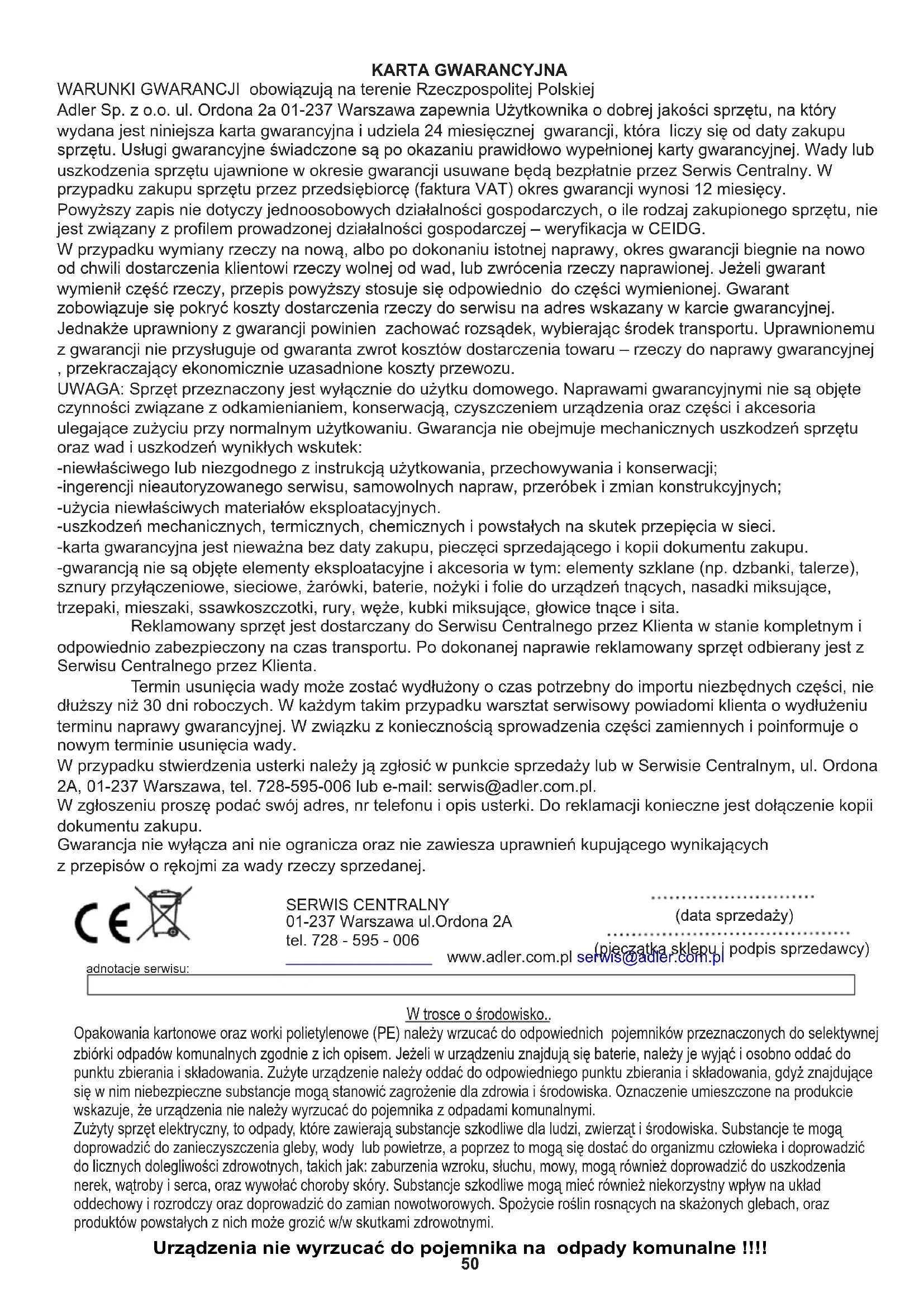 Стъпка 1. Поставете везната върху твърда, равна повърхност (избягвайте килимите и меките повърхности). Стъпка 3. Внимателно стъпвайте върху скалата. Застанете равномерно на кантара и не се движете, докато индикаторът ви за тегло на екрана не се промени и той ще се заключи. Изберете мерни единици Когато се отклоните от скалата, машината автоматично ще се изключи. Везната се изключва автоматично, когато екранът показва “0.0” или същия индикатор за тегло за 20 секунди. Натиснете бутона, за да промените мерните единици (2) в долната част на скалата. Стъпка 2. Натиснете везната, машината ще се включи автоматично. Изчакайте да се появи екранът "0". Почистване и поддръжка Внимателно избършете кантара със суха или леко влажна кърпа. Метричната система ще се промени на Великобритания или обратно. На екрана ще се покаже текущата единица. Автоматично изключване За да защитите околната си среда: моля, отделете картонените кутии и найлоновите торбички и ги изхвърлете в съответните кошчета за отпадъци. Използваният уред трябва да бъде доставен до специалните пунктове за събиране, които могат да повлияят на околната среда. Не изхвърляйте този уред в обикновен кош за отпадъци.50 KARTA GWARANCYJNA Powyższy zapis nie dotyczy jednoosobowych działalności gospodarczych, o ile rodzaj zakupionego sprzętu, nie jest związany z profilem prowadzonej działalności gospodarczej – weryfikacja w CEIDG. Reklamowany sprzęt jest dostarczany do Serwisu Centralnego przez Klienta w stanie kompletnym i odpowiednio zabezpieczony na czas transportu. Po dokonanej naprawie reklamowany sprzęt odbierany jest z Serwisu Centralnego przez Klienta. WARUNKI GWARANCJI obowiązują na terenie Rzeczpospolitej Polskiej Adler Sp. z o.o. ul. Ordona 2a 01-237 Warszawa zapewnia Użytkownika o dobrej jakości sprzętu, na który wydana jest niniejsza karta gwarancyjna i udziela 24 miesięcznej gwarancji, która liczy się od daty zakupu sprzętu. Usługi gwarancyjne świadczone są po okazaniu prawidłowo wypełnionej karty gwarancyjnej. Wady lub uszkodzenia sprzętu ujawnione w okresie gwarancji usuwane będą bezpłatnie przez Serwis Centralny. W przypadku zakupu sprzętu przez przedsiębiorcę (faktura VAT) okres gwarancji wynosi 12 miesięcy. -ingerencji nieautoryzowanego serwisu, samowolnych napraw, przeróbek i zmian konstrukcyjnych; UWAGA: Sprzęt przeznaczony jest wyłącznie do użytku domowego. Naprawami gwarancyjnymi nie są objęte czynności związane z odkamienianiem, konserwacją, czyszczeniem urządzenia oraz części i akcesoria ulegające zużyciu przy normalnym użytkowaniu. Gwarancja nie obejmuje mechanicznych uszkodzeń sprzętu oraz wad i uszkodzeń wynikłych wskutek: -niewłaściwego lub niezgodnego z instrukcją użytkowania, przechowywania i konserwacji; -użycia niewłaściwych materiałów eksploatacyjnych. W przypadku wymiany rzeczy na nową, albo po dokonaniu istotnej naprawy, okres gwarancji biegnie na nowo od chwili dostarczenia klientowi rzeczy wolnej od wad, lub zwrócenia rzeczy naprawionej. Jeżeli gwarant wymienił część rzeczy, przepis powyższy stosuje się odpowiednio do części wymienionej. Gwarant zobowiązuje się pokryć koszty dostarczenia rzeczy do serwisu na adres wskazany w karcie gwarancyjnej. Jednakże uprawniony z gwarancji powinien zachować rozsądek, wybierając środek transportu. Uprawnionemu z gwarancji nie przysługuje od gwaranta zwrot kosztów dostarczenia towaru – rzeczy do naprawy gwarancyjnej , przekraczający ekonomicznie uzasadnione koszty przewozu. -uszkodzeń mechanicznych, termicznych, chemicznych i powstałych na skutek przepięcia w sieci. -gwarancją nie są objęte elementy eksploatacyjne i akcesoria w tym: elementy szklane (np. dzbanki, talerze), sznury przyłączeniowe, sieciowe, żarówki, baterie, nożyki i folie do urządzeń tnących, nasadki miksujące, trzepaki, mieszaki, ssawkoszczotki, rury, węże, kubki miksujące, głowice tnące i sita. W przypadku stwierdzenia usterki należy ją zgłosić w punkcie sprzedaży lub w Serwisie Centralnym, ul. Ordona 2A, 01-237 Warszawa, tel. 728-595-006 lub e-mail: serwis@adler.com.pl. Termin usunięcia wady może zostać wydłużony o czas potrzebny do importu niezbędnych części, nie dłuższy niż 30 dni roboczych. W każdym takim przypadku warsztat serwisowy powiadomi klienta o wydłużeniu terminu naprawy gwarancyjnej. W związku z koniecznością sprowadzenia części zamiennych i poinformuje o nowym terminie usunięcia wady. Gwarancja nie wyłącza ani nie ogranicza oraz nie zawiesza uprawnień kupującego wynikających z przepisów o rękojmi za wady rzeczy sprzedanej. W zgłoszeniu proszę podać swój adres, nr telefonu i opis usterki. Do reklamacji konieczne jest dołączenie kopii dokumentu zakupu. -karta gwarancyjna jest nieważna bez daty zakupu, pieczęci sprzedającego i kopii dokumentu zakupu. SERWIS CENTRALNY 01-237 Warszawa ul.Ordona 2A tel. 728 - 595 - 006 www.adler.com.pl serwis@adler.com.pl (data sprzedaży) (pieczątka sklepu i podpis sprzedaw
