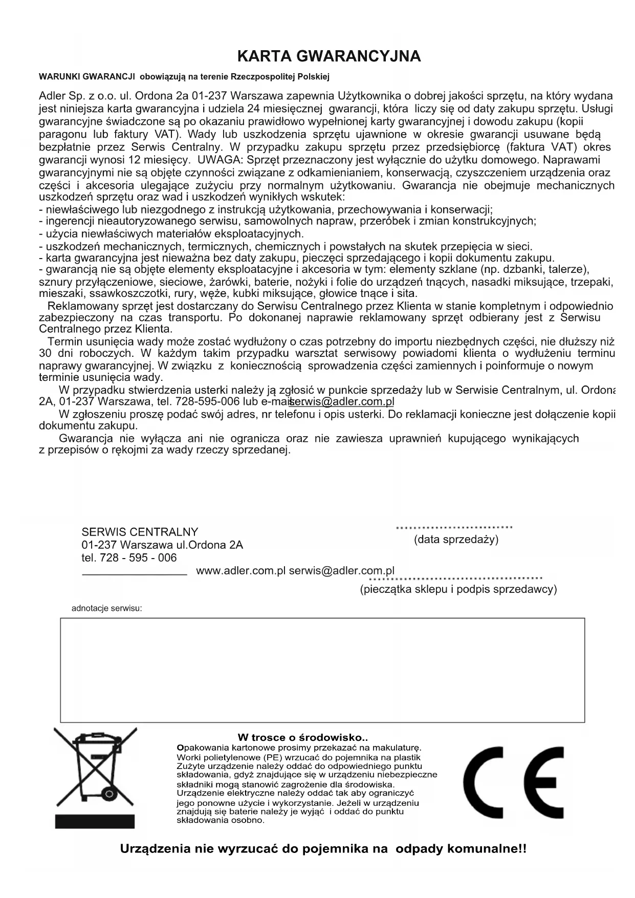 - Váhu pretierajte jemne suchou alebo mierne navlhčenou handričkou. OZNÁMENIA a – nízka úroveň nabitia batérií b – nadmerné zaťaženie váhy TECHNICKÉ ÚDAJE Napájanie: batéria typ 1 x 3 V (CR2032) Starostlivosť o životné prostredie. Kartónový obal odovzdajte do zberných surovín. Polyetylénové vrecká (PE) vyhoďte do kontajnera na plast. Opotrebený spotrebič odovzdajte na príslušný zberný dvor, nebezpečné látky spotrebiča môžu predstavovať riziko pre životné prostredie. Elektrospotrebič odstráňte tak, aby nedochádzalo j jeho ďalšiemu použitiu. Ak sa v spotrebiči nachádzajú batérie, vyberte ich a odovzdajte ich na zberné miesto osobitne. Spotrebič nevyhadzujte do kontajnera na komunálny odpad!KARTA GWARANCYJNA WARUNKI GWARANCJI obowiązują na terenie Rzeczpospolitej Polskiej Adler Sp. z o.o. ul. Ordona 2a 01-237 Warszawa zapewnia Użytkownika o dobrej jakości sprzętu, na który wydana jest niniejsza karta gwarancyjna i udziela 24 miesięcznej gwarancji, która liczy się od daty zakupu sprzętu. Usługi gwarancyjne świadczone są po okazaniu prawidłowo wypełnionej karty gwarancyjnej i dowodu zakupu (kopii paragonu lub faktury VAT). Wady lub uszkodzenia sprzętu ujawnione w okresie gwarancji usuwane będą bezpłatnie przez Serwis Centralny. W przypadku zakupu sprzętu przez przedsiębiorcę (faktura VAT) okres gwarancji wynosi 12 miesięcy. UWAGA: Sprzęt przeznaczony jest wyłącznie do użytku domowego. Naprawami gwarancyjnymi nie są objęte czynności związane z odkamienianiem, konserwacją, czyszczeniem urządzenia oraz części i akcesoria ulegające zużyciu przy normalnym użytkowaniu. Gwarancja nie obejmuje mechanicznych uszkodzeń sprzętu oraz wad i uszkodzeń wynikłych wskutek: - niewłaściwego lub niezgodnego z instrukcją użytkowania, przechowywania i konserwacji; - ingerencji nieautoryzowanego serwisu, samowolnych napraw, przeróbek i zmian konstrukcyjnych; - użycia niewłaściwych materiałów eksploatacyjnych. - uszkodzeń mechanicznych, termicznych, chemicznych i powstałych na skutek przepięcia w sieci. - karta gwarancyjna jest nieważna bez daty zakupu, pieczęci sprzedającego i kopii dokumentu zakupu. - gwarancją nie są objęte elementy eksploatacyjne i akcesoria w tym: elementy szklane (np. dzbanki, talerze), sznury przyłączeniowe, sieciowe, żarówki, baterie, nożyki i folie do urządzeń tnących, nasadki miksujące, trzepaki, mieszaki, ssawkoszczotki, rury, węże, kubki miksujące, głowice tnące i sita. Reklamowany sprzęt jest dostarczany do Serwisu Centralnego przez Klienta w stanie kompletnym i odpowiednio zabezpieczony na czas transportu. Po dokonanej naprawie reklamowany sprzęt odbierany jest z Serwisu Centralnego przez Klienta. Termin usunięcia wady może zostać wydłużony o czas potrzebny do importu niezbędnych części, nie dłuższy niż 30 dni roboczych. W każdym takim przypadku warsztat serwisowy powiadomi klienta o wydłużeniu terminu naprawy gwarancyjnej. W związku z koniecznością sprowadzenia części zamiennych i poinformuje o nowym terminie usunięcia wady. W przypadku stwierdzenia usterki należy ją zgłosić w punkcie sprzedaży lub w Serwisie Centralnym, ul. Ordona 2A, 01-237 Warszawa, tel. 728-595-006 lub e-mail: . W zgłoszeniu proszę podać swój adres, nr telefonu i opis usterki. Do reklamacji konieczne jest dołączenie kopii dokumentu zakupu. Gwarancja nie wyłącza ani nie ogranicza oraz nie zawiesza uprawnień kupującego wynikających z przepisów o rękojmi za wady rzeczy sprzedanej. serwis@adler.com.pl SERWIS CENTRALNY 01-237 Warszawa ul.Ordona 2A tel. 728 - 595 - 006 www.adler.com.pl serwis@adler.com.pl (data sprzedaży) (pieczątka sklepu i podpis sprzedawcy) adnotacje serwisu: Urządzenia nie wyrzucać do pojemnika na odpady komunalne!!