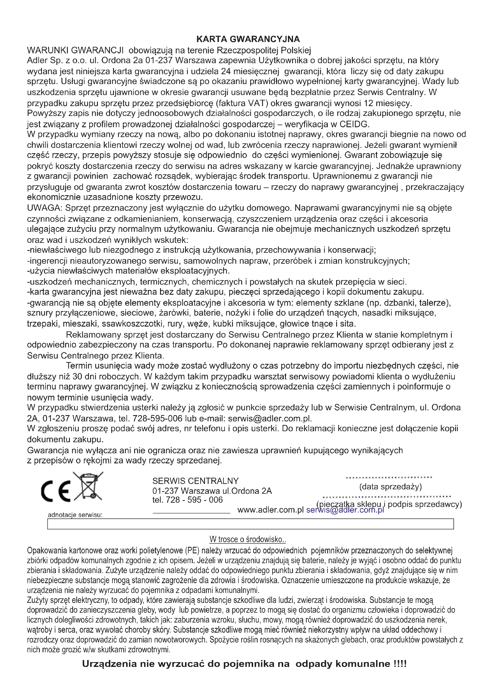 Për të mbrojtur mjedisin: ndani kartonat dhe qeset plastike dhe vendosini në kontejnerët e duhur të mbeturinave. Pajisja e përdorur duhet të dorëzohet në pika të veçanta grumbullimi që mund të ndikojnë në mjedis. Mos e hidhni këtë pajisje në mbeturina normale. KUJDES: Në varësi të madhësisë së frutave, përdorni një kon (A) për frutat më të vegjël dhe një kon (B) për frutat më të mëdhenj.32 -uszkodzeń mechanicznych, termicznych, chemicznych i powstałych na skutek przepięcia w sieci. -karta gwarancyjna jest nieważna bez daty zakupu, pieczęci sprzedającego i kopii dokumentu zakupu. -gwarancją nie są objęte elementy eksploatacyjne i akcesoria w tym: elementy szklane (np. dzbanki, talerze), sznury przyłączeniowe, sieciowe, żarówki, baterie, nożyki i folie do urządzeń tnących, nasadki miksujące, trzepaki, mieszaki, ssawkoszczotki, rury, węże, kubki miksujące, głowice tnące i sita. Reklamowany sprzęt jest dostarczany do Serwisu Centralnego przez Klienta w stanie kompletnym i odpowiednio zabezpieczony na czas transportu. Po dokonanej naprawie reklamowany sprzęt odbierany jest z Serwisu Centralnego przez Klienta. UWAGA: Sprzęt przeznaczony jest wyłącznie do użytku domowego. Naprawami gwarancyjnymi nie są objęte czynności związane z odkamienianiem, konserwacją, czyszczeniem urządzenia oraz części i akcesoria ulegające zużyciu przy normalnym użytkowaniu. Gwarancja nie obejmuje mechanicznych uszkodzeń sprzętu oraz wad i uszkodzeń wynikłych wskutek: Termin usunięcia wady może zostać wydłużony o czas potrzebny do importu niezbędnych części, nie dłuższy niż 30 dni roboczych. W każdym takim przypadku warsztat serwisowy powiadomi klienta o wydłużeniu terminu naprawy gwarancyjnej. W związku z koniecznością sprowadzenia części zamiennych i poinformuje o nowym terminie usunięcia wady. W zgłoszeniu proszę podać swój adres, nr telefonu i opis usterki. Do reklamacji konieczne jest dołączenie kopii dokumentu zakupu. -niewłaściwego lub niezgodnego z instrukcją użytkowania, przechowywania i konserwacji; W przypadku stwierdzenia usterki należy ją zgłosić w punkcie sprzedaży lub w Serwisie Centralnym, ul. Ordona 2A, 01-237 Warszawa, tel. 728-595-006 lub e-mail: serwis@adler.com.pl. Adler Sp. z o.o. ul. Ordona 2a 01-237 Warszawa zapewnia Użytkownika o dobrej jakości sprzętu, na który wydana jest niniejsza karta gwarancyjna i udziela 24 miesięcznej gwarancji, która liczy się od daty zakupu sprzętu. Usługi gwarancyjne świadczone są po okazaniu prawidłowo wypełnionej karty gwarancyjnej. Wady lub uszkodzenia sprzętu ujawnione w okresie gwarancji usuwane będą bezpłatnie przez Serwis Centralny. W przypadku zakupu sprzętu przez przedsiębiorcę (faktura VAT) okres gwarancji wynosi 12 miesięcy. z przepisów o rękojmi za wady rzeczy sprzedanej. KARTA GWARANCYJNA Gwarancja nie wyłącza ani nie ogranicza oraz nie zawiesza uprawnień kupującego wynikających -użycia niewłaściwych materiałów eksploatacyjnych. Powyższy zapis nie dotyczy jednoosobowych działalności gospodarczych, o ile rodzaj zakupionego sprzętu, nie jest związany z profilem prowadzonej działalności gospodarczej – weryfikacja w CEIDG. WARUNKI GWARANCJI obowiązują na terenie Rzeczpospolitej Polskiej W przypadku wymiany rzeczy na nową, albo po dokonaniu istotnej naprawy, okres gwarancji biegnie na nowo od chwili dostarczenia klientowi rzeczy wolnej od wad, lub zwrócenia rzeczy naprawionej. Jeżeli gwarant wymienił część rzeczy, przepis powyższy stosuje się odpowiednio do części wymienionej. Gwarant zobowiązuje się pokryć koszty dostarczenia rzeczy do serwisu na adres wskazany w karcie gwarancyjnej. Jednakże uprawniony z gwarancji powinien zachować rozsądek, wybierając środek transportu. Uprawnionemu z gwarancji nie przysługuje od gwaranta zwrot kosztów dostarczenia towaru – rzeczy do naprawy gwarancyjnej , przekraczający ekonomicznie uzasadnione koszty przewozu. -ingerencji nieautoryzowanego serwisu, samowolnych napraw, przeróbek i zmian konstrukcyjnych; SERWIS CENTRALNY 01-237 Warszawa ul.Ordona 2A tel. 728 - 595 - 006 www.adler.com.pl serwis@adler.com.pl (data sprzedaży) (pieczątka sklepu i podpis sprzedawcy) adnotacje serwisu: Urządzenia nie wyrzucać do pojemnika na odpady komunalne !!!! W trosce o środowisko.. Zużyty sprzęt elektryczny, to odpady, które zawierają substancje szkodliwe dla ludzi, zwierząt i środowiska. Substancje te mogą doprowadzić do zanieczyszczenia gleby, wody lub powietrze, a poprzez to mogą się dostać do organizmu człowieka i doprowadzić do licznych dolegliwości zdrowotnych, takich jak: zaburzenia wzroku, słuchu, mowy, mogą również doprowadzić do uszkodzenia nerek, wątroby i serca, oraz wywołać choroby skóry. Substancje szkodliwe mogą mieć również niekorzystny wpływ na układ oddechowy i rozrodczy oraz doprowadzić do zamian nowotworowych. Spożycie roślin rosnących na skażonych glebach, oraz produktów powstałych z nich może grozić w/w skutkami zdrowotnymi. Opakowania kartonowe oraz worki polietylenowe (PE) należy wrzucać do odpowiednich pojemników przeznaczonych do selektywnej zbiórki odpadów komunalnych zgodnie z ich opisem. Jeżeli w urządzeniu znajdują się baterie, należy je wyjąć i osobno oddać do punktu zbierania i składowania. Zużyte urządzenie należy oddać do odpowiedniego punktu zbierania i składowania, gdyż znajdujące się w nim niebezpieczne substancje mogą stanowić zagrożenie dla zdrowia i środowiska. Oznaczenie umieszczone na produkcie wskazuje, że urządzenia nie należy wyrzucać do pojemnika z odpadami komunalnymi.OGÓLNE WARUNKI BEZPIECZEŃSTWA WAŻNE INSTRUKCJE DOTYCZĄCE BEZPIECZEŃSTWA UŻYTKOWANIA PRZECZYTAJ UWAŻNIE I ZACHOWAJ NA PRZYSZŁOŚĆ POLSKI