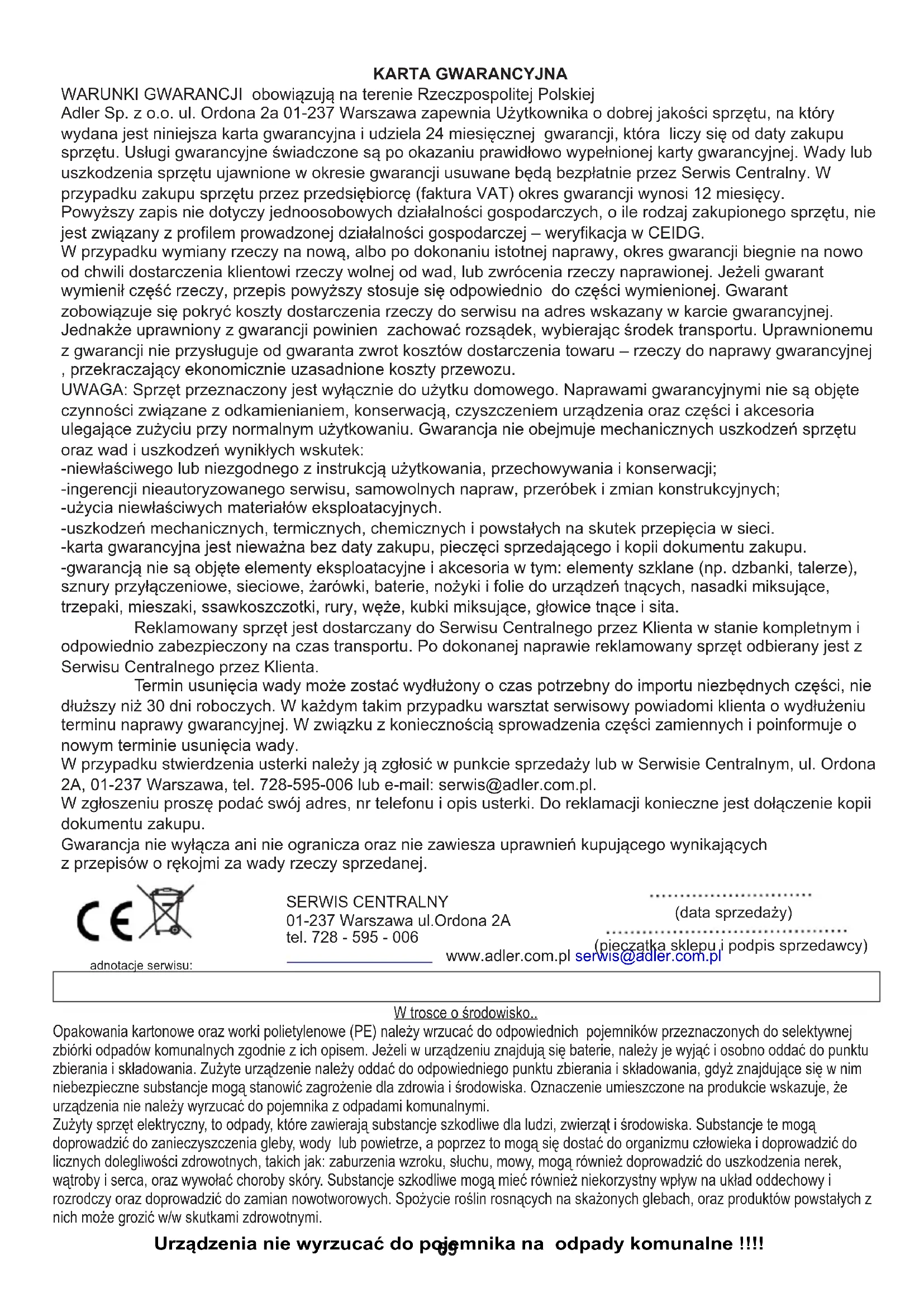 KARTA GWARANCYJNA WARUNKI GWARANCJI obowiązują na terenie Rzeczpospolitej Polskiej Adler Sp. z o.o. ul. Ordona 2a 01-237 Warszawa zapewnia Użytkownika o dobrej jakości sprzętu, na który wydana jest niniejsza karta gwarancyjna i udziela 24 miesięcznej gwarancji, która liczy się od daty zakupu sprzętu. Usługi gwarancyjne świadczone są po okazaniu prawidłowo wypełnionej karty gwarancyjnej. Wady lub uszkodzenia sprzętu ujawnione w okresie gwarancji usuwane będą bezpłatnie przez Serwis Centralny. W przypadku zakupu sprzętu przez przedsiębiorcę (faktura VAT) okres gwarancji wynosi 12 miesięcy. -użycia niewłaściwych materiałów eksploatacyjnych. -gwarancją nie są objęte elementy eksploatacyjne i akcesoria w tym: elementy szklane (np. dzbanki, talerze), sznury przyłączeniowe, sieciowe, żarówki, baterie, nożyki i folie do urządzeń tnących, nasadki miksujące, trzepaki, mieszaki, ssawkoszczotki, rury, węże, kubki miksujące, głowice tnące i sita. W przypadku stwierdzenia usterki należy ją zgłosić w punkcie sprzedaży lub w Serwisie Centralnym, ul. Ordona 2A, 01-237 Warszawa, tel. 728-595-006 lub e-mail: serwis@adler.com.pl. UWAGA: Sprzęt przeznaczony jest wyłącznie do użytku domowego. Naprawami gwarancyjnymi nie są objęte czynności związane z odkamienianiem, konserwacją, czyszczeniem urządzenia oraz części i akcesoria ulegające zużyciu przy normalnym użytkowaniu. Gwarancja nie obejmuje mechanicznych uszkodzeń sprzętu oraz wad i uszkodzeń wynikłych wskutek: Powyższy zapis nie dotyczy jednoosobowych działalności gospodarczych, o ile rodzaj zakupionego sprzętu, nie jest związany z profilem prowadzonej działalności gospodarczej – weryfikacja w CEIDG. Reklamowany sprzęt jest dostarczany do Serwisu Centralnego przez Klienta w stanie kompletnym i odpowiednio zabezpieczony na czas transportu. Po dokonanej naprawie reklamowany sprzęt odbierany jest z Serwisu Centralnego przez Klienta. -ingerencji nieautoryzowanego serwisu, samowolnych napraw, przeróbek i zmian konstrukcyjnych; -uszkodzeń mechanicznych, termicznych, chemicznych i powstałych na skutek przepięcia w sieci. W przypadku wymiany rzeczy na nową, albo po dokonaniu istotnej naprawy, okres gwarancji biegnie na nowo od chwili dostarczenia klientowi rzeczy wolnej od wad, lub zwrócenia rzeczy naprawionej. Jeżeli gwarant wymienił część rzeczy, przepis powyższy stosuje się odpowiednio do części wymienionej. Gwarant zobowiązuje się pokryć koszty dostarczenia rzeczy do serwisu na adres wskazany w karcie gwarancyjnej. Jednakże uprawniony z gwarancji powinien zachować rozsądek, wybierając środek transportu. Uprawnionemu z gwarancji nie przysługuje od gwaranta zwrot kosztów dostarczenia towaru – rzeczy do naprawy gwarancyjnej , przekraczający ekonomicznie uzasadnione koszty przewozu. -karta gwarancyjna jest nieważna bez daty zakupu, pieczęci sprzedającego i kopii dokumentu zakupu. W zgłoszeniu proszę podać swój adres, nr telefonu i opis usterki. Do reklamacji konieczne jest dołączenie kopii dokumentu zakupu. z przepisów o rękojmi za wady rzeczy sprzedanej. Gwarancja nie wyłącza ani nie ogranicza oraz nie zawiesza uprawnień kupującego wynikających -niewłaściwego lub niezgodnego z instrukcją użytkowania, przechowywania i konserwacji; Termin usunięcia wady może zostać wydłużony o czas potrzebny do importu niezbędnych części, nie dłuższy niż 30 dni roboczych. W każdym takim przypadku warsztat serwisowy powiadomi klienta o wydłużeniu terminu naprawy gwarancyjnej. W związku z koniecznością sprowadzenia części zamiennych i poinformuje o nowym terminie usunięcia wady. SERWIS CENTRALNY01-237 Warszawa ul.Ordona 2Atel. 728 - 595 - 006 www.adler.com.pl serwis@adler.com.pl(data sprzedaży)(pieczątka sklepu i podpis sprzedawcy)adnotacje serwisu: Urządzenia nie wyrzucać do pojemnika na odpady komunalne !!!! Zużyty sprzęt elektryczny, to odpady, które zawierają substancje szkodliwe dla ludzi, zwierząt i środowiska. Substancje te mogą doprowadzić do zanieczyszczenia gleby, wody lub powietrze, a poprzez to mogą się dostać do organizmu człowieka i doprowadzić do licznych dolegliwości zdrowotnych, takich jak: zaburzenia wzroku, słuchu, mowy, mogą również doprowadzić do uszkodzenia nerek, wątroby i serca, oraz wywołać choroby skóry. Substancje szkodliwe mogą mieć również niekorzystny wpływ na układ oddechowy i rozrodczy oraz doprowadzić do zamian nowotworowych. Spożycie roślin rosnących na skażonych glebach, oraz produktów powstałych z nich może grozić w/w skutkami zdrowotnymi. Opakowania kartonowe oraz worki polietylenowe (PE) należy wrzucać do odpowiednich pojemników przeznaczonych do selektywnej zbiórki odpadów komunalnych zgodnie z ich opisem. Jeżeli w urządzeniu znajdują się baterie, należy je wyjąć i osobno oddać do punktu zbierania i składowania. Zużyte urządzenie należy oddać do odpowiedniego punktu zbierania i składowania, gdyż znajdujące się w nim niebezpieczne substancje mogą stanowić zagrożenie dla zdrowia i środowiska. Oznaczenie umieszczone na produkcie wskazuje, że urządzenia nie należy wyrzucać do pojemnika z odpadami komunalnymi. W trosce o środowisko..70 POLSKI
