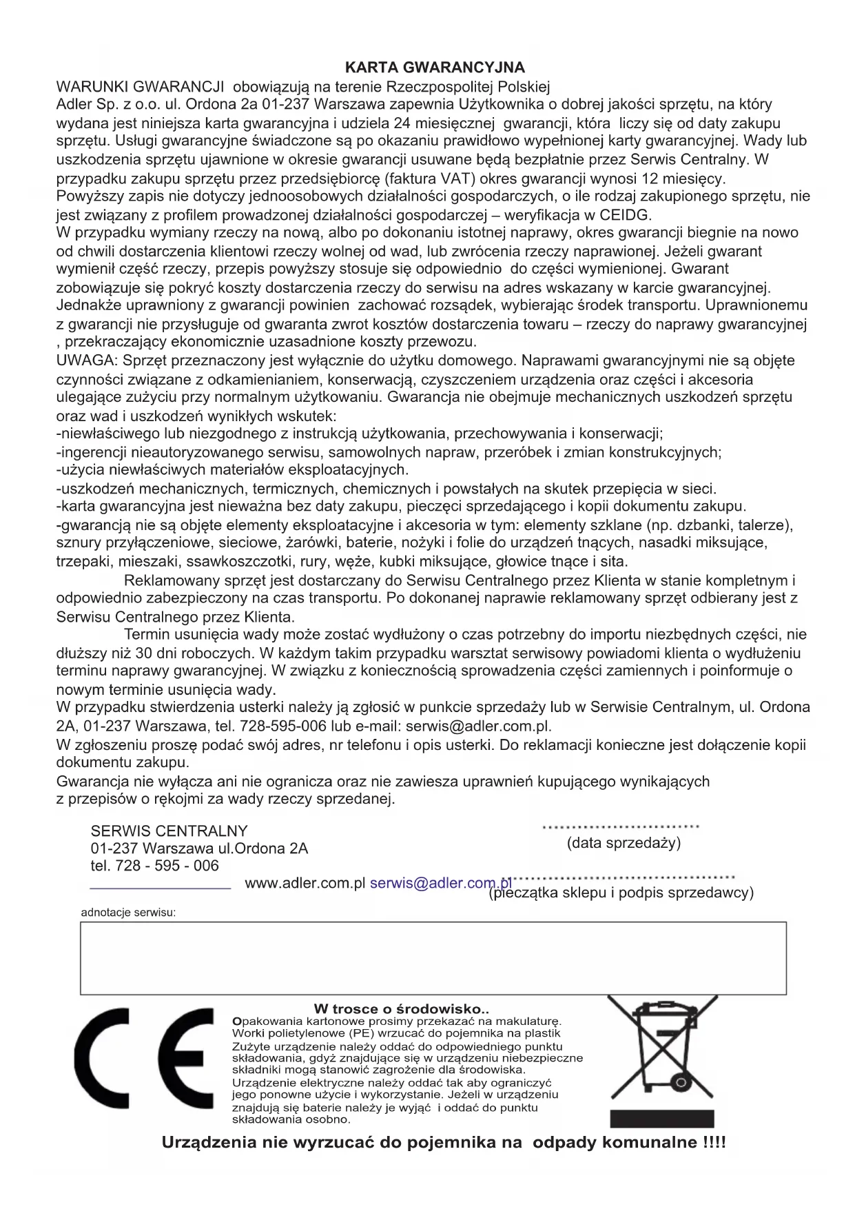 За да защитите околната си среда: моля, отделете картонените кутии и найлоновите торбички и ги изхвърлете в съответните кошчета за отпадъци. Използваният уред трябва да бъде доставен до специалните пунктове за събиране, които могат да повлияят на околната среда. Не изхвърляйте този уред в обикновен кош за отпадъци.-ingerencji nieautoryzowanego serwisu, samowolnych napraw, przeróbek i zmian konstrukcyjnych; -użycia niewłaściwych materiałów eksploatacyjnych. -uszkodzeń mechanicznych, termicznych, chemicznych i powstałych na skutek przepięcia w sieci. W przypadku wymiany rzeczy na nową, albo po dokonaniu istotnej naprawy, okres gwarancji biegnie na nowo od chwili dostarczenia klientowi rzeczy wolnej od wad, lub zwrócenia rzeczy naprawionej. Jeżeli gwarant wymienił część rzeczy, przepis powyższy stosuje się odpowiednio do części wymienionej. Gwarant zobowiązuje się pokryć koszty dostarczenia rzeczy do serwisu na adres wskazany w karcie gwarancyjnej. Jednakże uprawniony z gwarancji powinien zachować rozsądek, wybierając środek transportu. Uprawnionemu z gwarancji nie przysługuje od gwaranta zwrot kosztów dostarczenia towaru – rzeczy do naprawy gwarancyjnej , przekraczający ekonomicznie uzasadnione koszty przewozu. UWAGA: Sprzęt przeznaczony jest wyłącznie do użytku domowego. Naprawami gwarancyjnymi nie są objęte czynności związane z odkamienianiem, konserwacją, czyszczeniem urządzenia oraz części i akcesoria ulegające zużyciu przy normalnym użytkowaniu. Gwarancja nie obejmuje mechanicznych uszkodzeń sprzętu oraz wad i uszkodzeń wynikłych wskutek: -niewłaściwego lub niezgodnego z instrukcją użytkowania, przechowywania i konserwacji; Adler Sp. z o.o. ul. Ordona 2a 01-237 Warszawa zapewnia Użytkownika o dobrej jakości sprzętu, na który wydana jest niniejsza karta gwarancyjna i udziela 24 miesięcznej gwarancji, która liczy się od daty zakupu sprzętu. Usługi gwarancyjne świadczone są po okazaniu prawidłowo wypełnionej karty gwarancyjnej. Wady lub uszkodzenia sprzętu ujawnione w okresie gwarancji usuwane będą bezpłatnie przez Serwis Centralny. W przypadku zakupu sprzętu przez przedsiębiorcę (faktura VAT) okres gwarancji wynosi 12 miesięcy. WARUNKI GWARANCJI obowiązują na terenie Rzeczpospolitej Polskiej Powyższy zapis nie dotyczy jednoosobowych działalności gospodarczych, o ile rodzaj zakupionego sprzętu, nie jest związany z profilem prowadzonej działalności gospodarczej – weryfikacja w CEIDG. KARTA GWARANCYJNA W zgłoszeniu proszę podać swój adres, nr telefonu i opis usterki. Do reklamacji konieczne jest dołączenie kopii dokumentu zakupu. -karta gwarancyjna jest nieważna bez daty zakupu, pieczęci sprzedającego i kopii dokumentu zakupu. Gwarancja nie wyłącza ani nie ogranicza oraz nie zawiesza uprawnień kupującego wynikających z przepisów o rękojmi za wady rzeczy sprzedanej. -gwarancją nie są objęte elementy eksploatacyjne i akcesoria w tym: elementy szklane (np. dzbanki, talerze), sznury przyłączeniowe, sieciowe, żarówki, baterie, nożyki i folie do urządzeń tnących, nasadki miksujące, trzepaki, mieszaki, ssawkoszczotki, rury, węże, kubki miksujące, głowice tnące i sita. Reklamowany sprzęt jest dostarczany do Serwisu Centralnego przez Klienta w stanie kompletnym i odpowiednio zabezpieczony na czas transportu. Po dokonanej naprawie reklamowany sprzęt odbierany jest z Serwisu Centralnego przez Klienta. Termin usunięcia wady może zostać wydłużony o czas potrzebny do importu niezbędnych części, nie dłuższy niż 30 dni roboczych. W każdym takim przypadku warsztat serwisowy powiadomi klienta o wydłużeniu terminu naprawy gwarancyjnej. W związku z koniecznością sprowadzenia części zamiennych i poinformuje o nowym terminie usunięcia wady. W przypadku stwierdzenia usterki należy ją zgłosić w punkcie sprzedaży lub w Serwisie Centralnym, ul. Ordona 2A, 01-237 Warszawa, tel. 728-595-006 lub e-mail: serwis@adler.com.pl. SERWIS CENTRALNY 01-237 Warszawa ul.Ordona 2A tel. 728 - 595 - 006 www.adler.com.pl serwis@adler.com.pl (data sprzedaży) (pieczątka sklepu i podpis sprzedawcy) adnotacje serwisu: Urządzenia nie wyrzucać do pojemnika na odpady komunalne !!!! W trosce o środowisko.. Opakowania kartonowe prosimy przekazać na makulaturę.Worki polietylenowe (PE) wrzucać do pojemnika na plastikZużyte urządzenie należy oddać do odpowiedniego punktu składowania, gdyż znajdujące się w urządzeniu niebezpieczne składniki mogą stanowić zagrożenie dla środowiska. Urządzenie elektryczne należy oddać tak aby ograniczyćjego ponowne użycie i wykorzystanie. Jeżeli w urządzeniuznajdują się baterie należy je wyjąć i oddać do punktu składowania osobno.OGÓLNE WARUNKI BEZPIECZEŃSTWA WAŻNE INSTRUKCJE DOTYCZĄCE BEZPIECZEŃSTWA UŻYTKOWANIA PRZECZYTAJ UWAŻNIE I ZACHOWAJ NA PRZYSZŁOŚĆ POLSKI