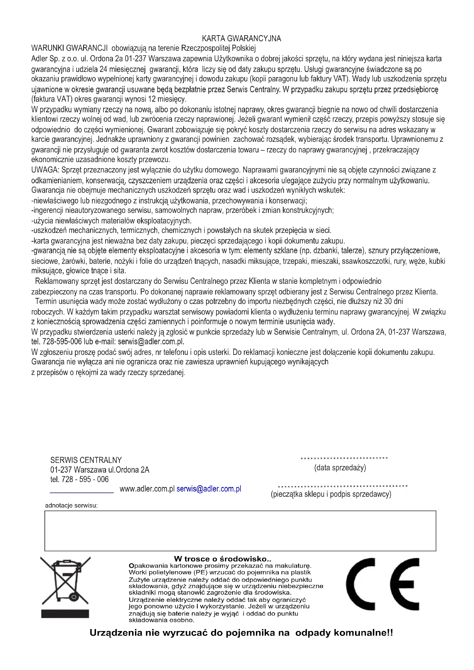 Pozor, nebezpečenstvo požiaru. NEPrepichujte ani nespaľujte. Majte na pamäti, že chladivo nemusí obsahovať zápach. Maximálne množstvo chladiva: 200 g.KARTA GWARANCYJNA WARUNKI GWARANCJI obowiązują na terenie Rzeczpospolitej Polskiej Adler Sp. z o.o. ul. Ordona 2a 01-237 Warszawa zapewnia Użytkownika o dobrej jakości sprzętu, na który wydana jest niniejsza karta gwarancyjna i udziela 24 miesięcznej gwarancji, która liczy się od daty zakupu sprzętu. Usługi gwarancyjne świadczone są po okazaniu prawidłowo wypełnionej karty gwarancyjnej i dowodu zakupu (kopii paragonu lub faktury VAT). Wady lub uszkodzenia sprzętu ujawnione w okresie gwarancji usuwane będą bezpłatnie przez Serwis Centralny. W przypadku zakupu sprzętu przez przedsiębiorcę (faktura VAT) okres gwarancji wynosi 12 miesięcy. W przypadku wymiany rzeczy na nową, albo po dokonaniu istotnej naprawy, okres gwarancji biegnie na nowo od chwili dostarczenia klientowi rzeczy wolnej od wad, lub zwrócenia rzeczy naprawionej. Jeżeli gwarant wymienił część rzeczy, przepis powyższy stosuje się odpowiednio do części wymienionej. Gwarant zobowiązuje się pokryć koszty dostarczenia rzeczy do serwisu na adres wskazany w karcie gwarancyjnej. Jednakże uprawniony z gwarancji powinien zachować rozsądek, wybierając środek transportu. Uprawnionemu z gwarancji nie przysługuje od gwaranta zwrot kosztów dostarczenia towaru – rzeczy do naprawy gwarancyjnej , przekraczający ekonomicznie uzasadnione koszty przewozu. UWAGA: Sprzęt przeznaczony jest wyłącznie do użytku domowego. Naprawami gwarancyjnymi nie są objęte czynności związane z odkamienianiem, konserwacją, czyszczeniem urządzenia oraz części i akcesoria ulegające zużyciu przy normalnym użytkowaniu. Gwarancja nie obejmuje mechanicznych uszkodzeń sprzętu oraz wad i uszkodzeń wynikłych wskutek: -niewłaściwego lub niezgodnego z instrukcją użytkowania, przechowywania i konserwacji; -ingerencji nieautoryzowanego serwisu, samowolnych napraw, przeróbek i zmian konstrukcyjnych; -użycia niewłaściwych materiałów eksploatacyjnych. -uszkodzeń mechanicznych, termicznych, chemicznych i powstałych na skutek przepięcia w sieci. -karta gwarancyjna jest nieważna bez daty zakupu, pieczęci sprzedającego i kopii dokumentu zakupu. -gwarancją nie są objęte elementy eksploatacyjne i akcesoria w tym: elementy szklane (np. dzbanki, talerze), sznury przyłączeniowe, sieciowe, żarówki, baterie, nożyki i folie do urządzeń tnących, nasadki miksujące, trzepaki, mieszaki, ssawkoszczotki, rury, węże, kubki miksujące, głowice tnące i sita. Reklamowany sprzęt jest dostarczany do Serwisu Centralnego przez Klienta w stanie kompletnym i odpowiednio zabezpieczony na czas transportu. Po dokonanej naprawie reklamowany sprzęt odbierany jest z Serwisu Centralnego przez Klienta. Termin usunięcia wady może zostać wydłużony o czas potrzebny do importu niezbędnych części, nie dłuższy niż 30 dni roboczych. W każdym takim przypadku warsztat serwisowy powiadomi klienta o wydłużeniu terminu naprawy gwarancyjnej. W związku z koniecznością sprowadzenia części zamiennych i poinformuje o nowym terminie usunięcia wady. W przypadku stwierdzenia usterki należy ją zgłosić w punkcie sprzedaży lub w Serwisie Centralnym, ul. Ordona 2A, 01-237 Warszawa, tel. 728-595-006 lub e-mail: serwis@adler.com.pl. W zgłoszeniu proszę podać swój adres, nr telefonu i opis usterki. Do reklamacji konieczne jest dołączenie kopii dokumentu zakupu. Gwarancja nie wyłącza ani nie ogranicza oraz nie zawiesza uprawnień kupującego wynikających z przepisów o rękojmi za wady rzeczy sprzedanej. SERWIS CENTRALNY 01-237 Warszawa ul.Ordona 2A tel. 728 - 595 - 006 www.adler.com.pl serwis@adler.com.pl (data sprzedaży) (pieczątka sklepu i podpis sprzedawcy) adnotacje serwisu: Urządzenia nie wyrzucać do pojemnika na odpady komunalne!! W trosce o środowisko.. Opakowania kartonowe prosimy przekazać na makulaturę.Worki polietylenowe (PE) wrzucać do pojemnika na plastikZużyte urządzenie należy oddać do odpowiedniego punktu składowania, gdyż znajdujące się w urządzeniu niebezpieczne składniki mogą stanowić zagrożenie dla środowiska. Urządzenie elektryczne należy oddać tak aby ograniczyćjego ponowne użycie i wykorzystanie. Jeżeli w urządzeniuznajdują się baterie należy je wyjąć i oddać do punktu składowania osobno.POLSKI