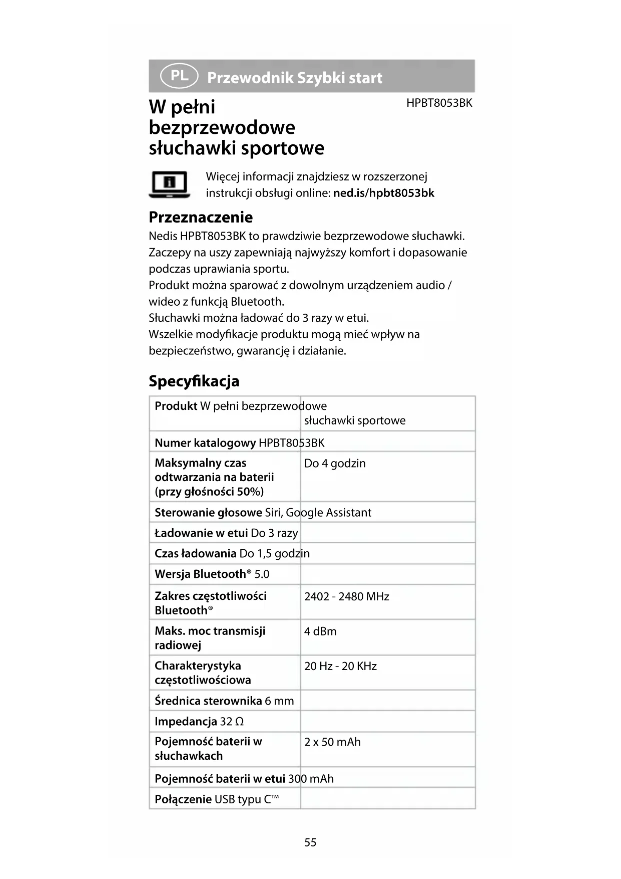 Tej funkcji zaleca się używać, gdy słuchawek nie można ze sobą połączyć w warunkach standardowego użytkowania. Deklaracja zgodności Niniejszym rma Nedis B.V. deklaruje jako producent, że produkt HPBT8053BK naszej marki Nedis®, produkowany w Chinach, został przetestowany zgodnie ze wszystkimi odpowiednimi normami i przepisami WE oraz że we wszystkich testach uzyskał on pozytywny rezultat. Obejmuje to, ale nie ogranicza się do rozporządzenia RED 2014/53/UE. Pełną deklarację zgodności (oraz kartę danych bezpieczeństwa, jeśli dotyczy) można znaleźć i pobrać tutaj: nedis.pl/hpbt8053bk#support59 Aby uzyskać dodatkowe informacje dotyczące zgodności, skontaktuj się z obsługą klienta: Strona www: www.nedis.com E-mail: service@nedis.com Nedis B.V., de Tweeling 28 5215 MC ’s-Hertogenbosch, Holandia.