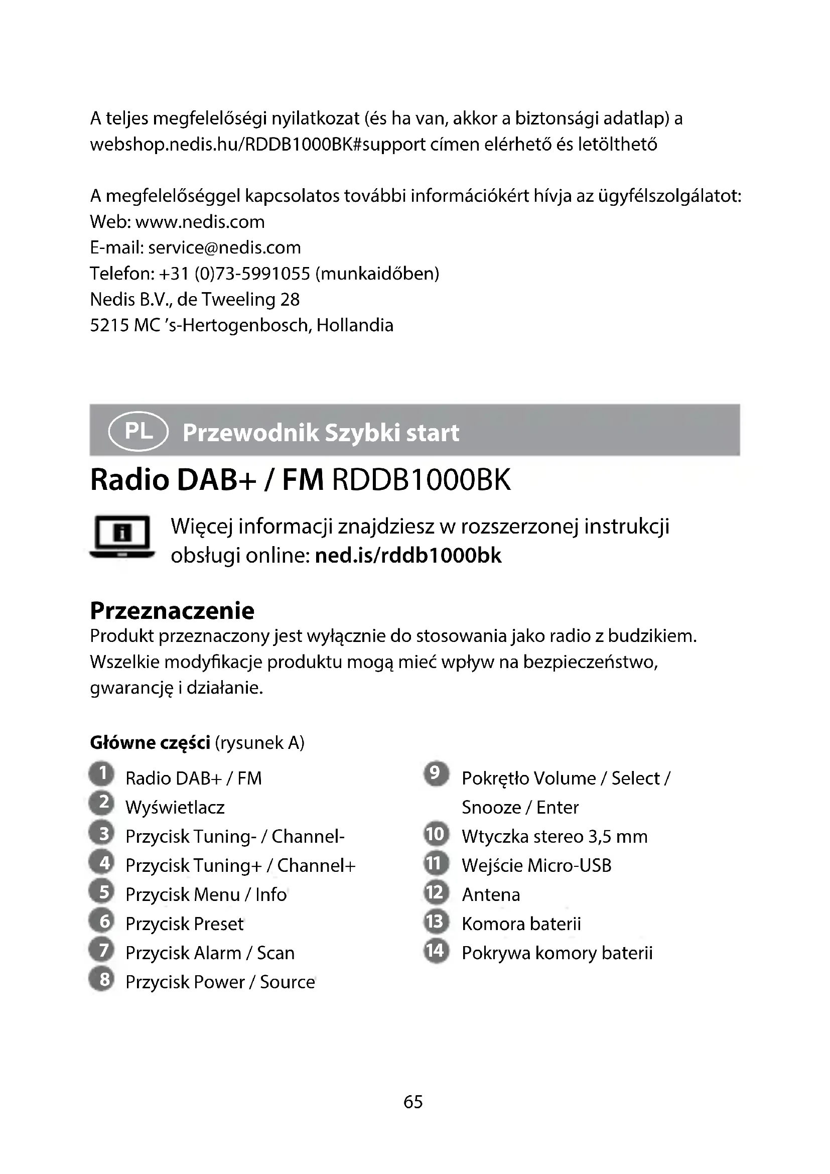 Przewodnik Szybki start Radio DAB+ / FM RDDB1000BK Więcej informacji znajdziesz w rozszerzonej instrukcji obsługi online: ned.is/rddb1000bk Przeznaczenie Produkt przeznaczony jest wyłącznie do stosowania jako radio z budzikiem. Wszelkie modykacje produktu mogą mieć wpływ na bezpieczeństwo, gwarancję i działanie. Główne części (rysunek A)