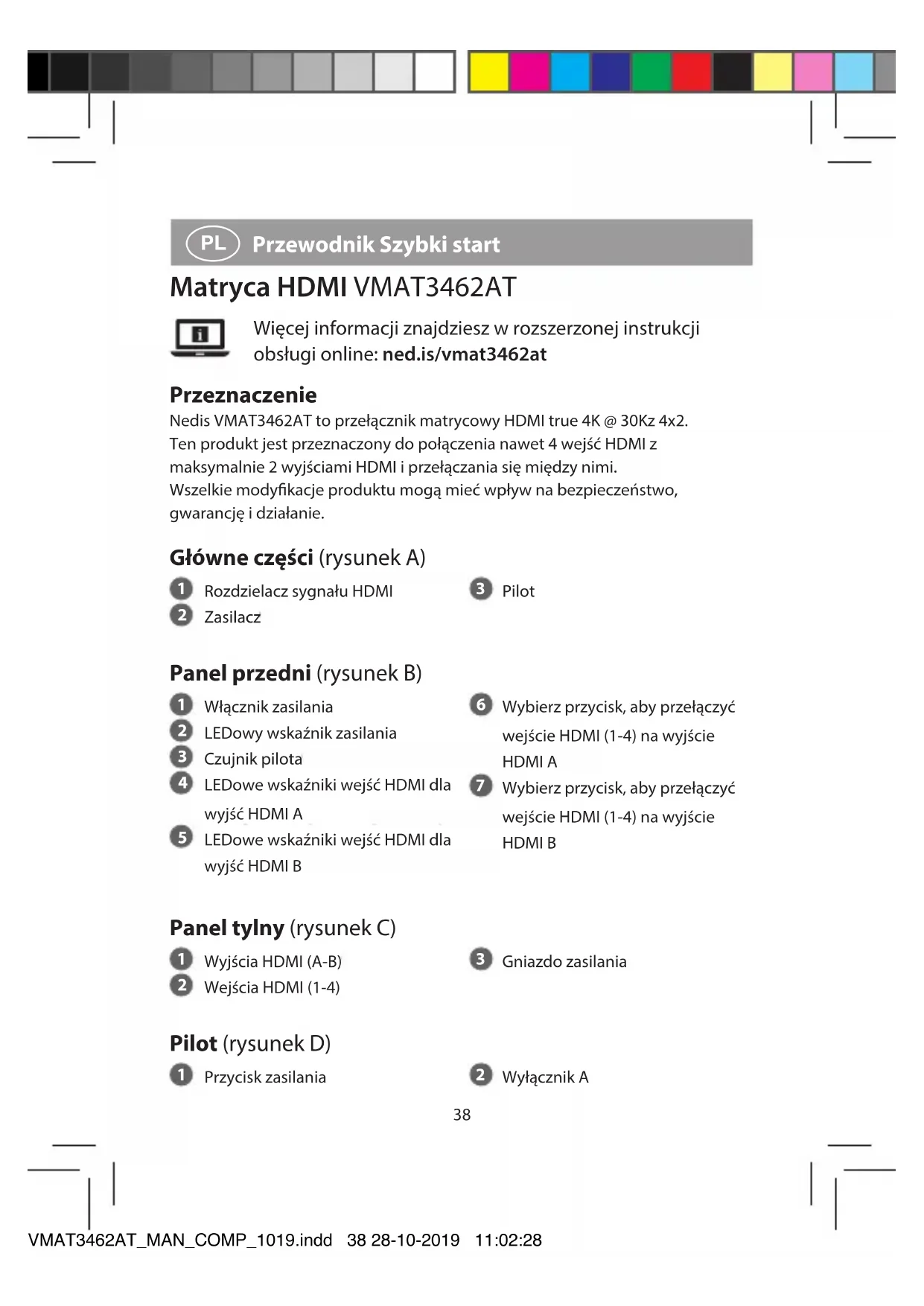 Przewodnik Szybki start Matryca HDMI VMAT3462AT Więcej informacji znajdziesz w rozszerzonej instrukcji obsługi online: ned.is/vmat3462at Przeznaczenie Nedis VMAT3462AT to przełącznik matrycowy HDMI true 4K @ 30Kz 4x2. Ten produkt jest przeznaczony do połączenia nawet 4 wejść HDMI z maksymalnie 2 wyjściami HDMI i przełączania się między nimi. Wszelkie modykacje produktu mogą mieć wpływ na bezpieczeństwo, gwarancję i działanie. Główne części (rysunek A)